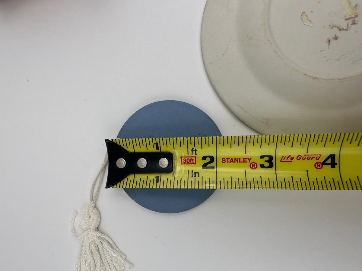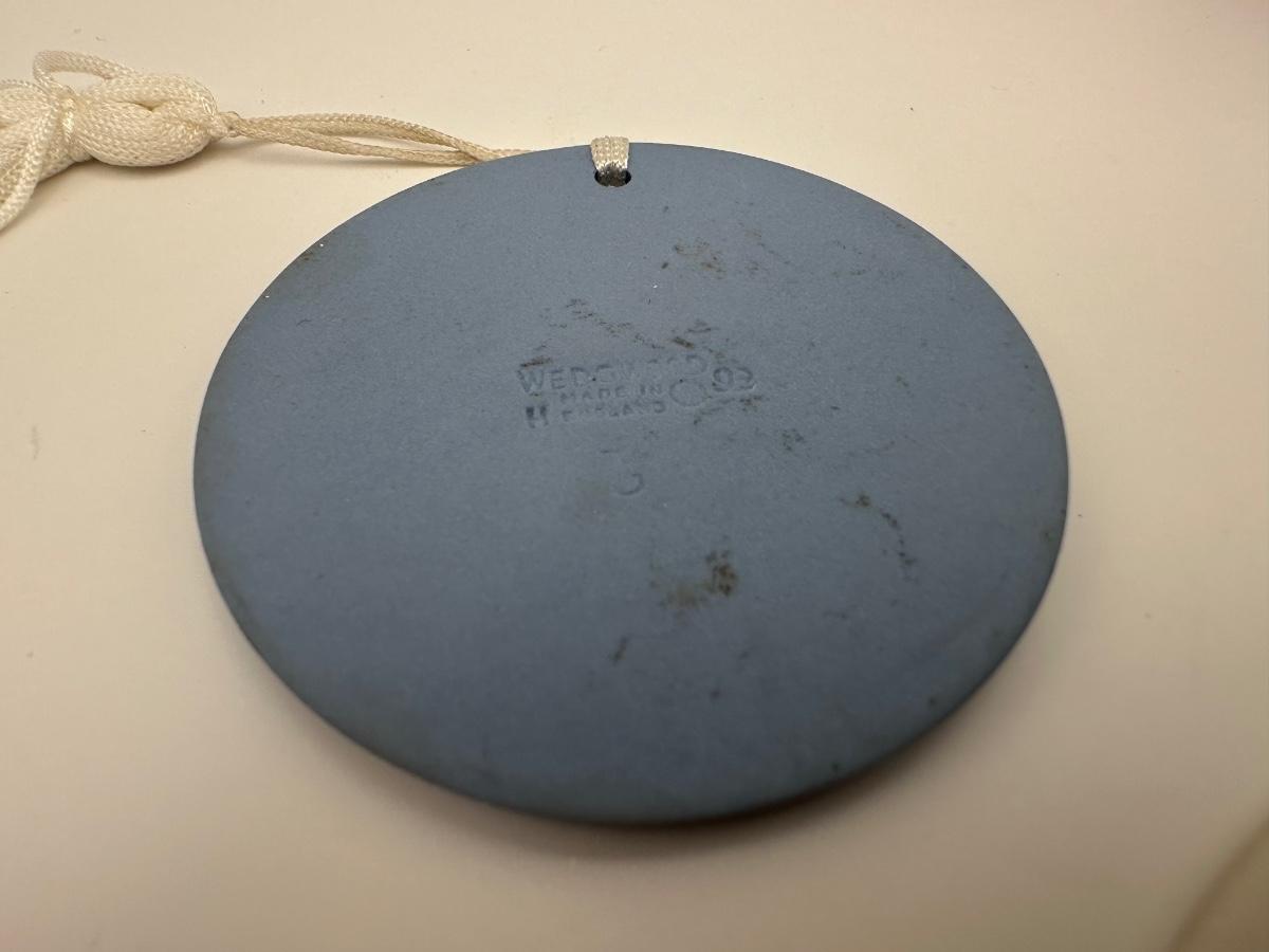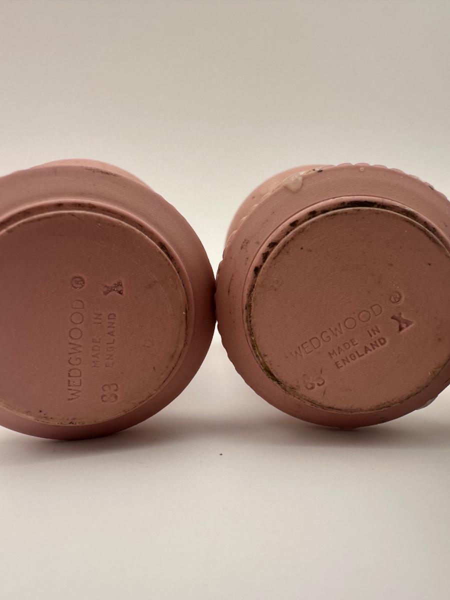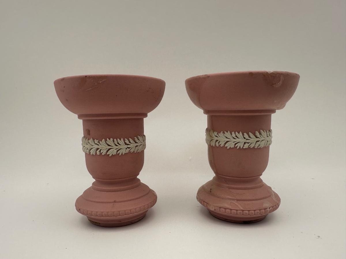 Lot of Wedgwood jasperware including blue and white ashtray, blue hanging ornament, and pair of pink candle holders with applied white decoration. Light surface wear consistent with age