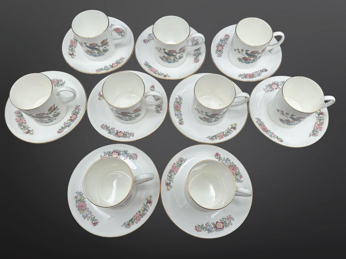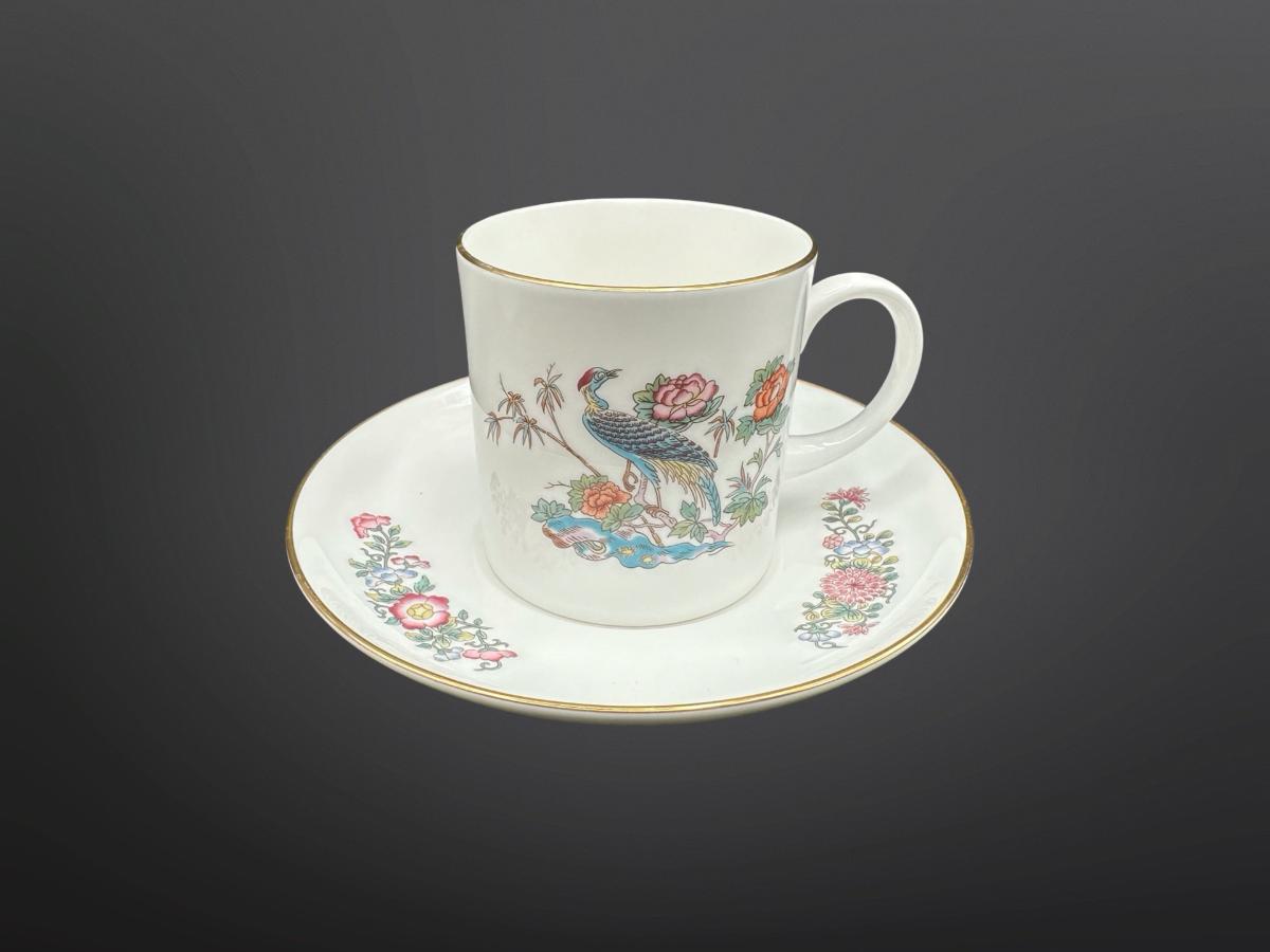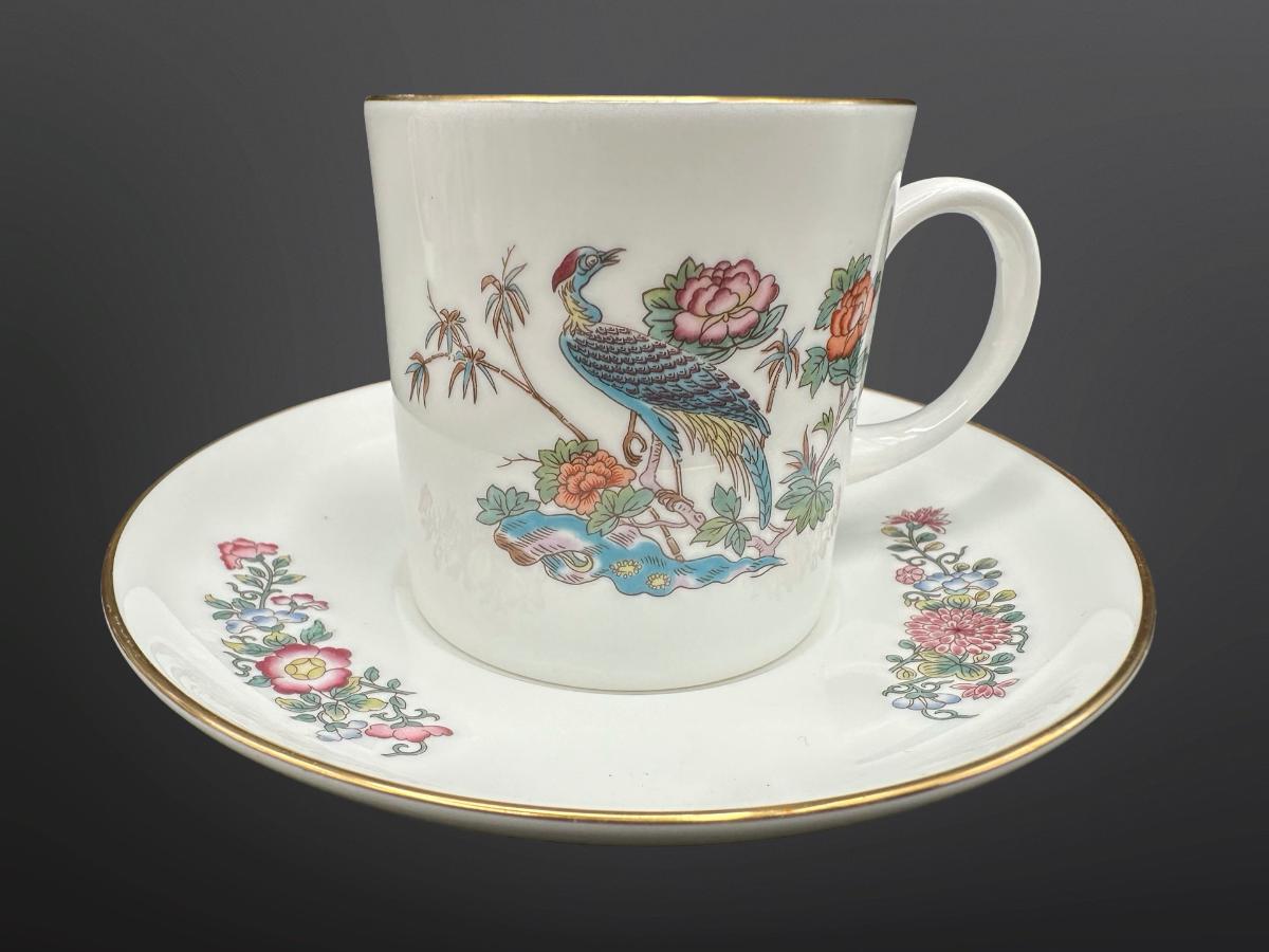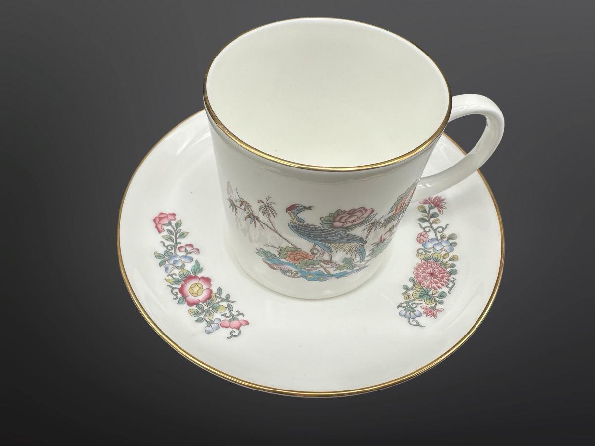 Wedgwood Kutani Crane teacups and saucers, a bone china pattern created in the 1971.