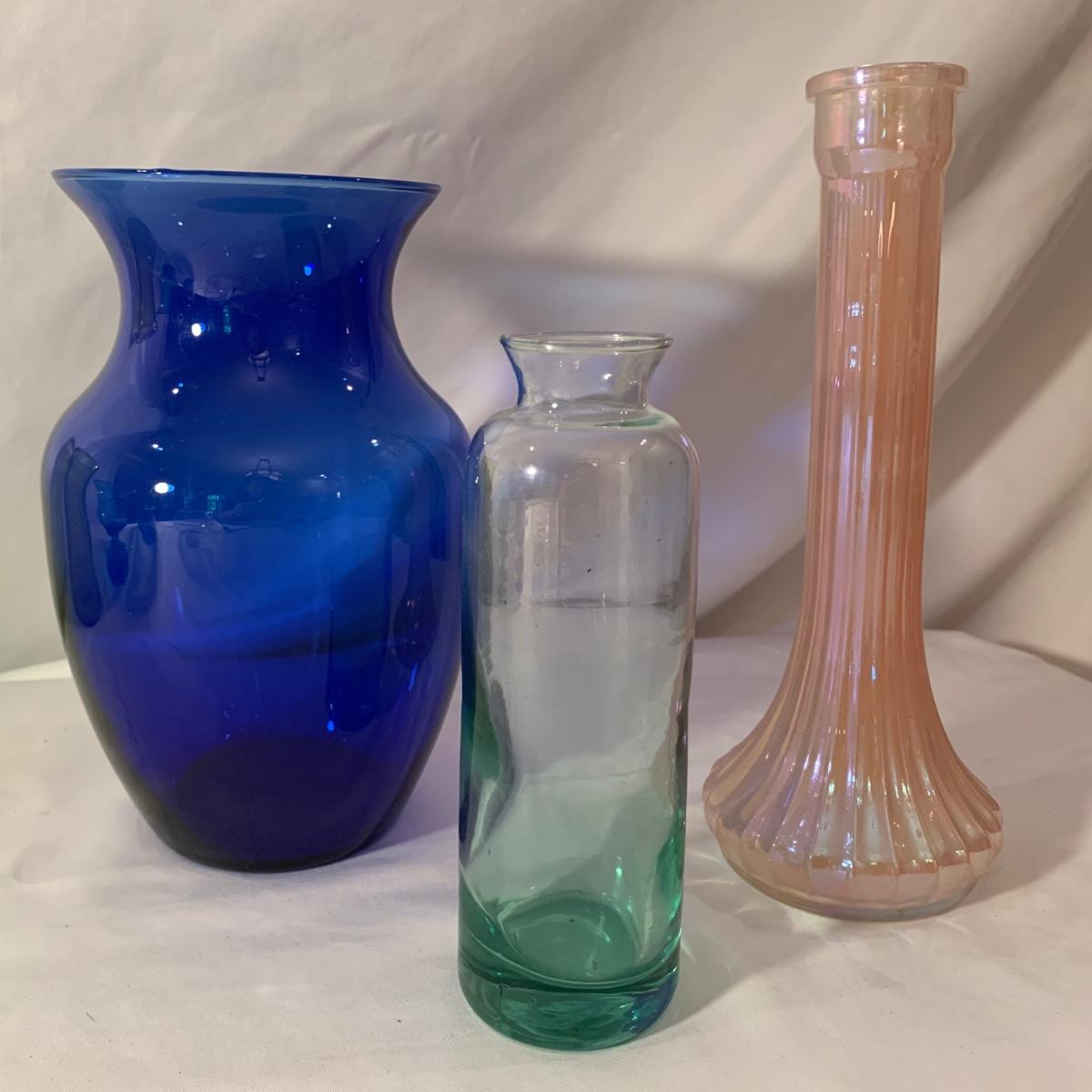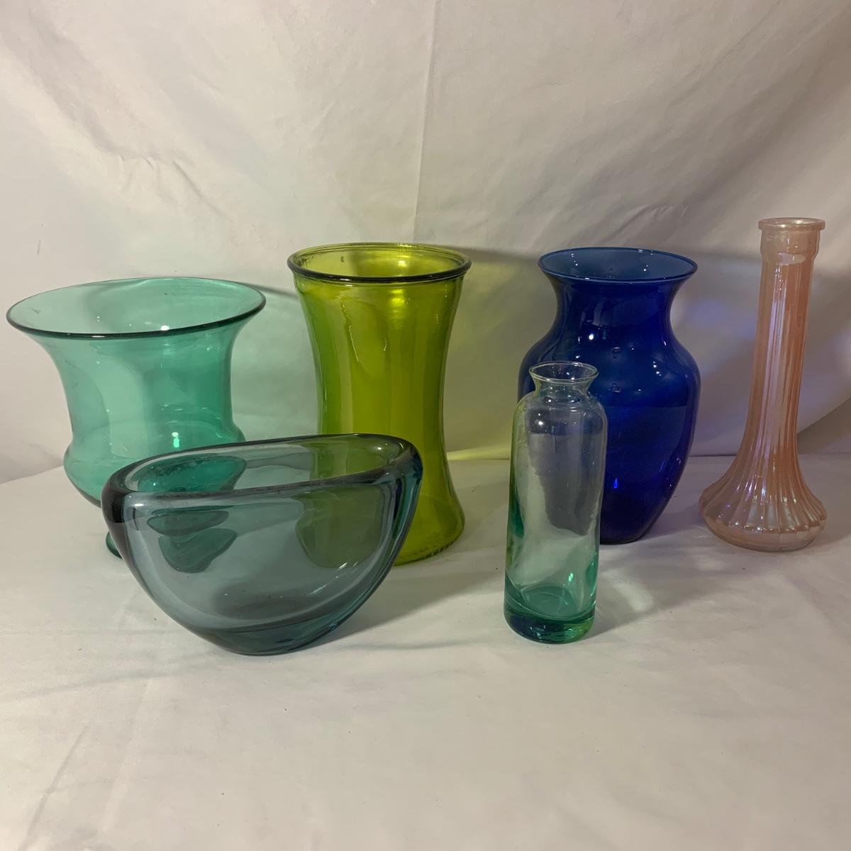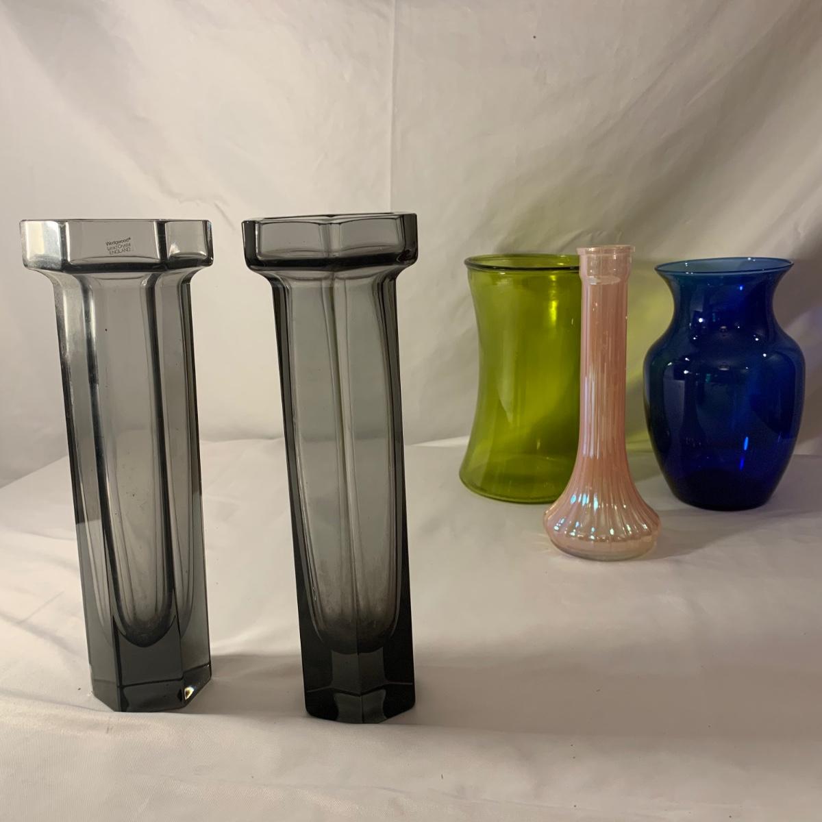 Lovely assortment of vases includes two Wedgwood Lead Crystal England vases and seven other glass vases of varying colors. Wedgwood vases have been chipped but remain intact. For reference, the Wedgwood vases measure approximately 3” at the top opening and 10”H. Please see photos for more details. Shipping available.