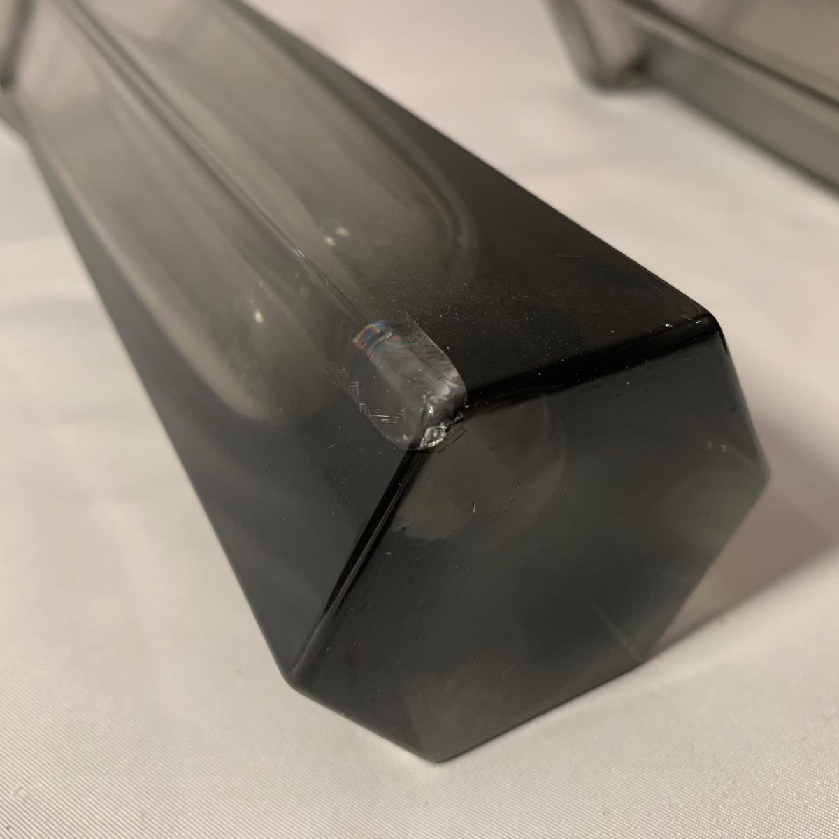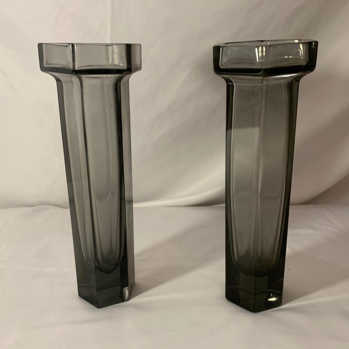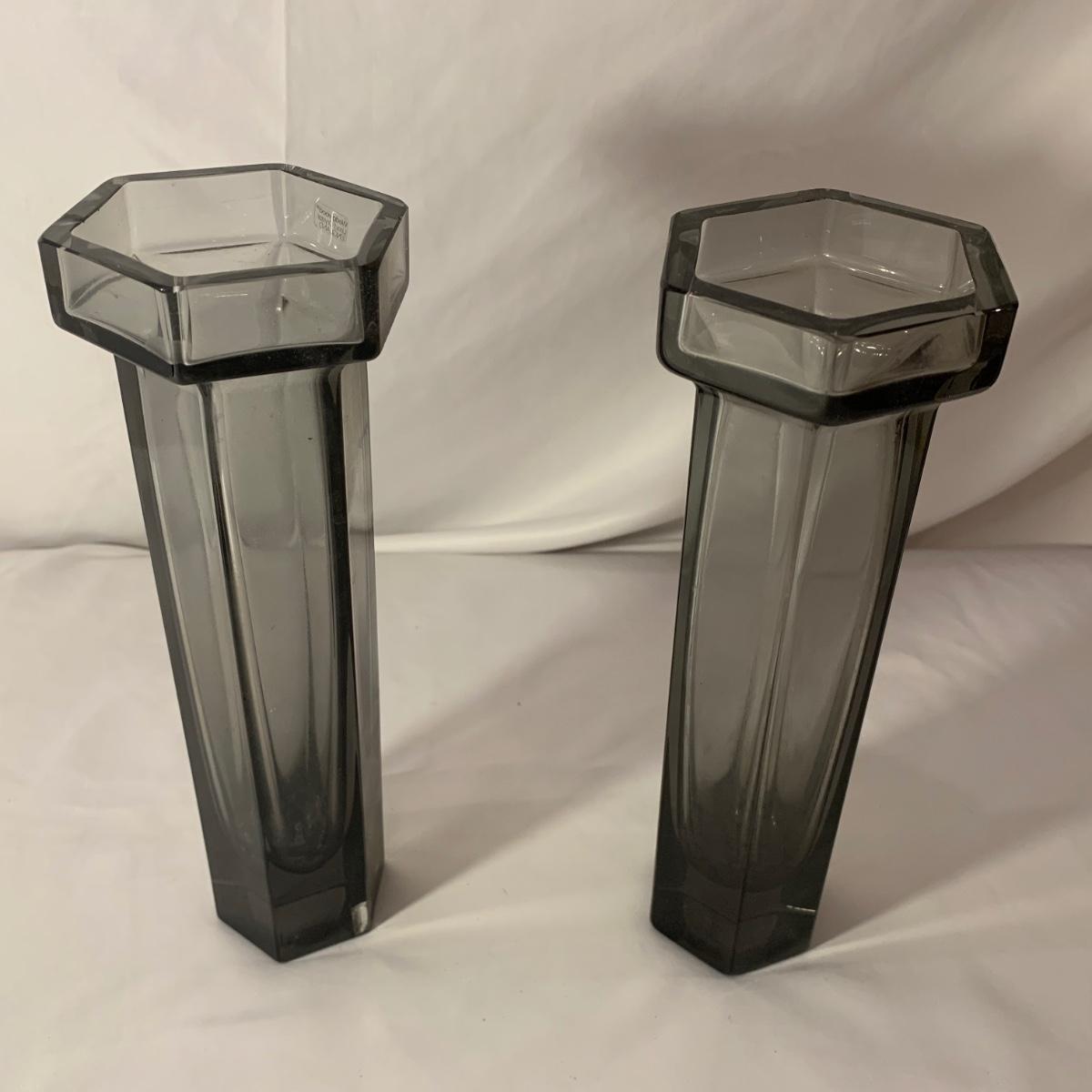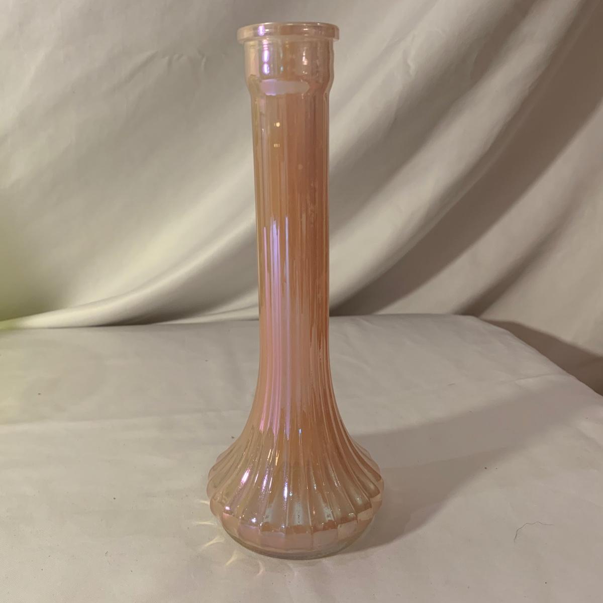 Lovely assortment of vases includes two Wedgwood Lead Crystal England vases and seven other glass vases of varying colors. Wedgwood vases have been chipped but remain intact. For reference, the Wedgwood vases measure approximately 3” at the top opening and 10”H. Please see photos for more details. Shipping available.