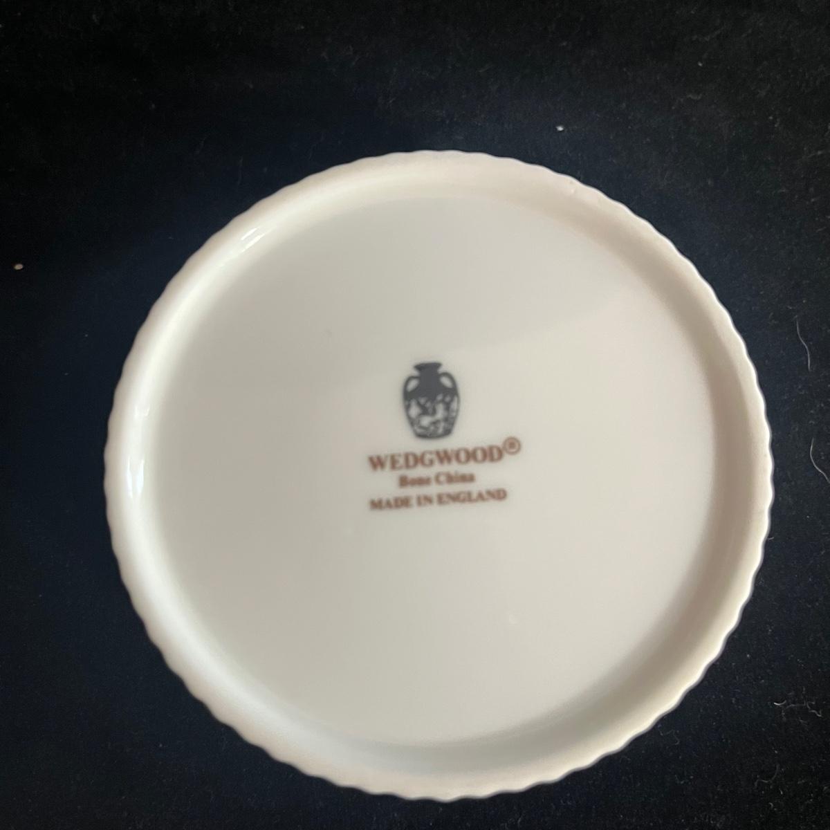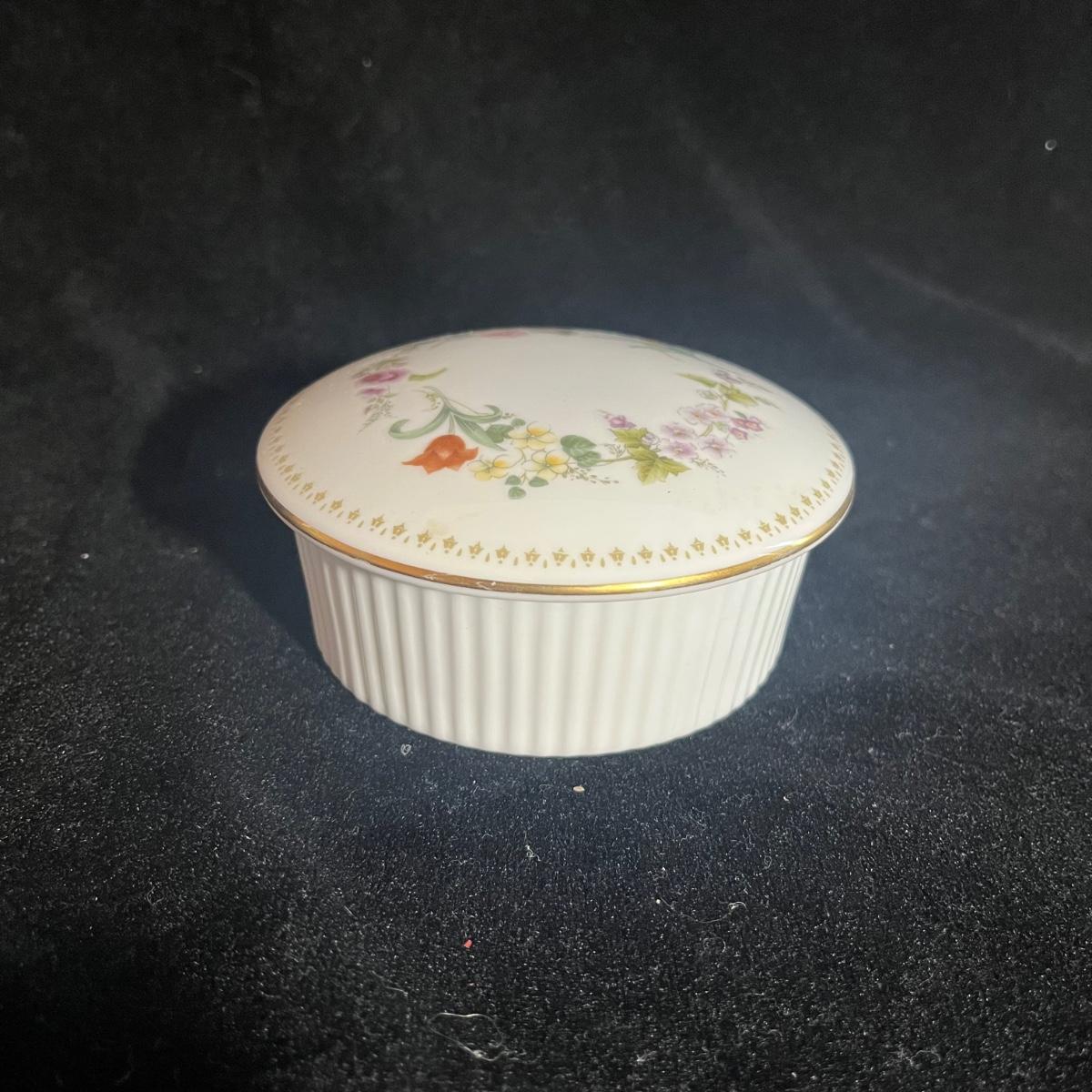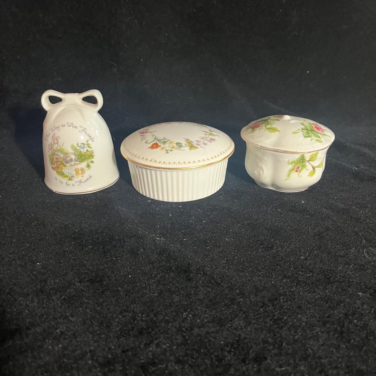 This porcelain lot includes a floral design Wedgewood container with lid, Limoges container with lid and a porcelain bell made in Japan. Wedgwood container measures 3.5”D x 2” tall.