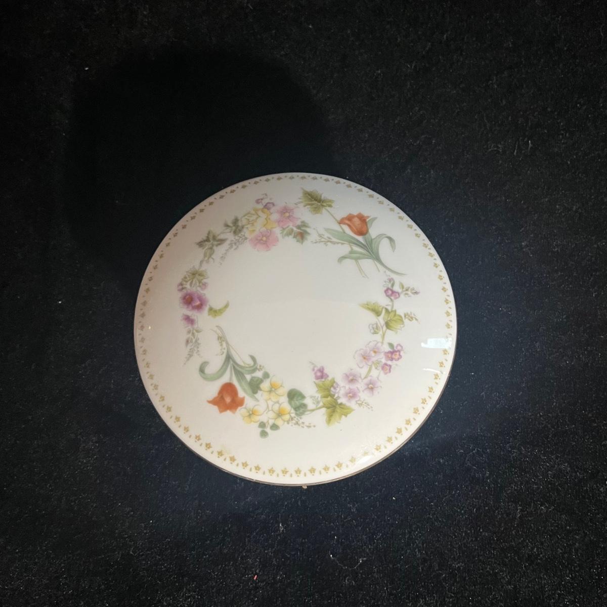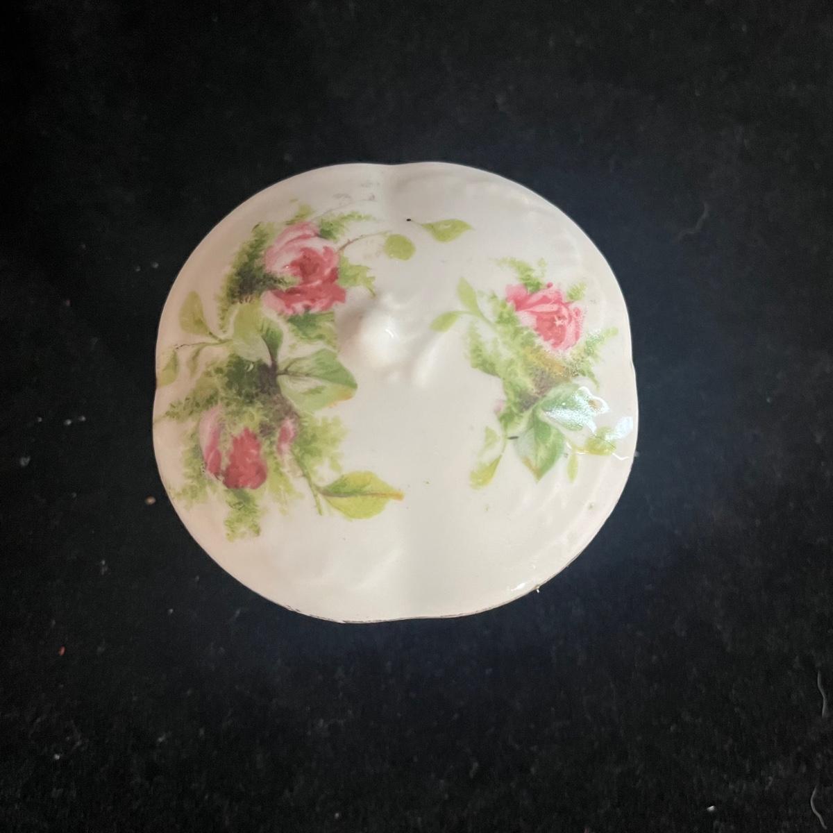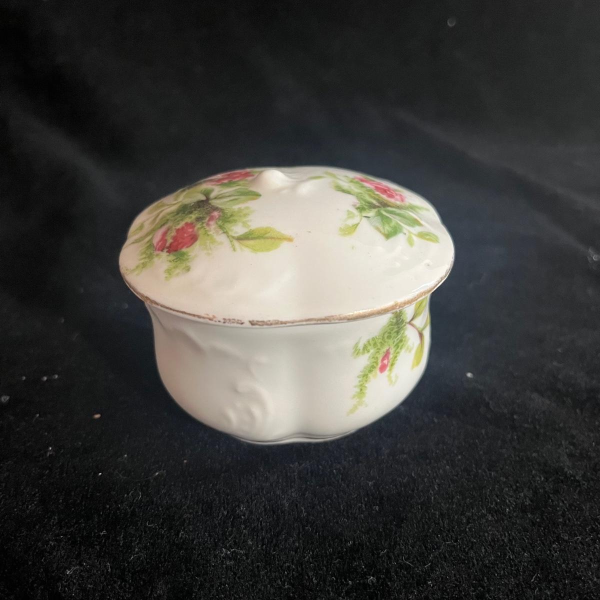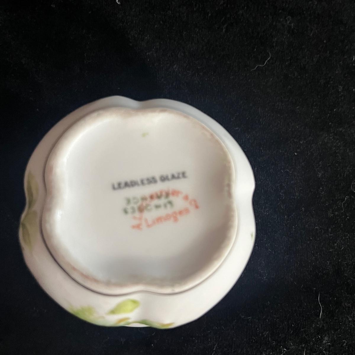 This porcelain lot includes a floral design Wedgewood container with lid, Limoges container with lid and a porcelain bell made in Japan. Wedgwood container measures 3.5”D x 2” tall.