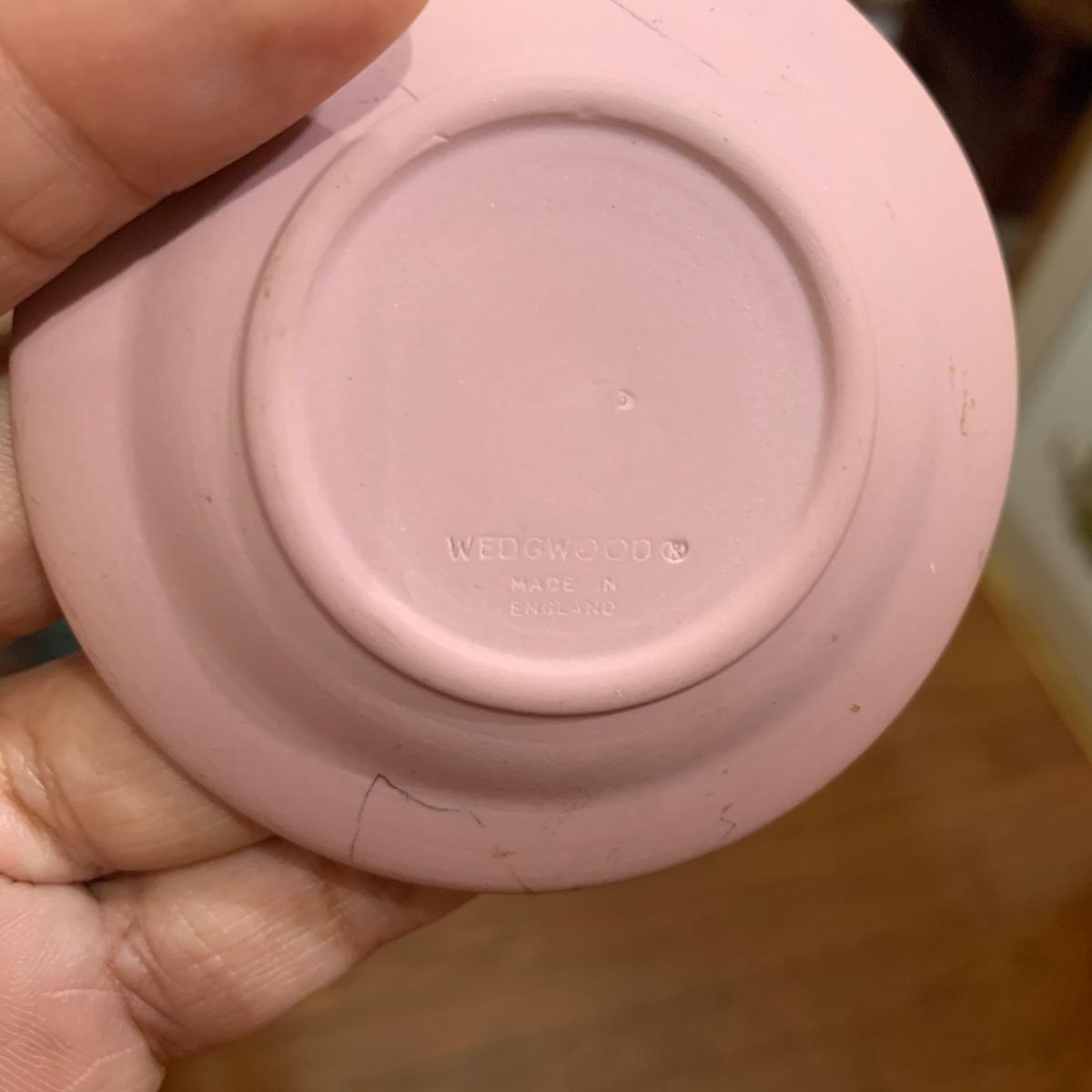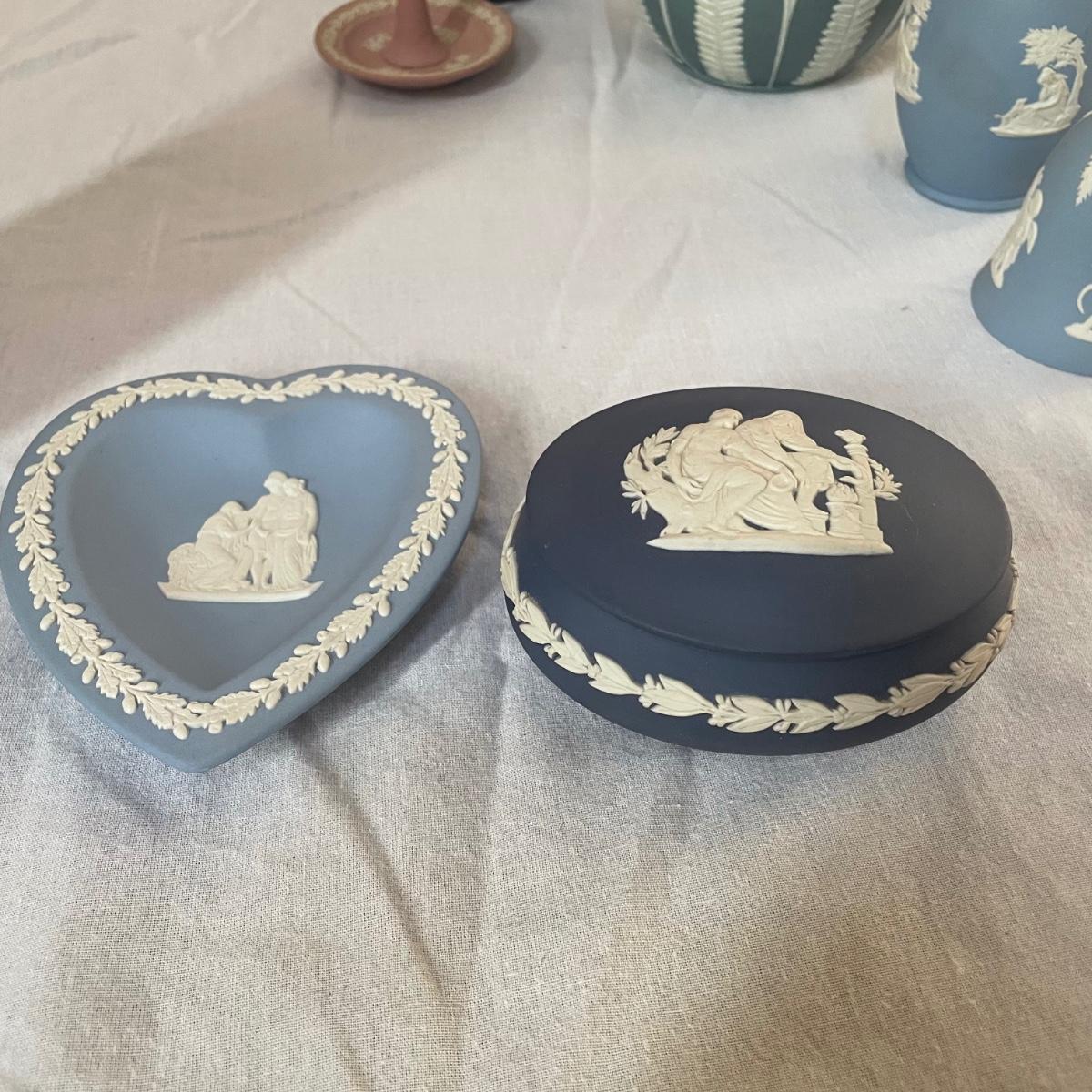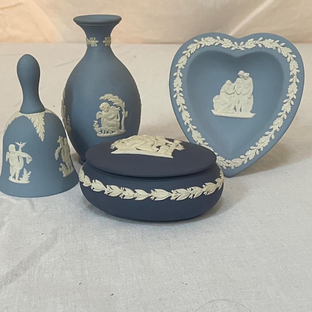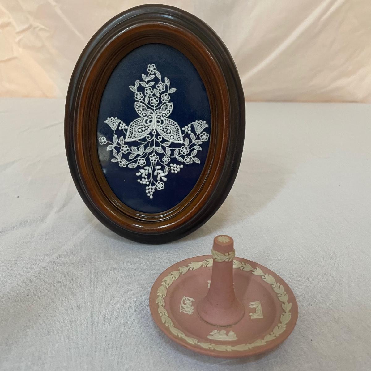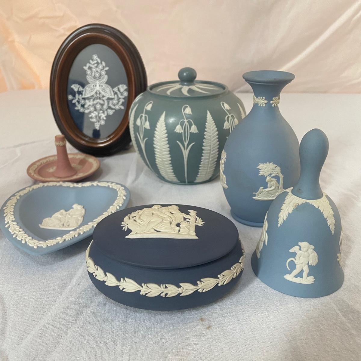 Five of these seven items are marked Wedgwood, which includes the heart shaped dish, dark blue lidded dish, bell, pink ring holder, and small vase. The other two items are unmarked. No chips or cracks; a few light marks on the pink ring holder's base, see images. The frame for the oval lace shaped piece is a wood-like plastic that measures 6.5” x 5”.