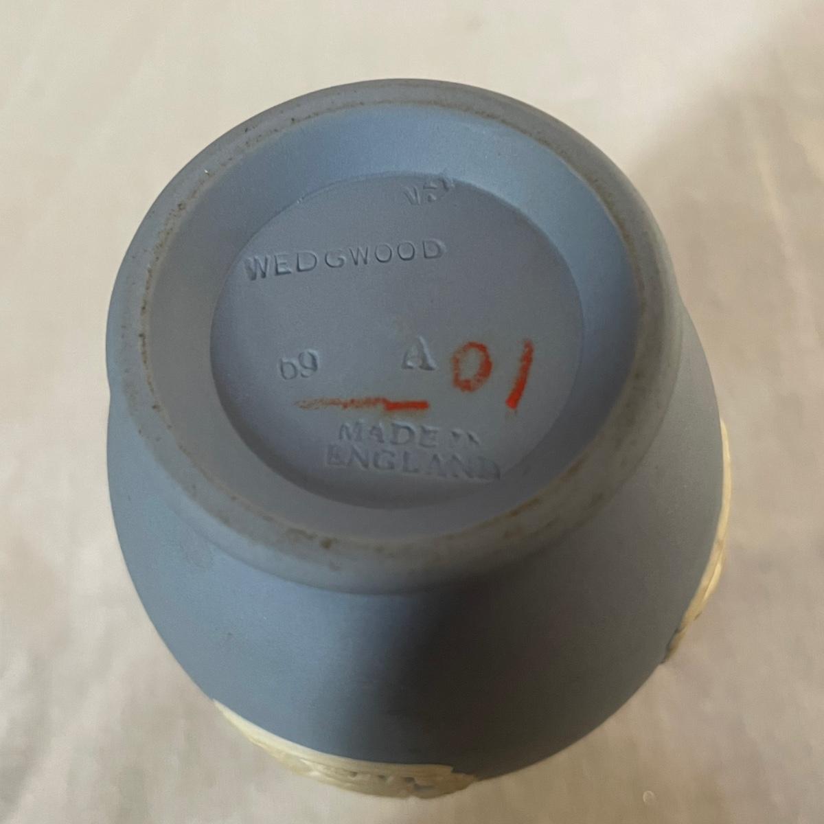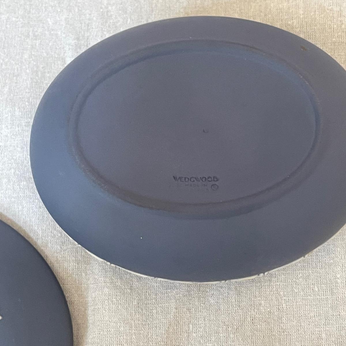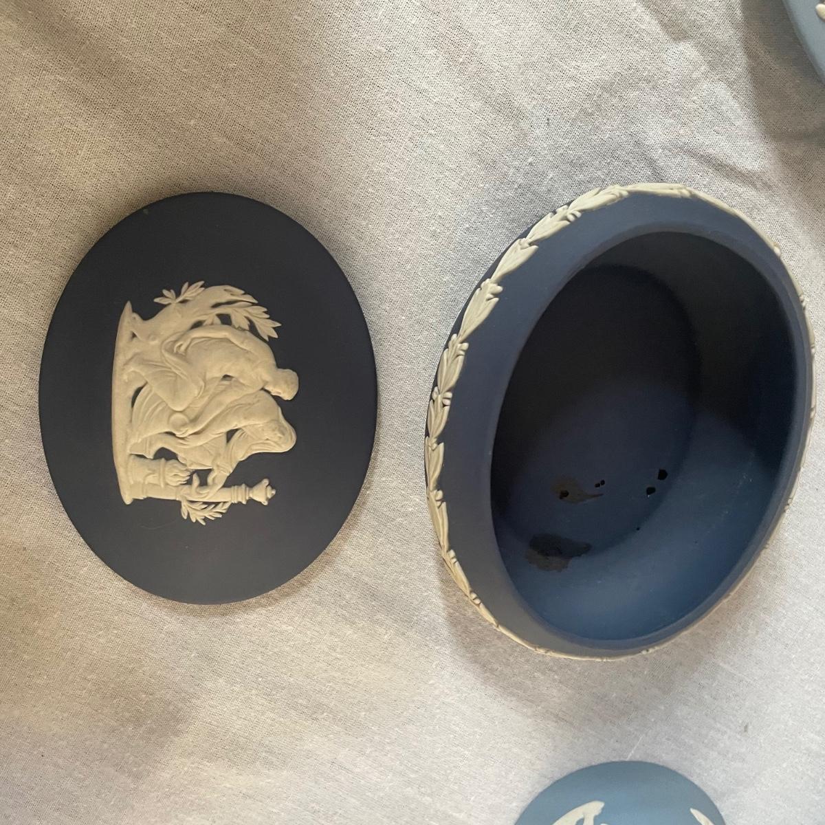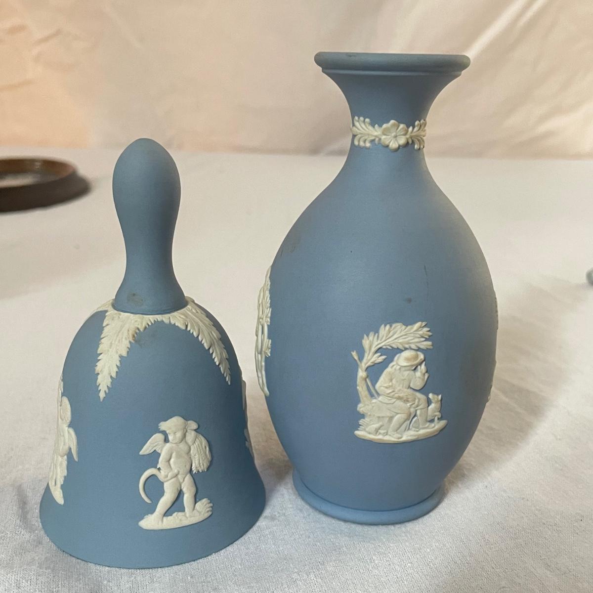 Five of these seven items are marked Wedgwood, which includes the heart shaped dish, dark blue lidded dish, bell, pink ring holder, and small vase. The other two items are unmarked. No chips or cracks; a few light marks on the pink ring holder's base, see images. The frame for the oval lace shaped piece is a wood-like plastic that measures 6.5” x 5”.