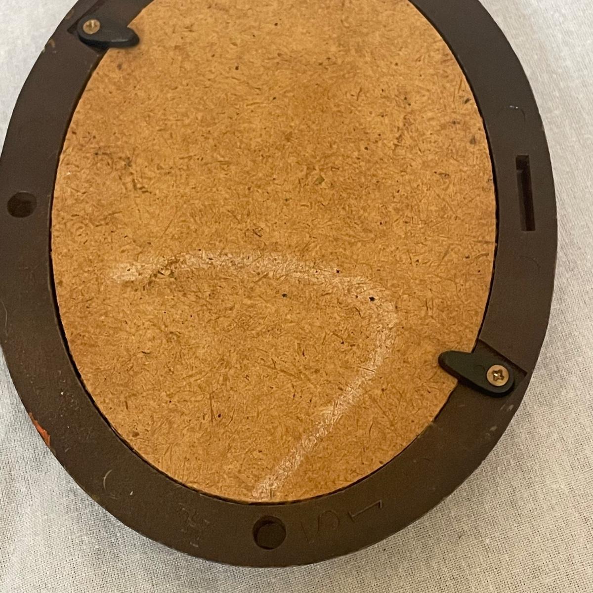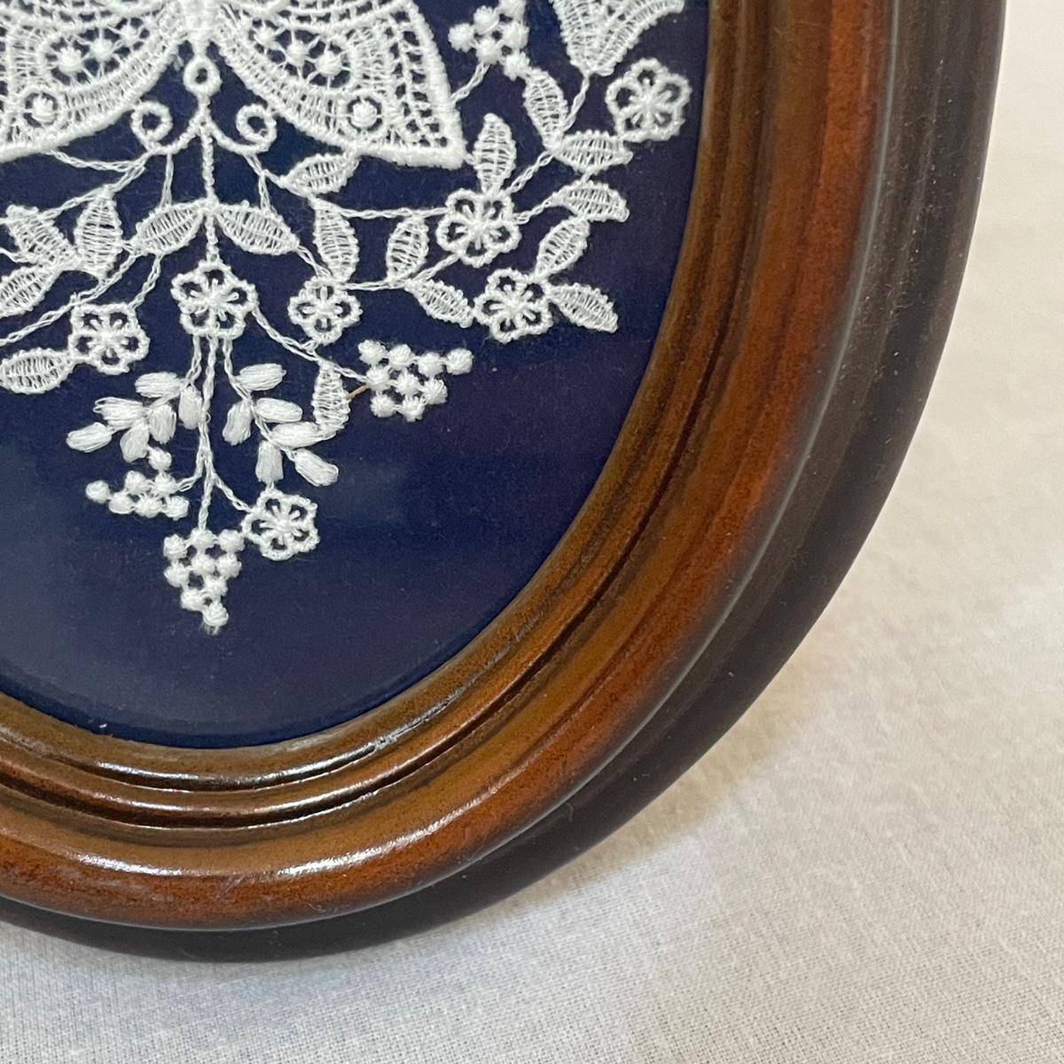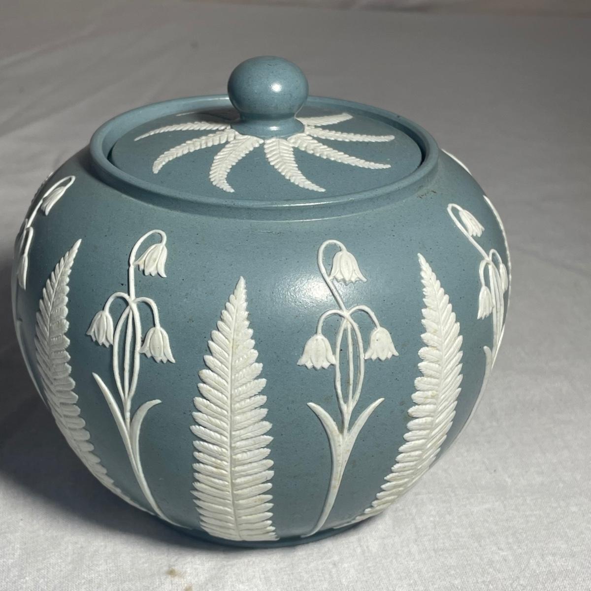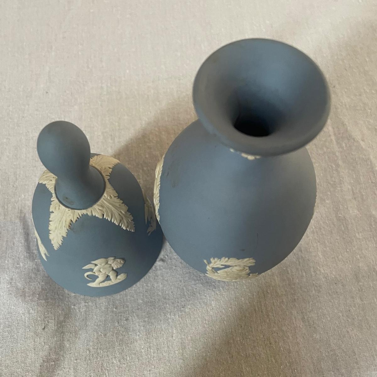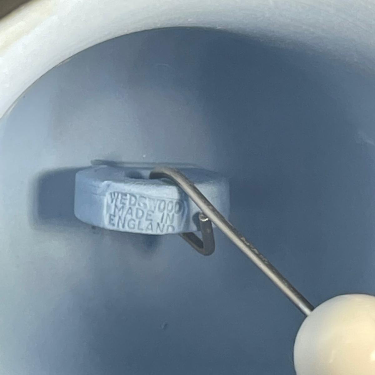 Five of these seven items are marked Wedgwood, which includes the heart shaped dish, dark blue lidded dish, bell, pink ring holder, and small vase. The other two items are unmarked. No chips or cracks; a few light marks on the pink ring holder's base, see images. The frame for the oval lace shaped piece is a wood-like plastic that measures 6.5” x 5”.