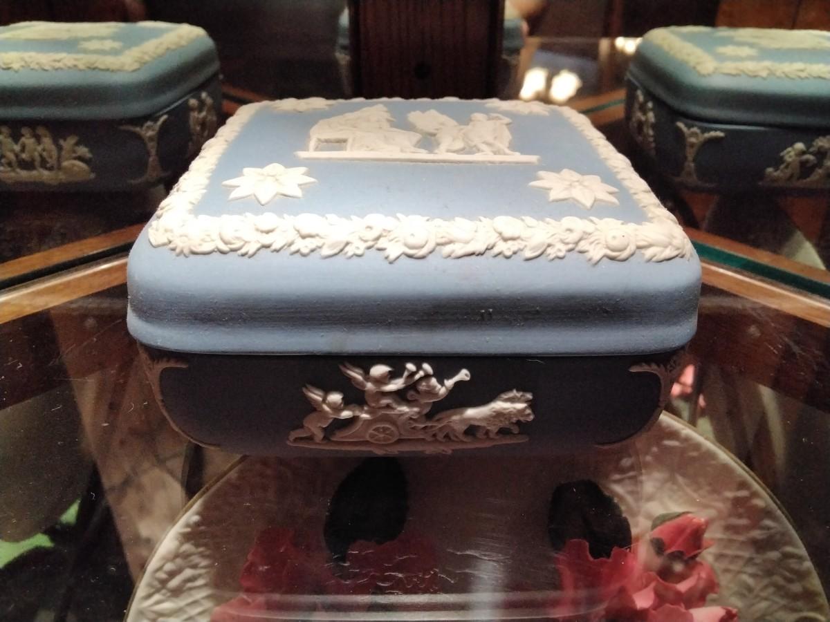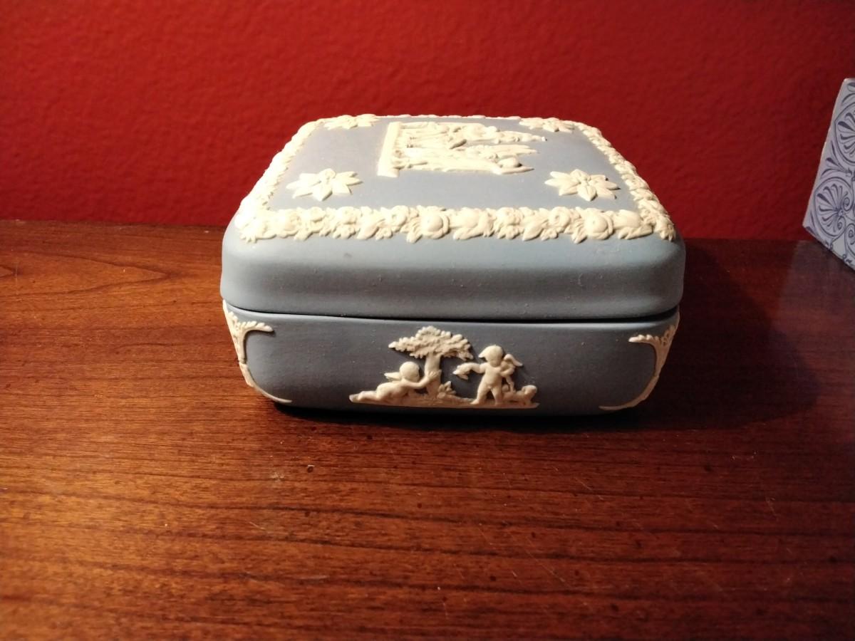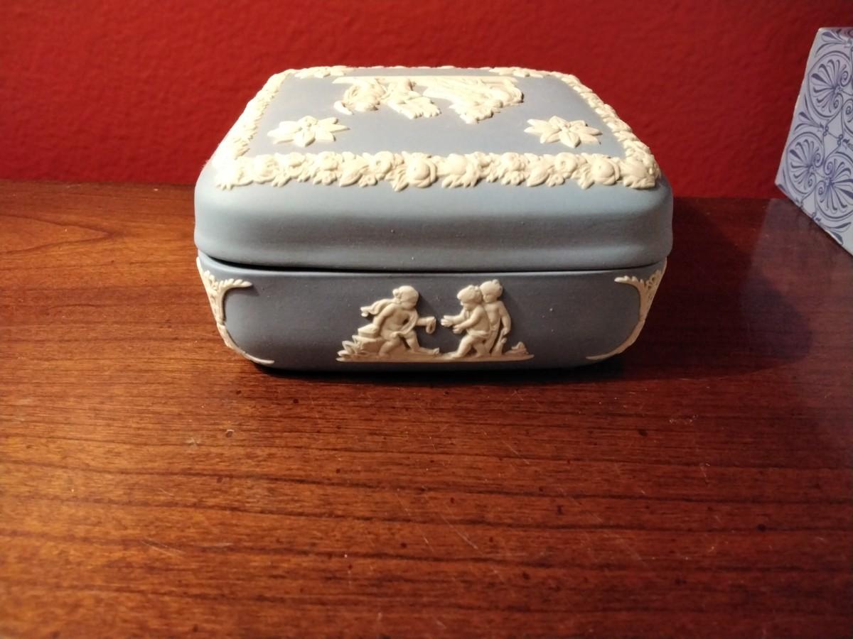 Still in original box. Lidded box in traditional Jasperware matte blue porcelain, measures 4" square, 1 3/4" tall. Wedgwood, Made in England stamped on the bottom. Item is in excellent vintage condition -- no chips, cracks, scratches, repairs.