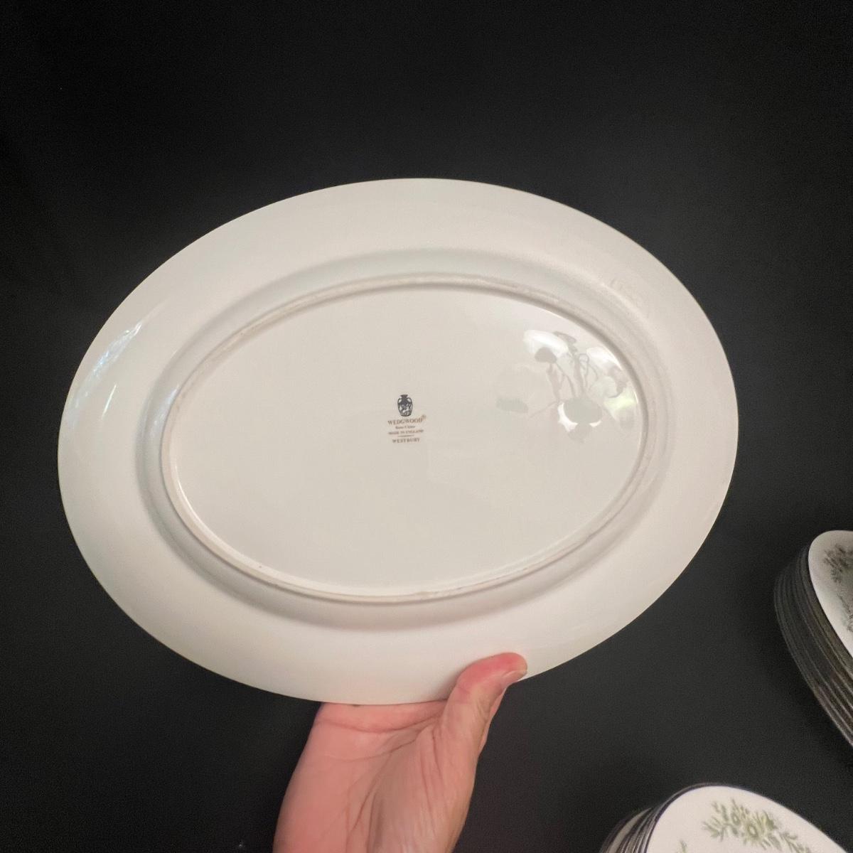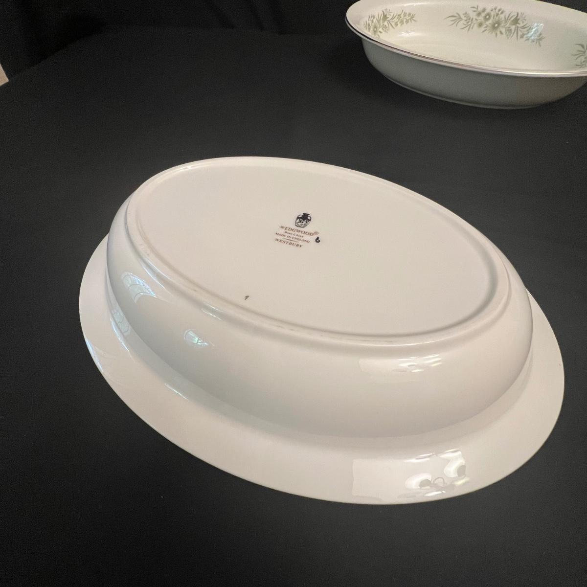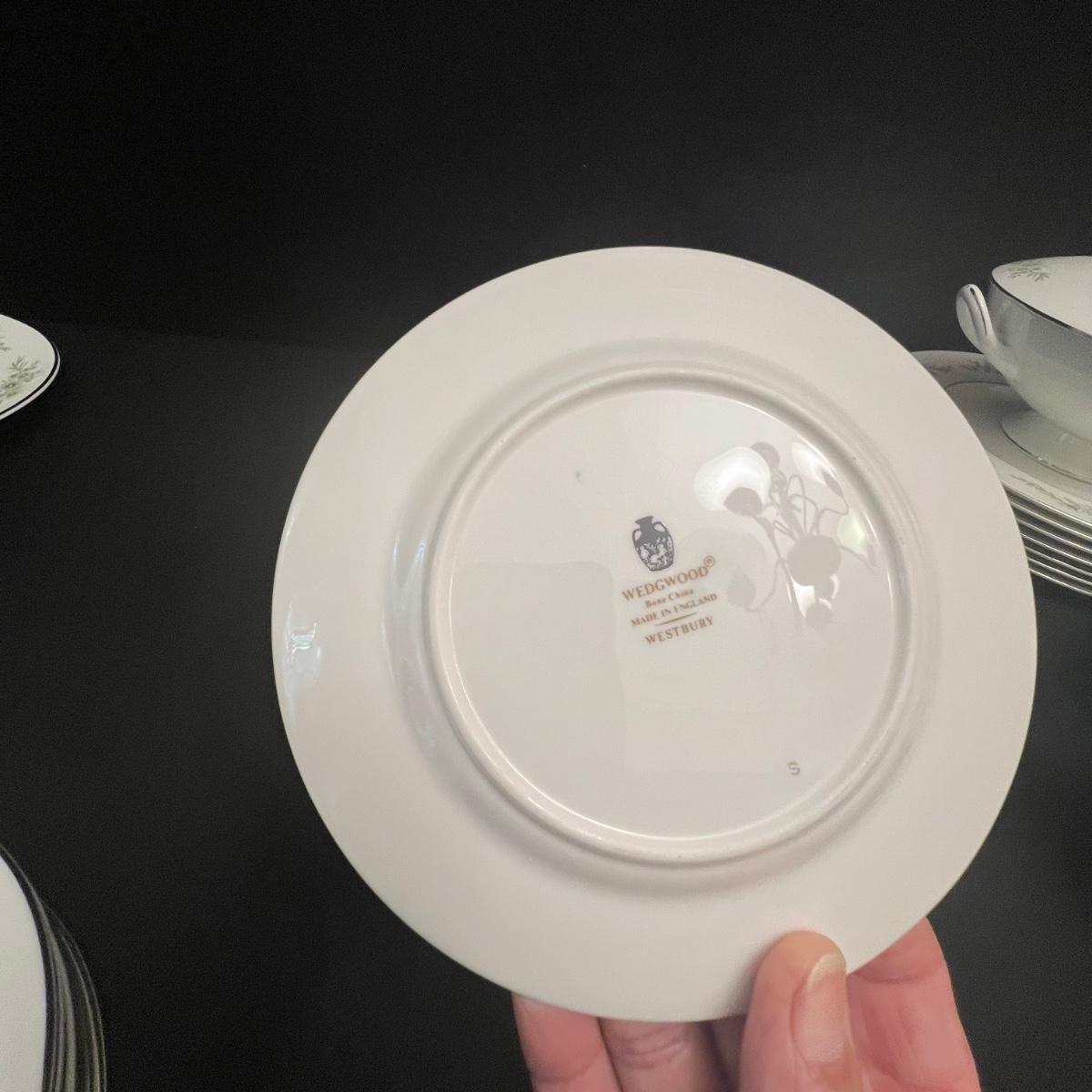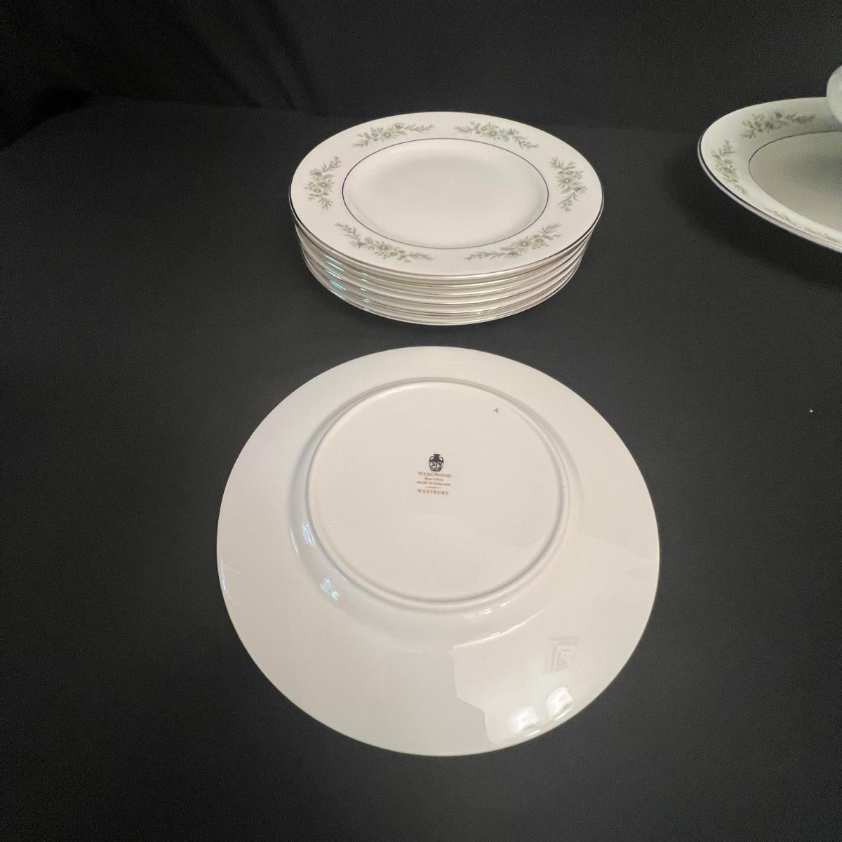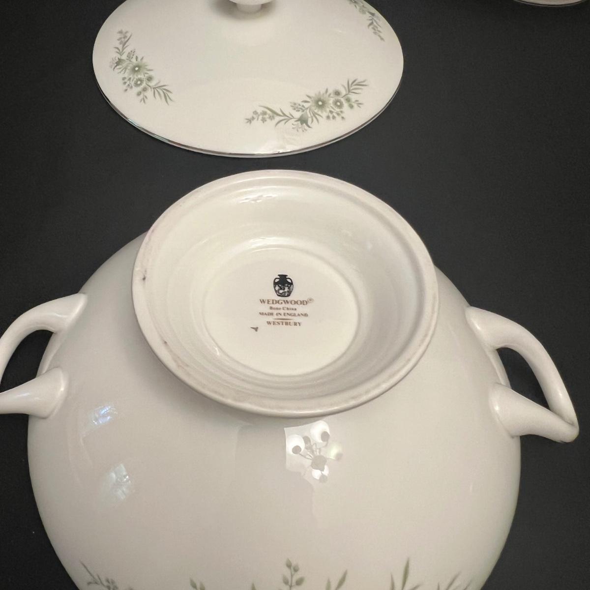 Fourty plus piece set of Wedgwood in their Westbury design. Lot includes two matching lidded tureens, seven dinner plates that are 10.75”D, eight each of salad and bread plates, a small bud vase, a gravy boat and more.