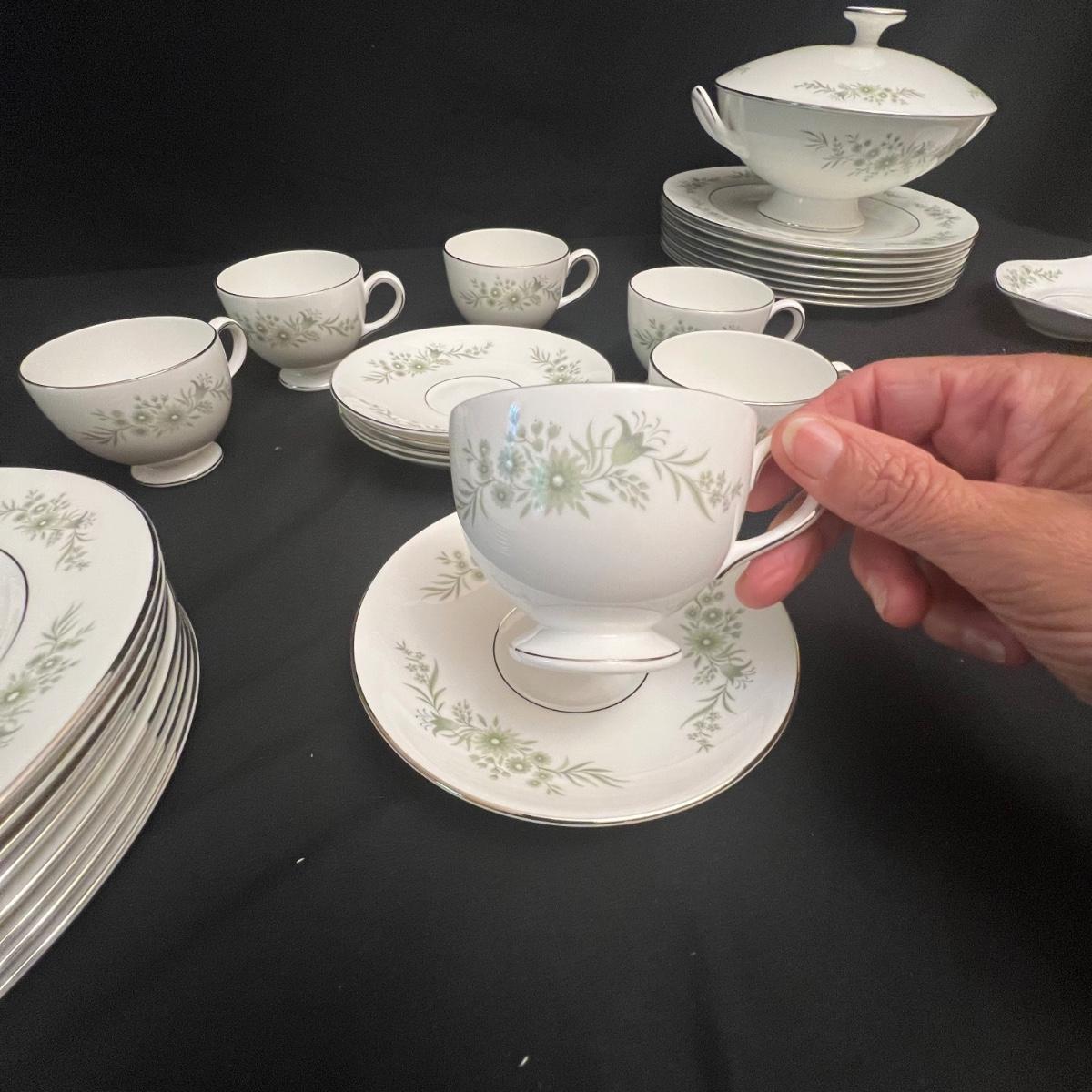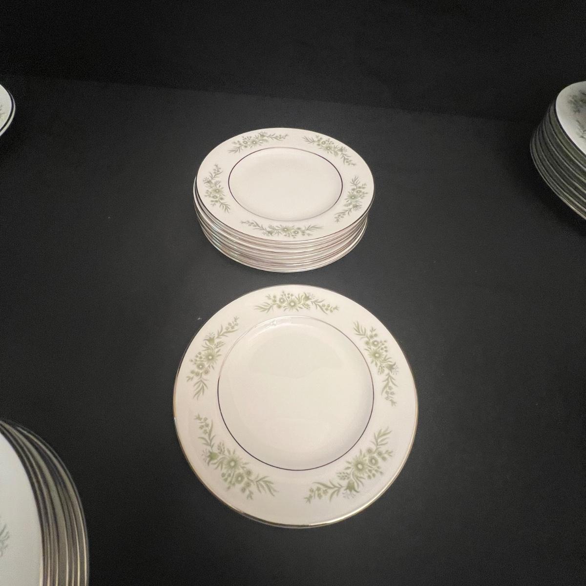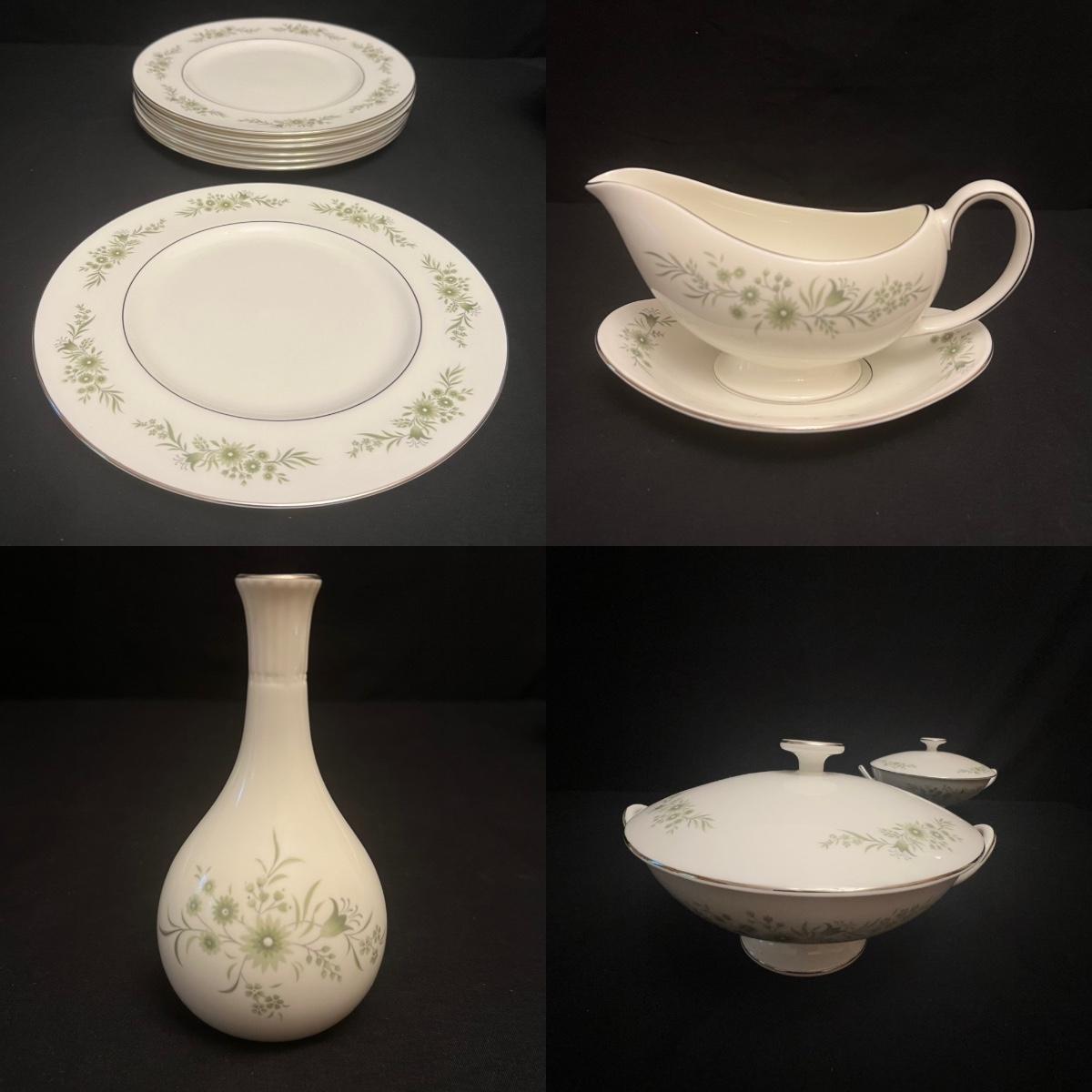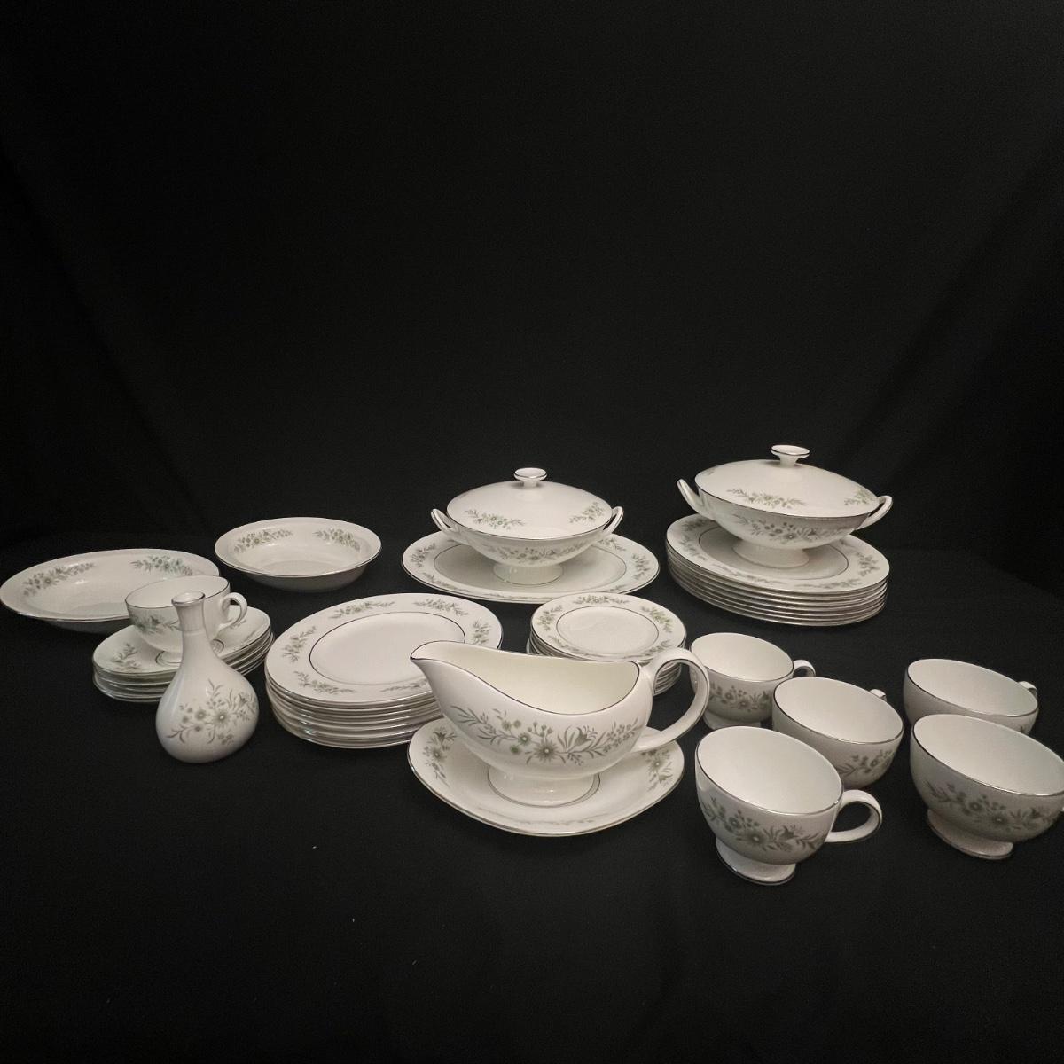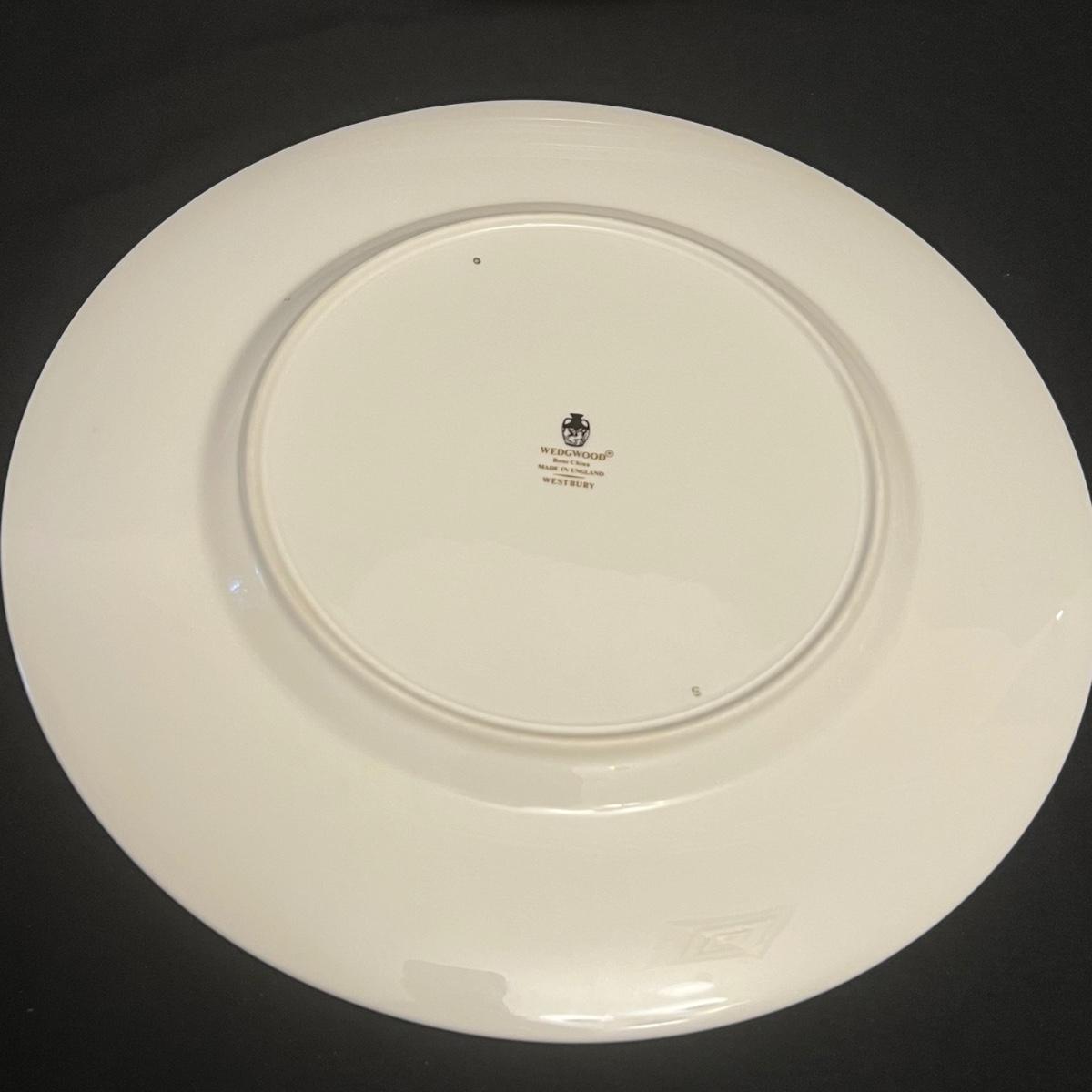 Fourty plus piece set of Wedgwood in their Westbury design. Lot includes two matching lidded tureens, seven dinner plates that are 10.75”D, eight each of salad and bread plates, a small bud vase, a gravy boat and more.