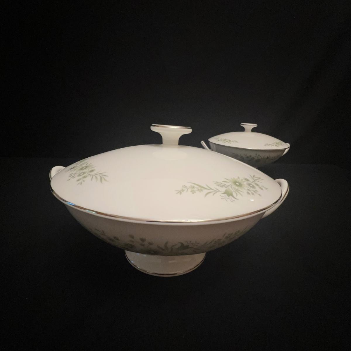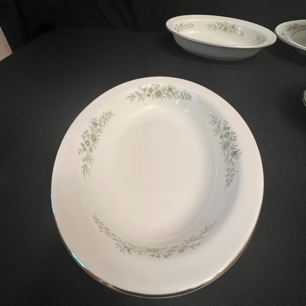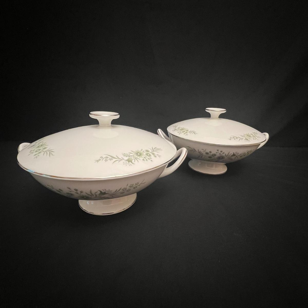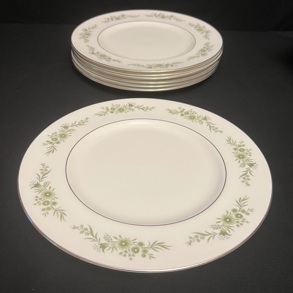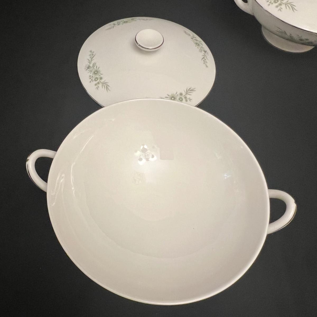 Fourty plus piece set of Wedgwood in their Westbury design. Lot includes two matching lidded tureens, seven dinner plates that are 10.75”D, eight each of salad and bread plates, a small bud vase, a gravy boat and more.