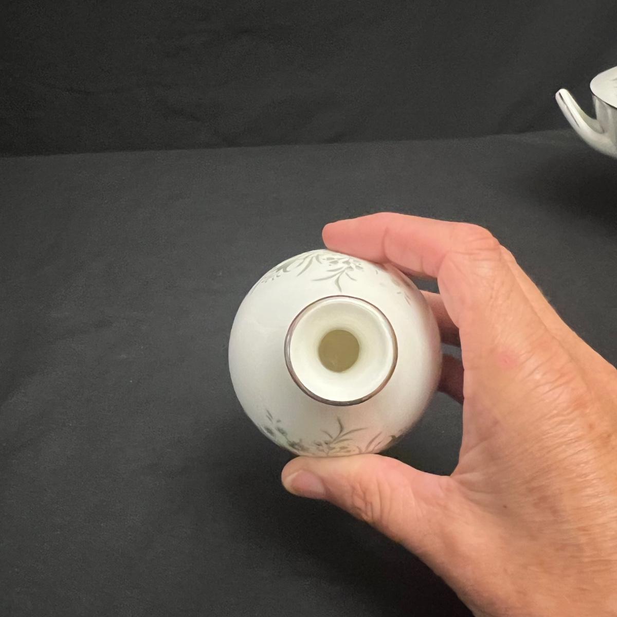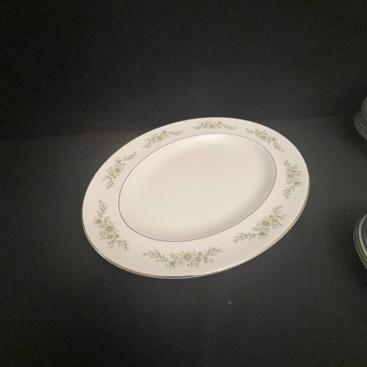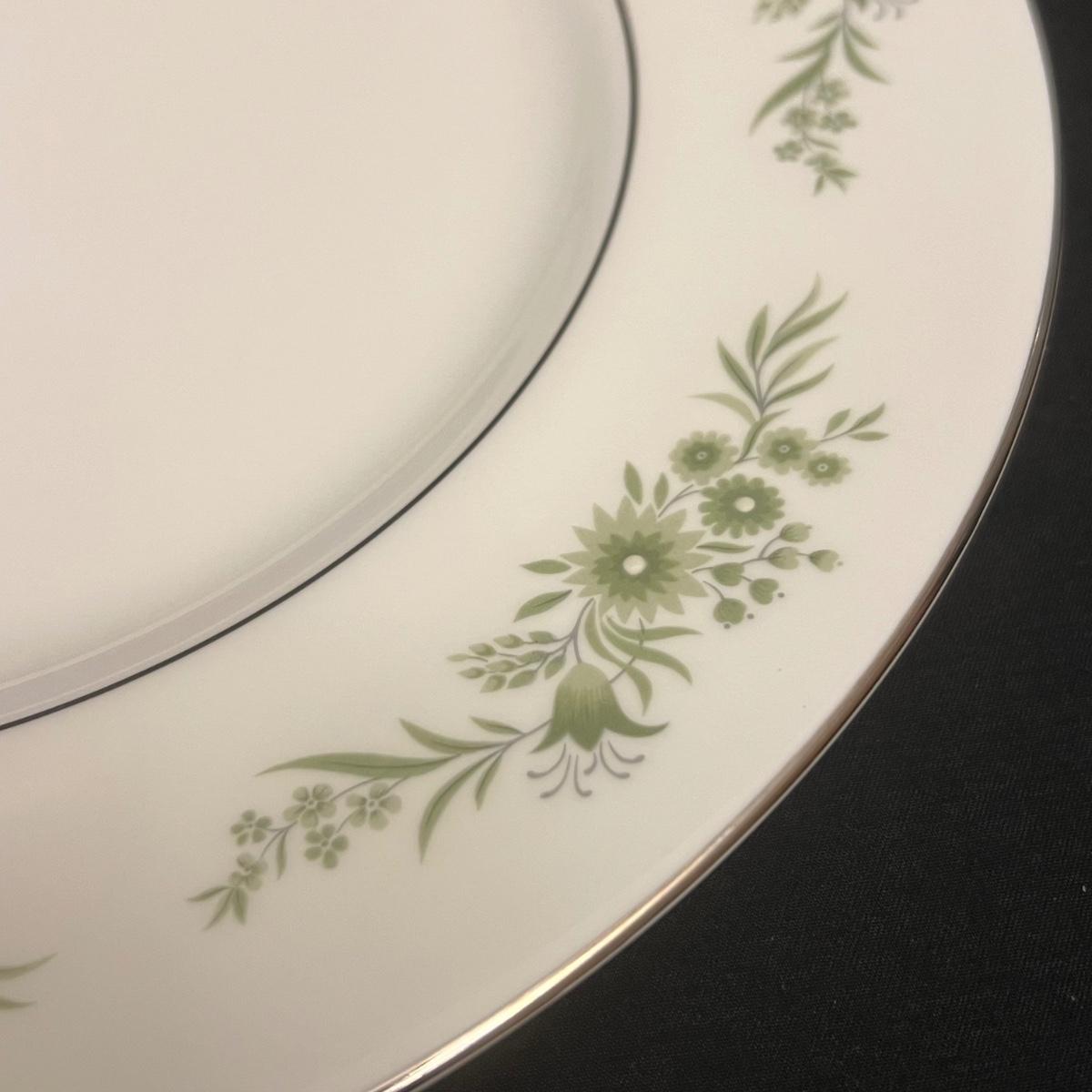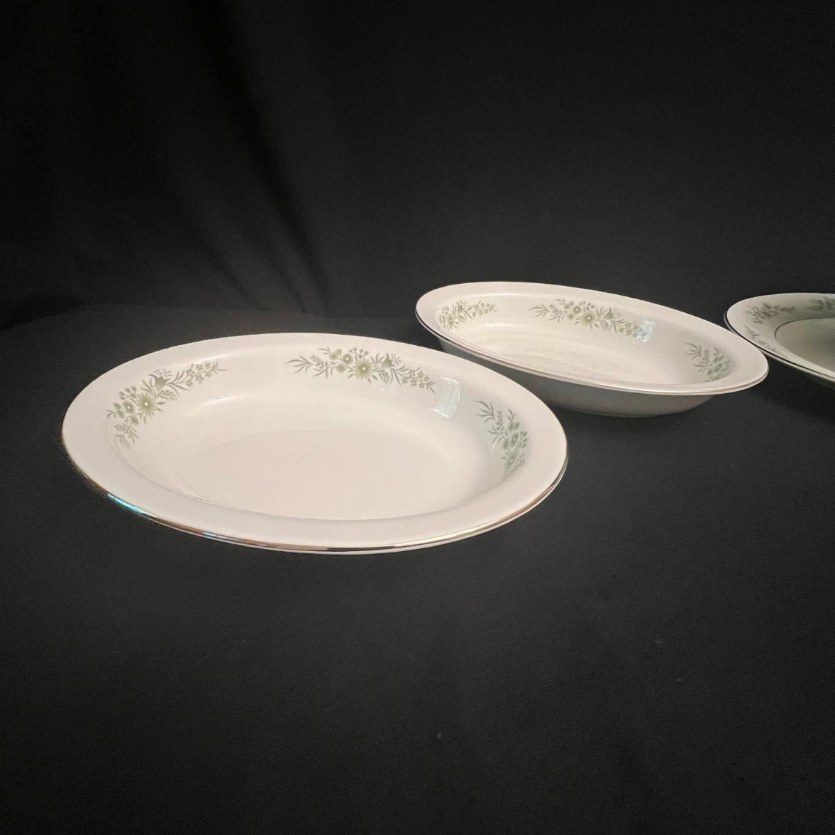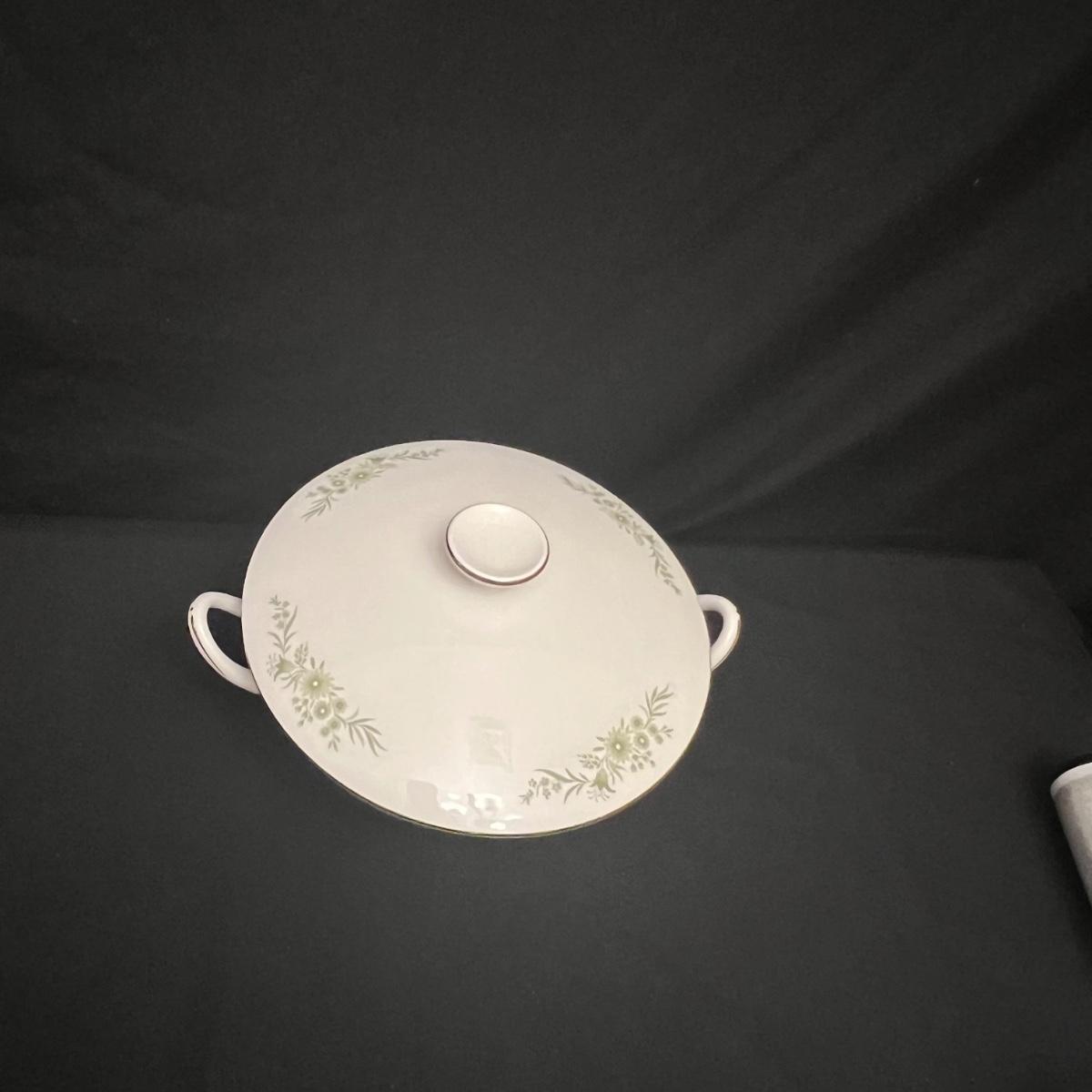 Fourty plus piece set of Wedgwood in their Westbury design. Lot includes two matching lidded tureens, seven dinner plates that are 10.75”D, eight each of salad and bread plates, a small bud vase, a gravy boat and more.