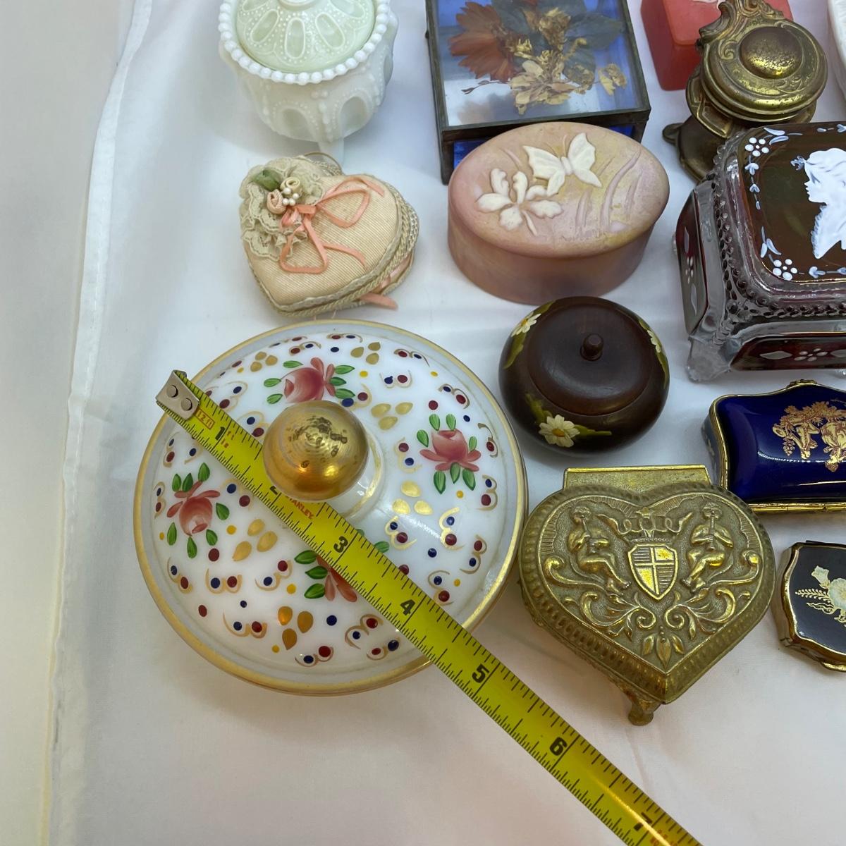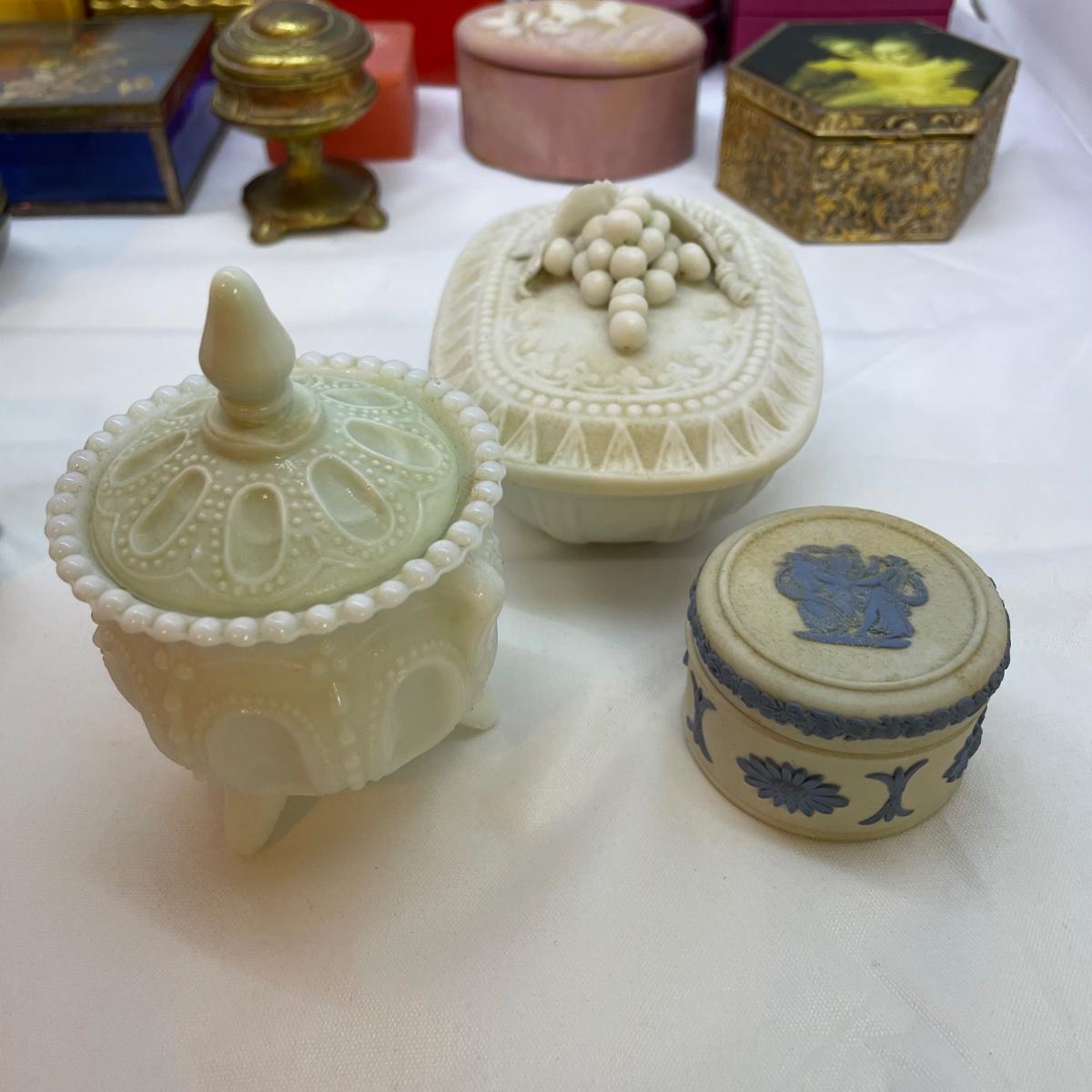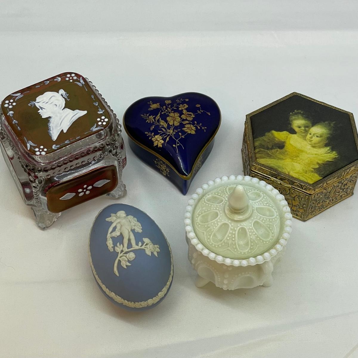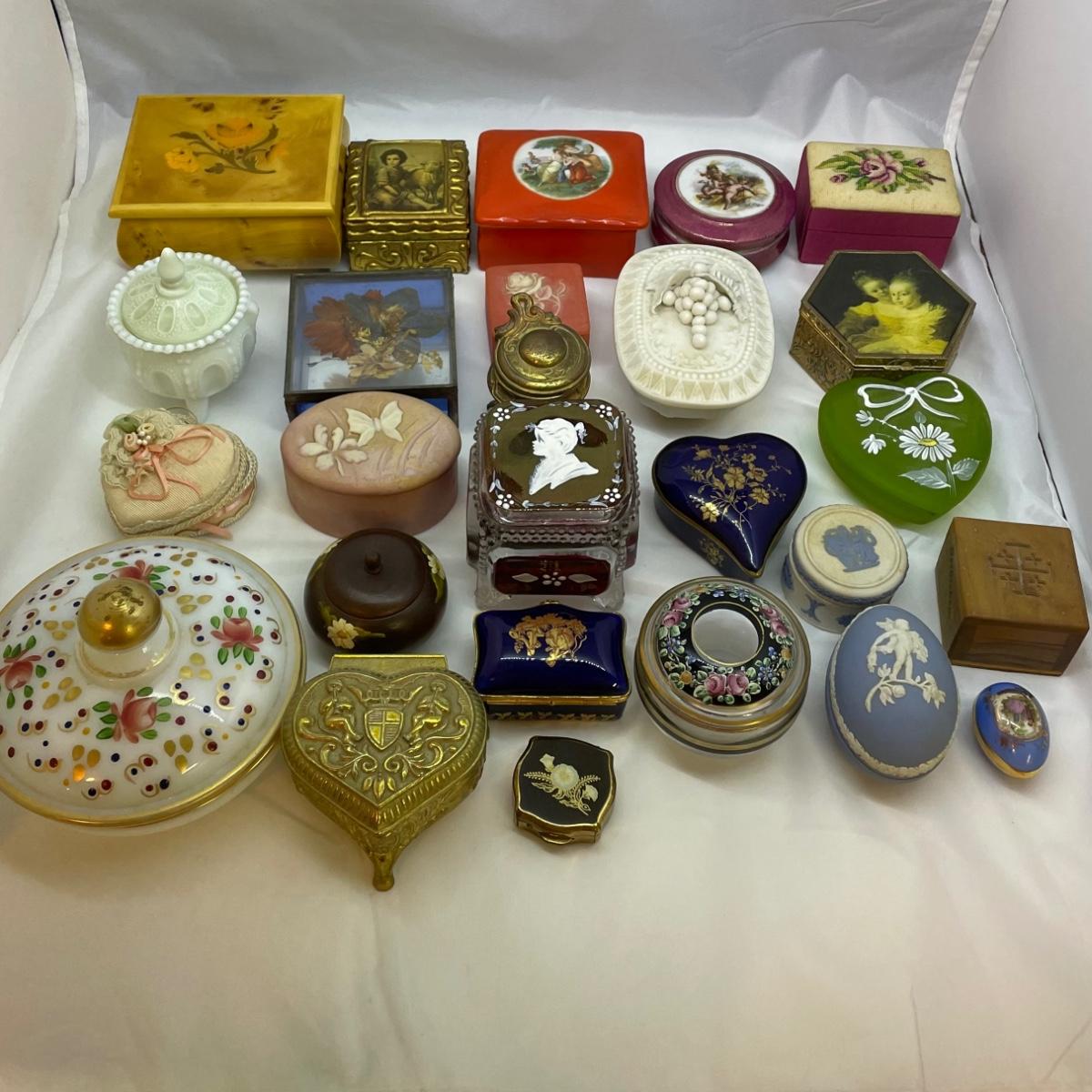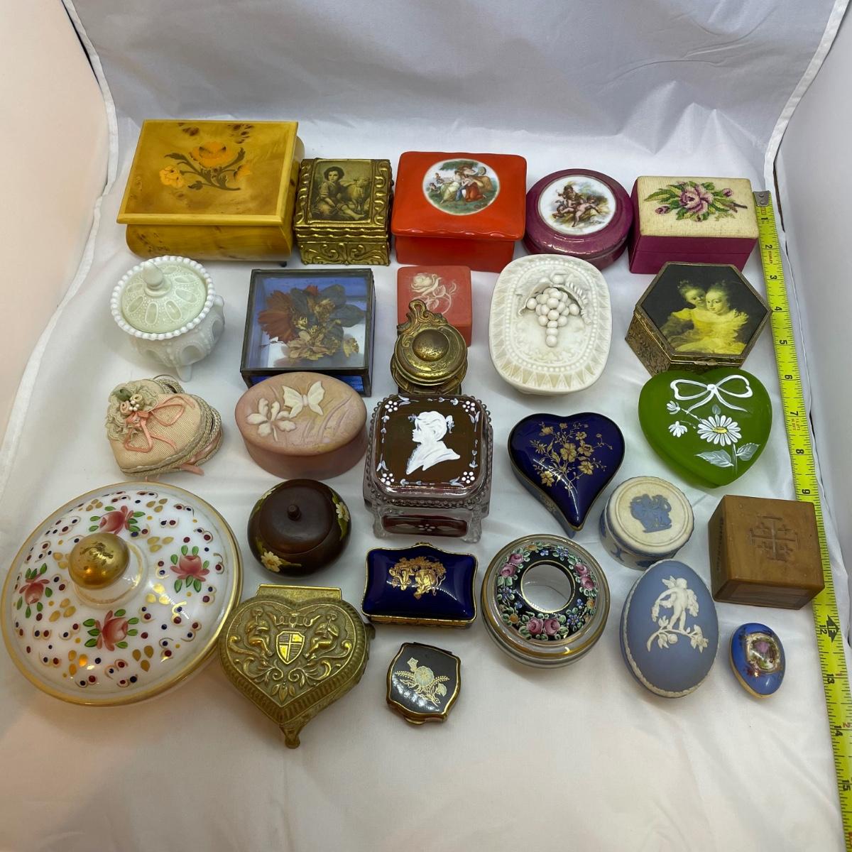 Large collection of classic and Victorian-style trinket boxes. Lot includes two Wedgwood, three marked Limoges, a couple that appear to be milk glass. The flower painted green heart and red/white silhouette-style are likely Westmoreland, the red box is signed. Materials range throughout porcelain, glass, wood, metal, upholstered, a couple are lined, most are not. The smallest Limoges egg is 1” x 1.5” x 1”H, the wooden music box that plays Greensleeves measures up 4.25” x 3.75” x 2.25”H. A round, footed metal box’s lid is no longer attached by its hinge. The butterfly box Design Gifts Intern’l Inc has an illegible signature on the top. See images. Shipping available.