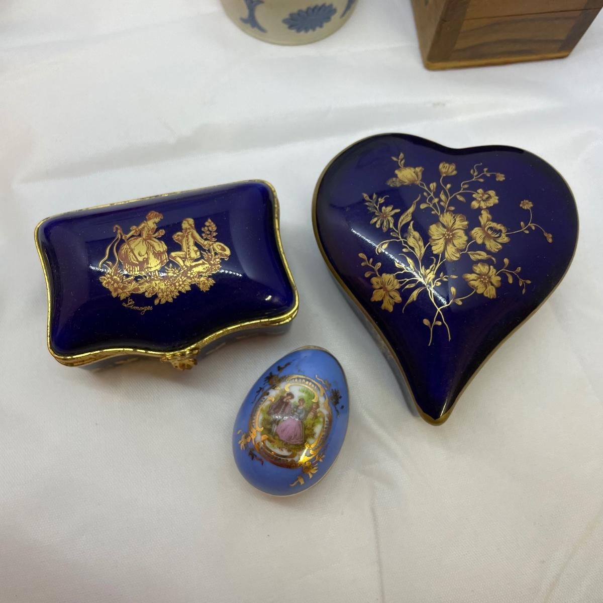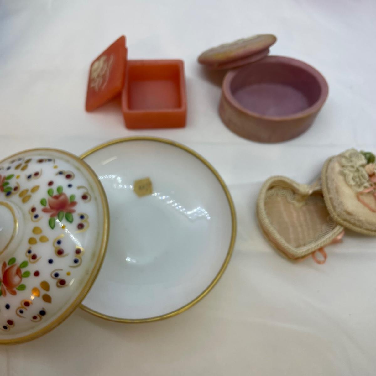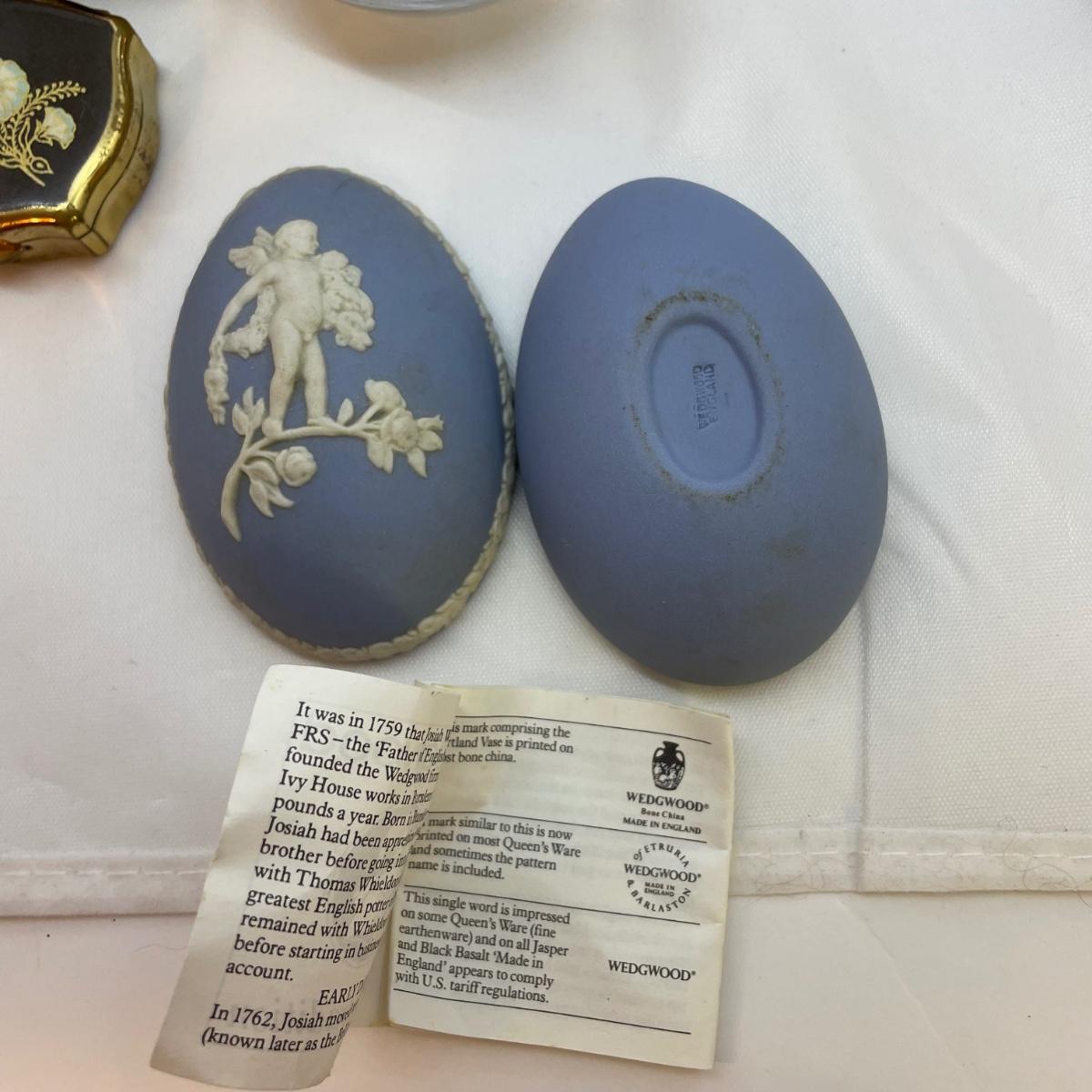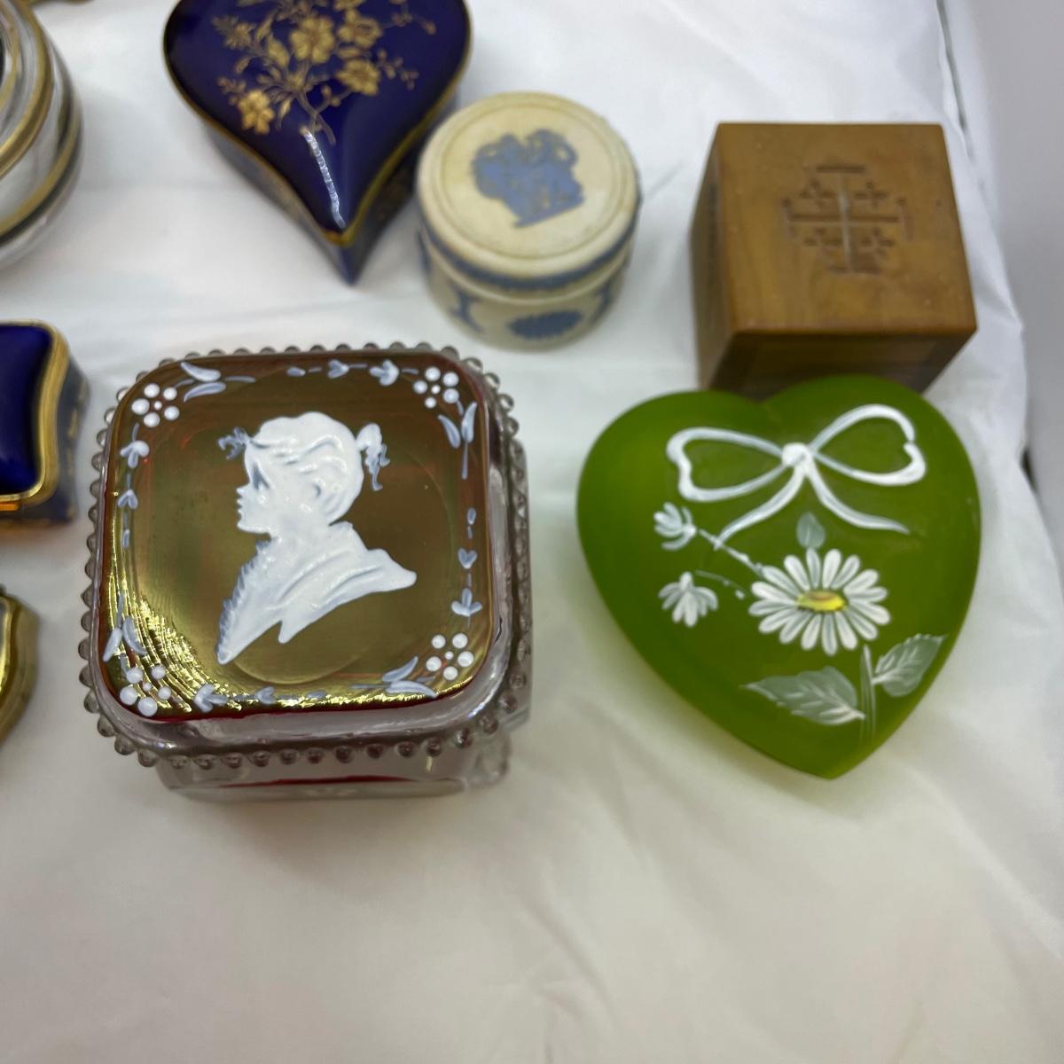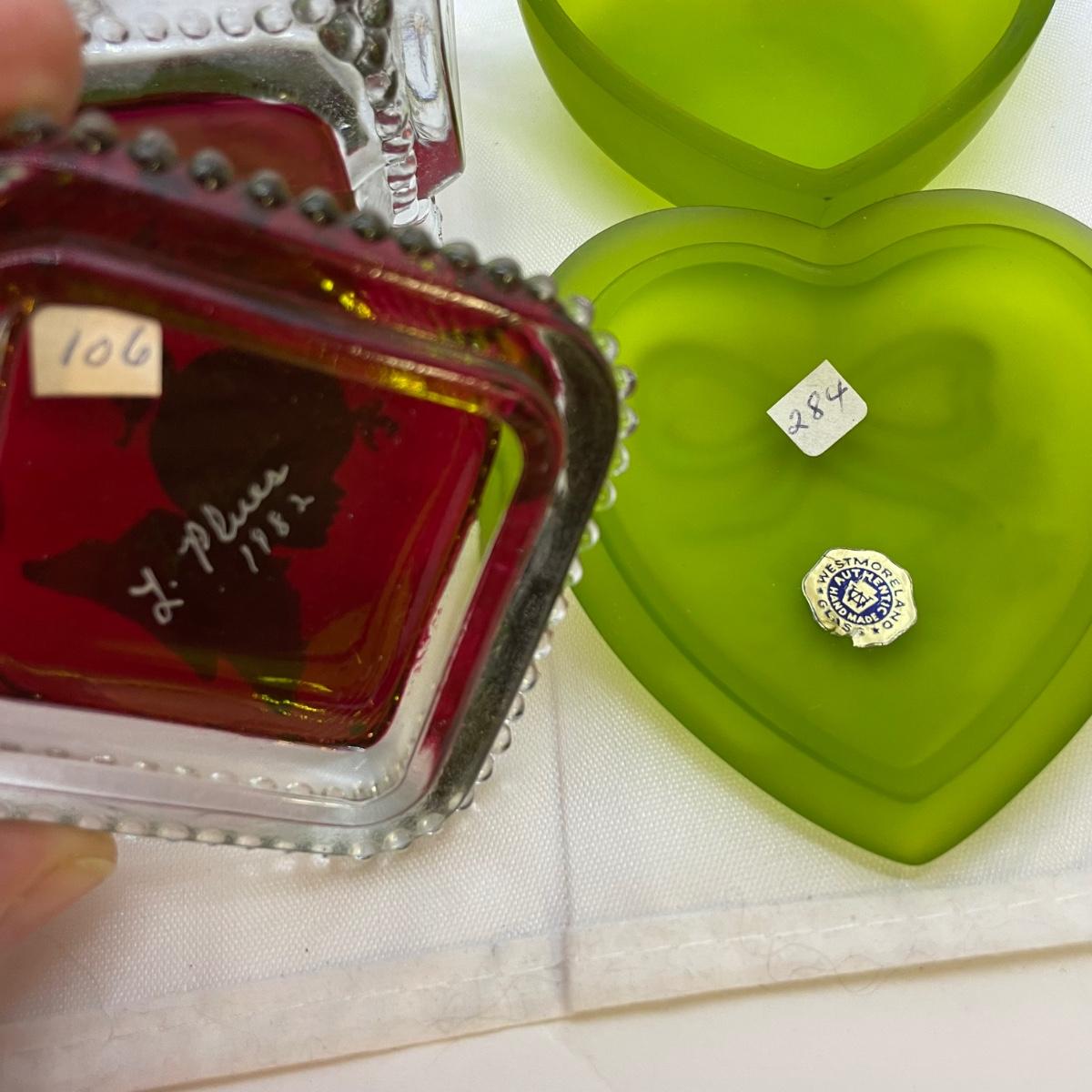 Large collection of classic and Victorian-style trinket boxes. Lot includes two Wedgwood, three marked Limoges, a couple that appear to be milk glass. The flower painted green heart and red/white silhouette-style are likely Westmoreland, the red box is signed. Materials range throughout porcelain, glass, wood, metal, upholstered, a couple are lined, most are not. The smallest Limoges egg is 1” x 1.5” x 1”H, the wooden music box that plays Greensleeves measures up 4.25” x 3.75” x 2.25”H. A round, footed metal box’s lid is no longer attached by its hinge. The butterfly box Design Gifts Intern’l Inc has an illegible signature on the top. See images. Shipping available.