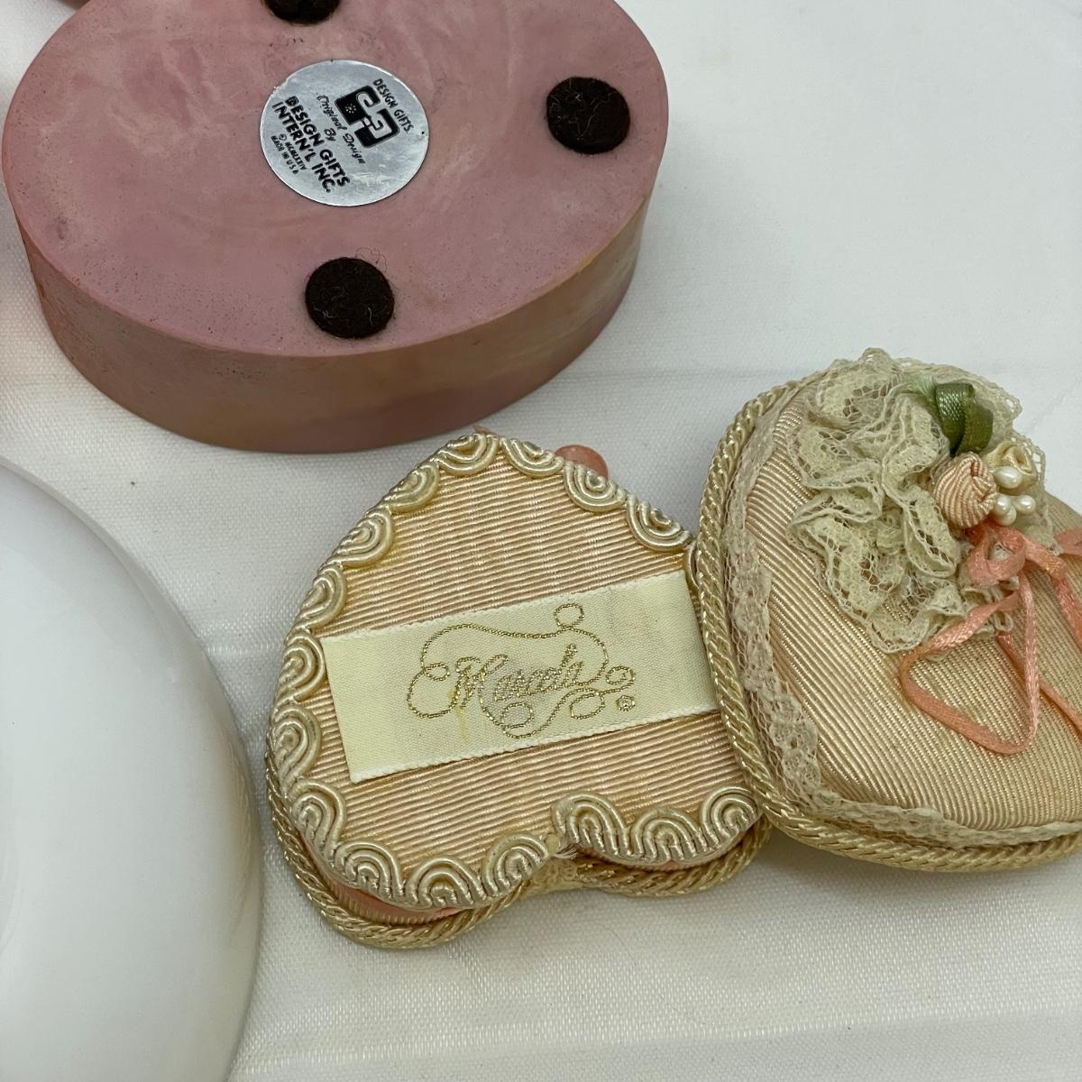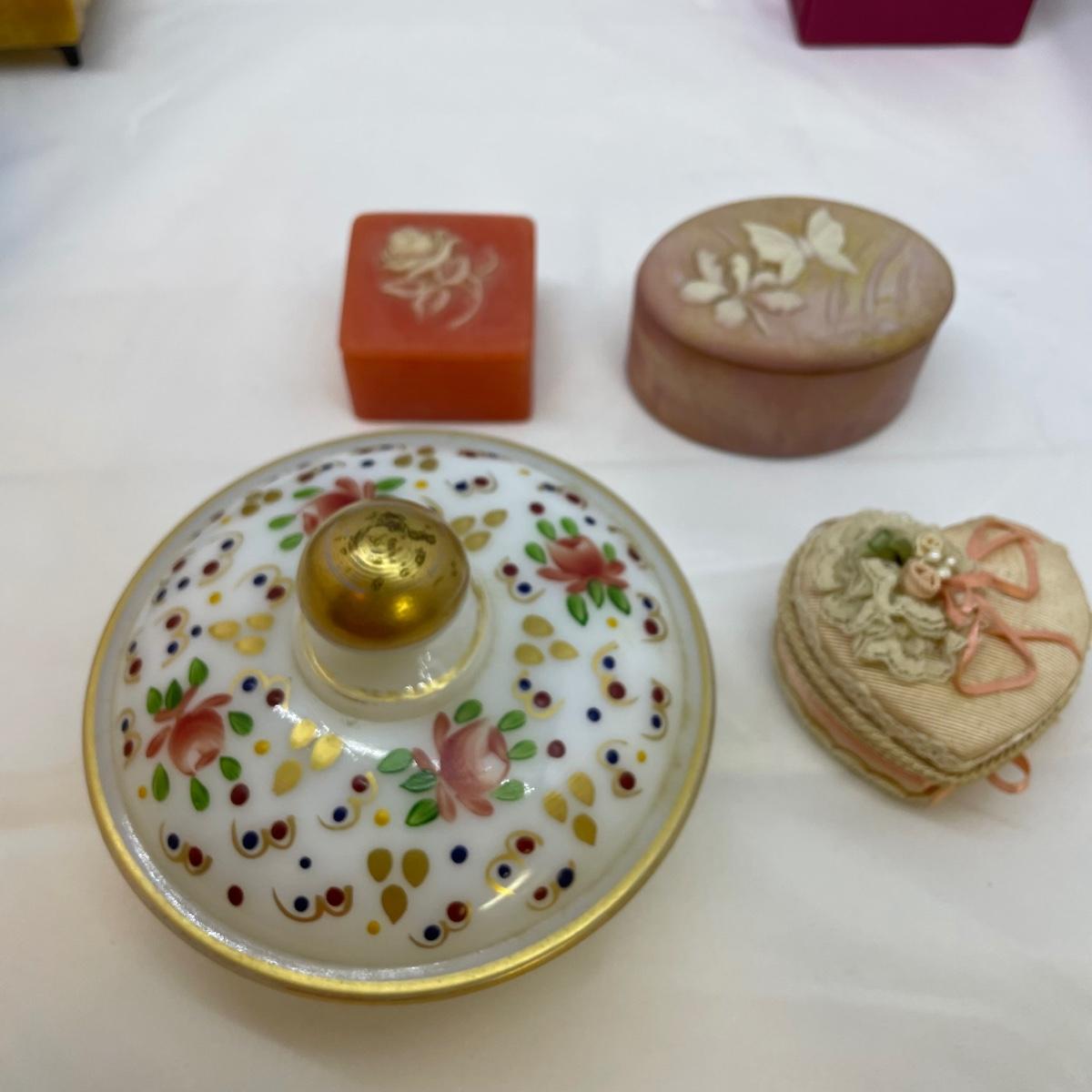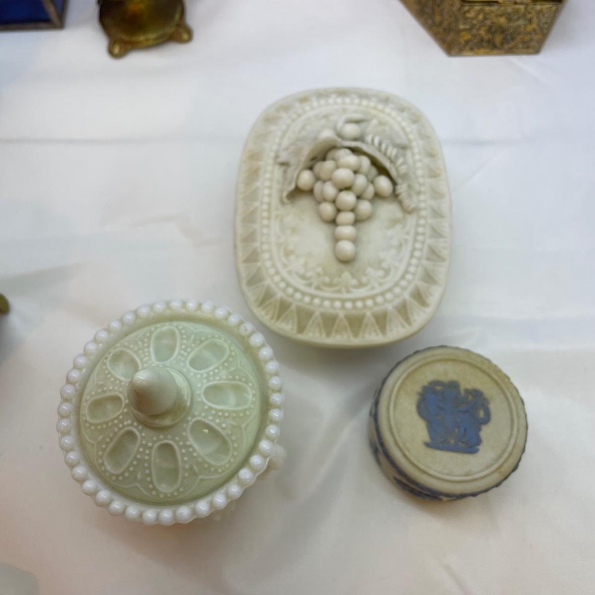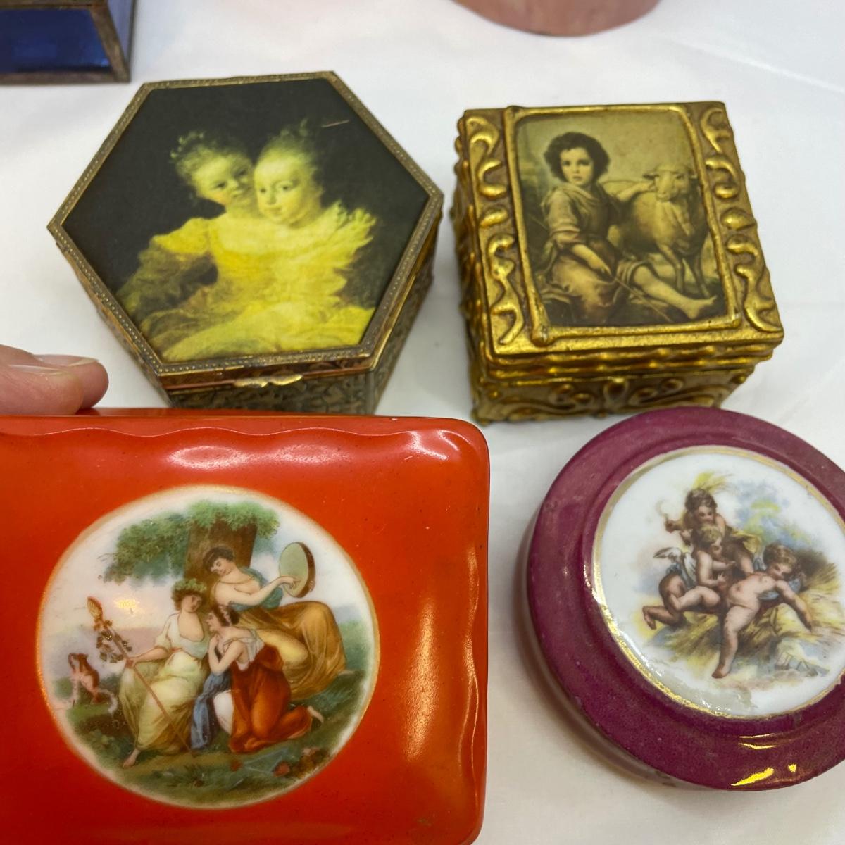 Large collection of classic and Victorian-style trinket boxes. Lot includes two Wedgwood, three marked Limoges, a couple that appear to be milk glass. The flower painted green heart and red/white silhouette-style are likely Westmoreland, the red box is signed. Materials range throughout porcelain, glass, wood, metal, upholstered, a couple are lined, most are not. The smallest Limoges egg is 1” x 1.5” x 1”H, the wooden music box that plays Greensleeves measures up 4.25” x 3.75” x 2.25”H. A round, footed metal box’s lid is no longer attached by its hinge. The butterfly box Design Gifts Intern’l Inc has an illegible signature on the top. See images. Shipping available.