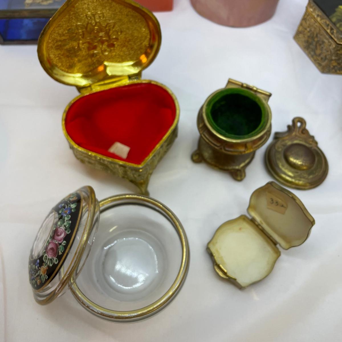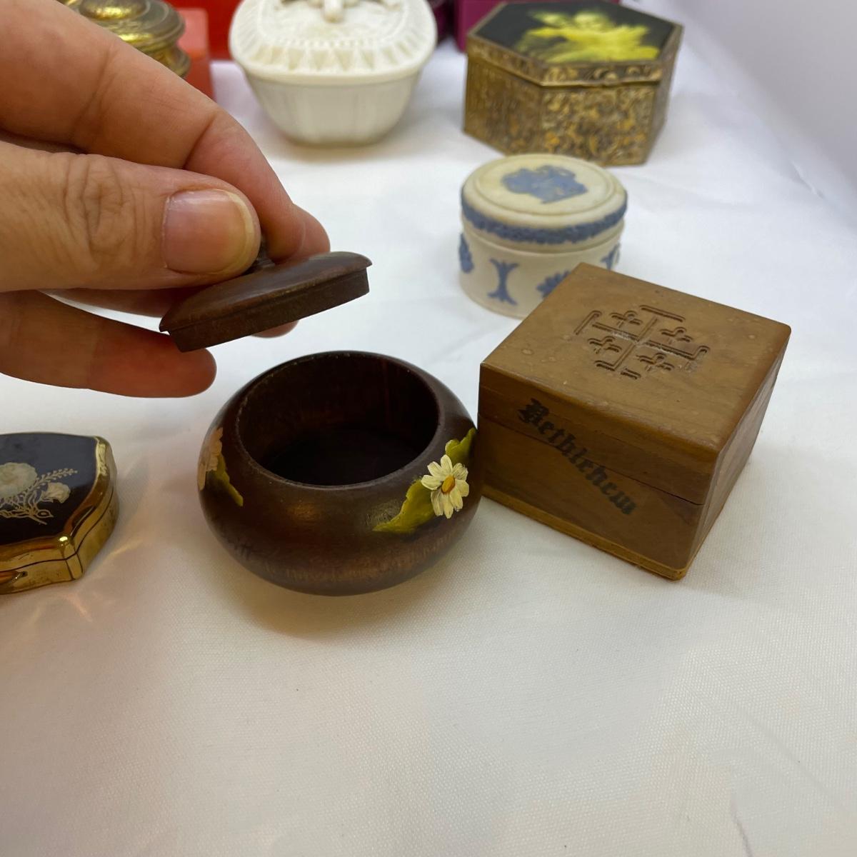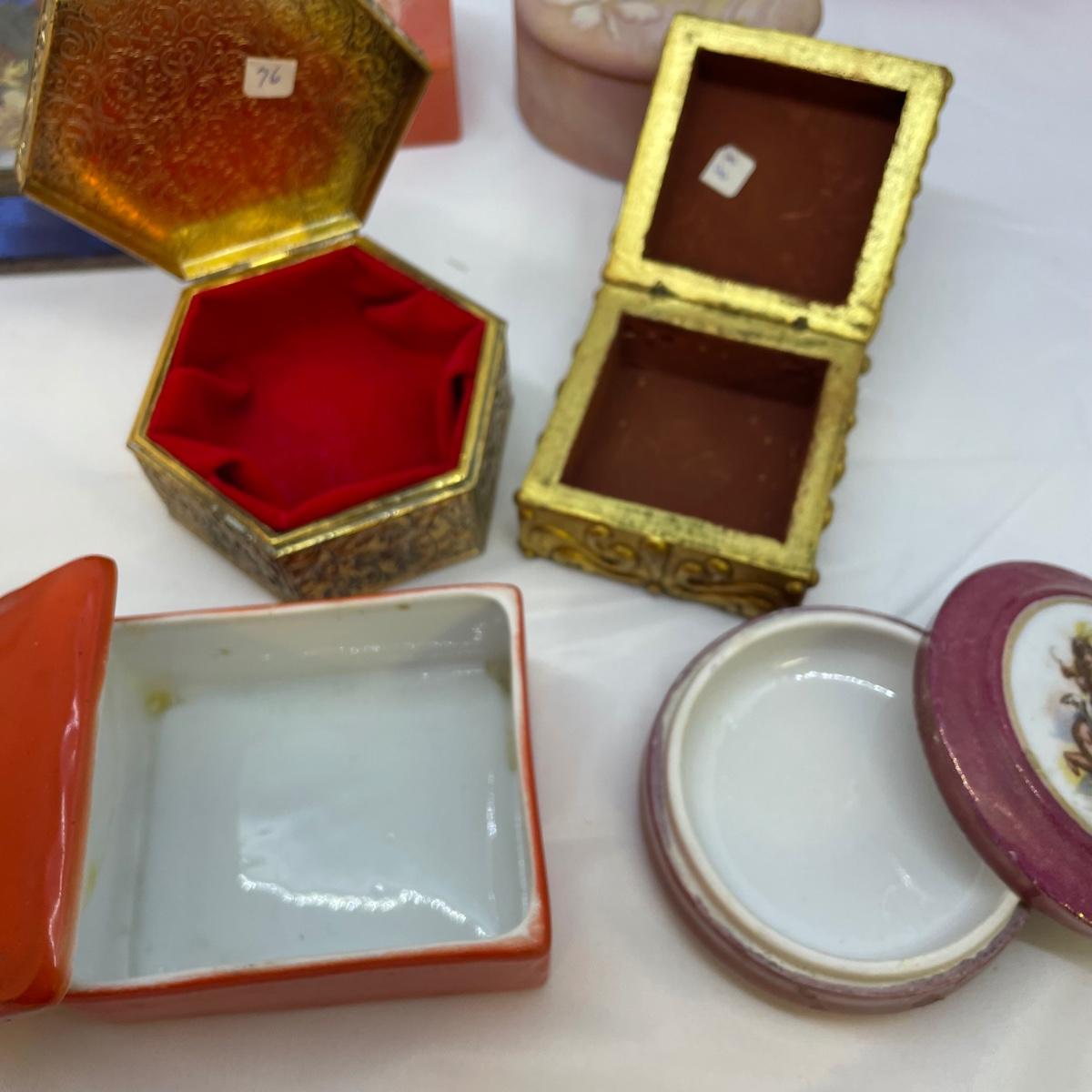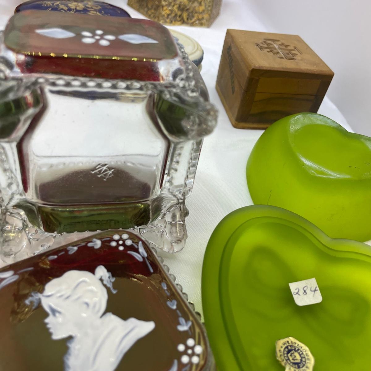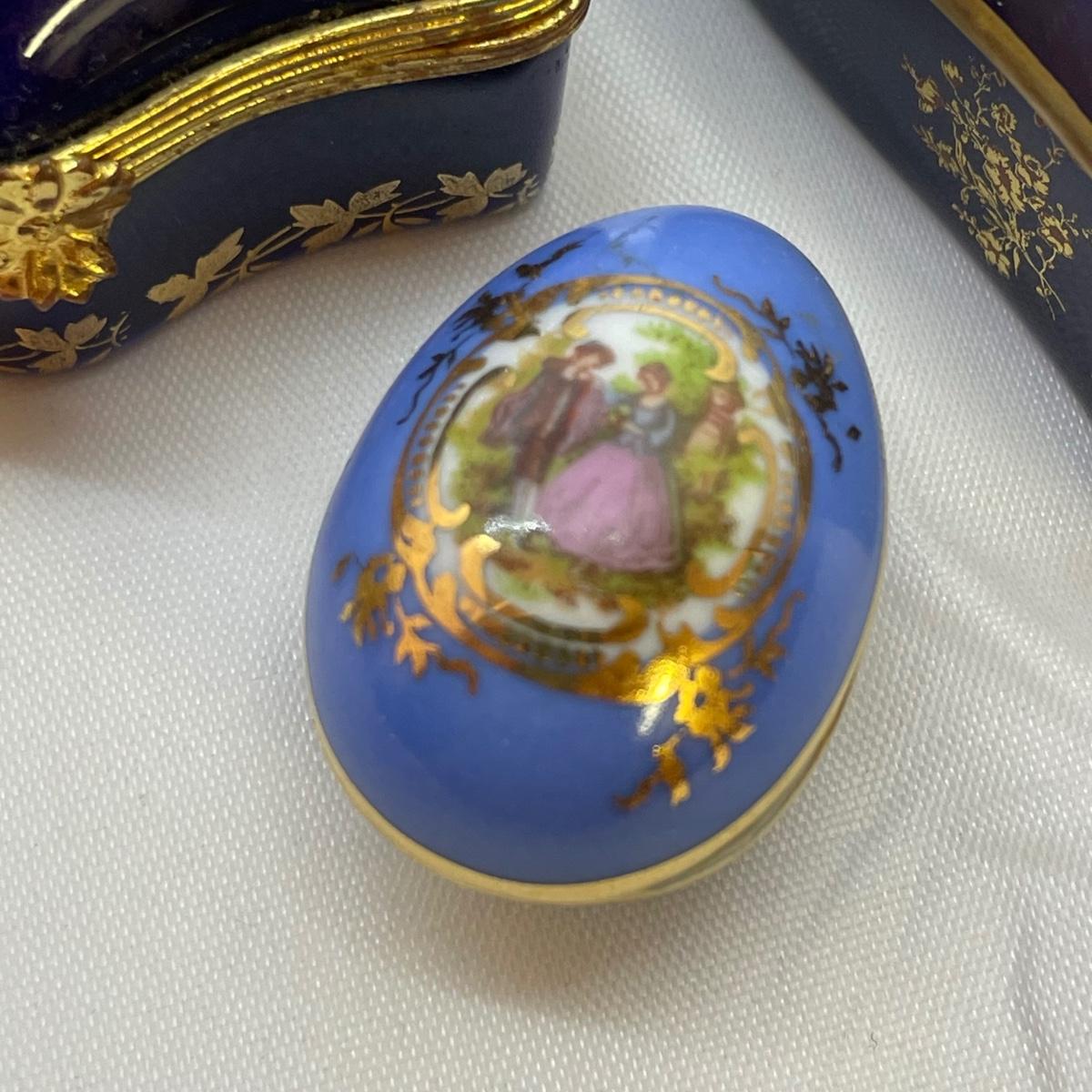 Large collection of classic and Victorian-style trinket boxes. Lot includes two Wedgwood, three marked Limoges, a couple that appear to be milk glass. The flower painted green heart and red/white silhouette-style are likely Westmoreland, the red box is signed. Materials range throughout porcelain, glass, wood, metal, upholstered, a couple are lined, most are not. The smallest Limoges egg is 1” x 1.5” x 1”H, the wooden music box that plays Greensleeves measures up 4.25” x 3.75” x 2.25”H. A round, footed metal box’s lid is no longer attached by its hinge. The butterfly box Design Gifts Intern’l Inc has an illegible signature on the top. See images. Shipping available.