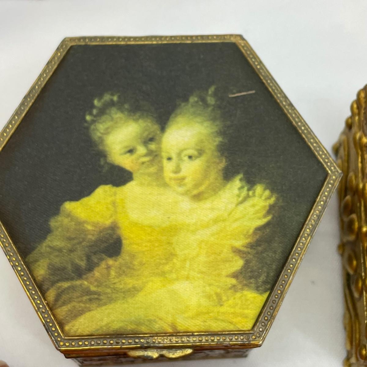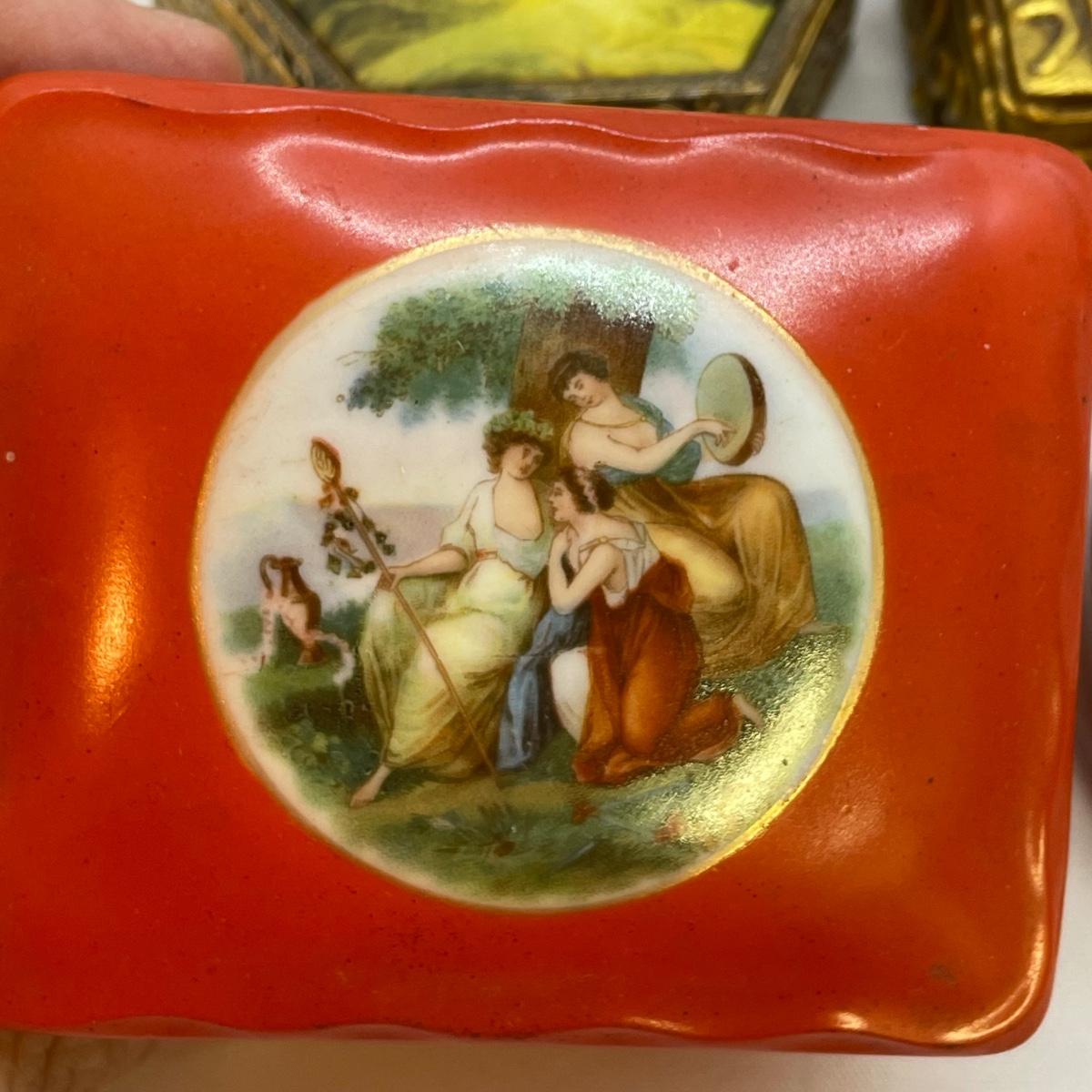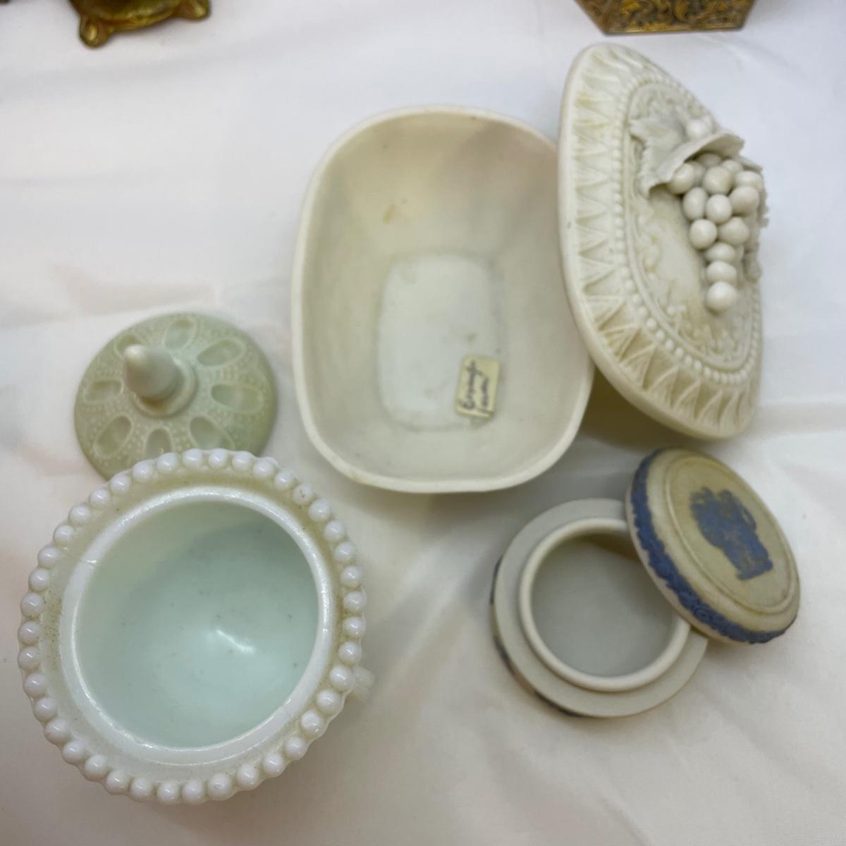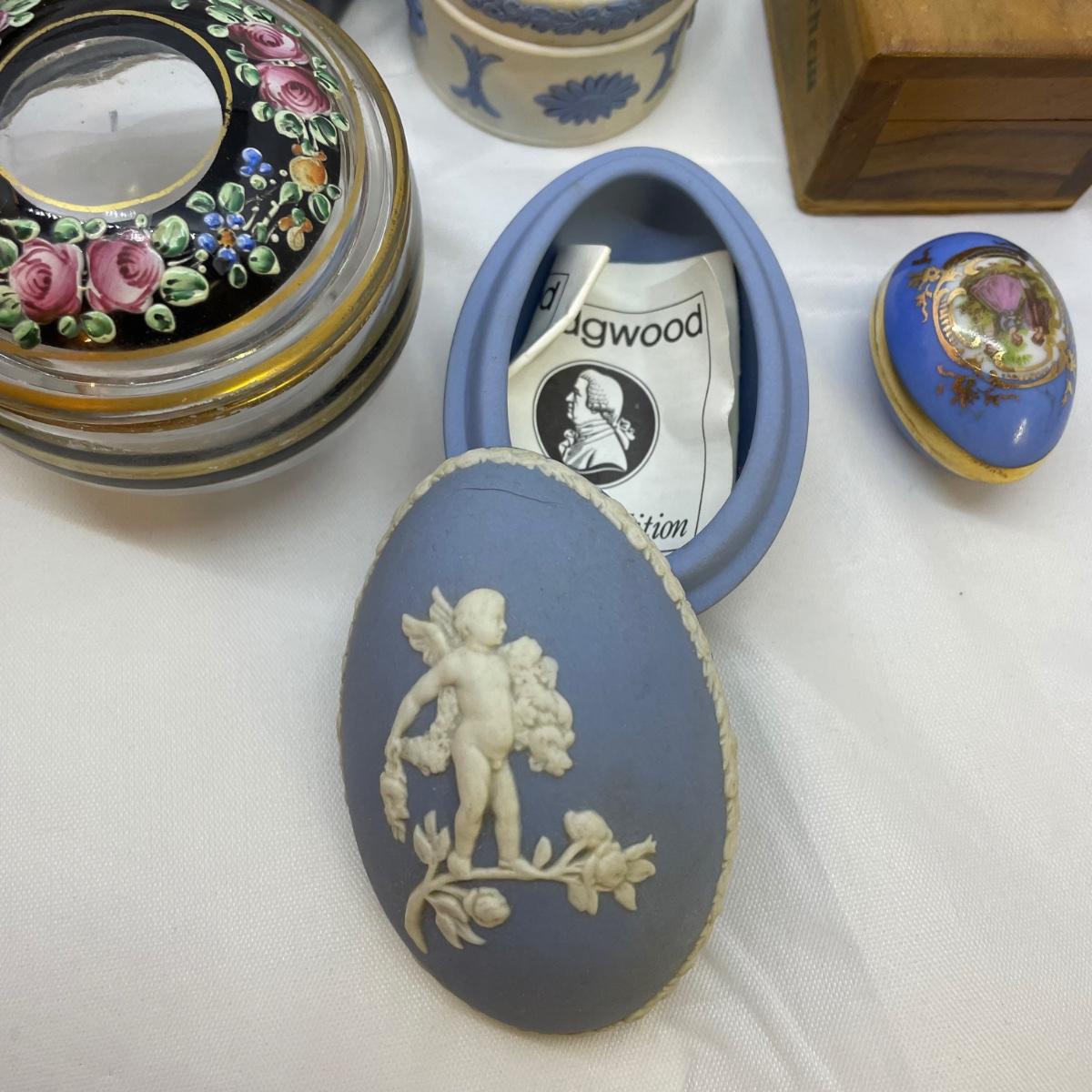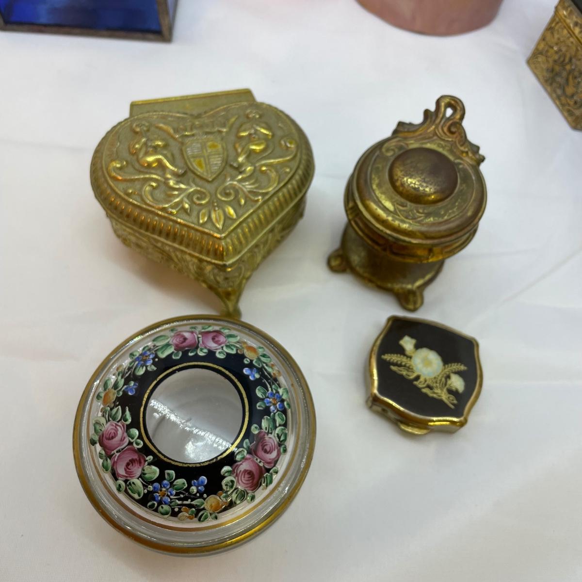 Large collection of classic and Victorian-style trinket boxes. Lot includes two Wedgwood, three marked Limoges, a couple that appear to be milk glass. The flower painted green heart and red/white silhouette-style are likely Westmoreland, the red box is signed. Materials range throughout porcelain, glass, wood, metal, upholstered, a couple are lined, most are not. The smallest Limoges egg is 1” x 1.5” x 1”H, the wooden music box that plays Greensleeves measures up 4.25” x 3.75” x 2.25”H. A round, footed metal box’s lid is no longer attached by its hinge. The butterfly box Design Gifts Intern’l Inc has an illegible signature on the top. See images. Shipping available.