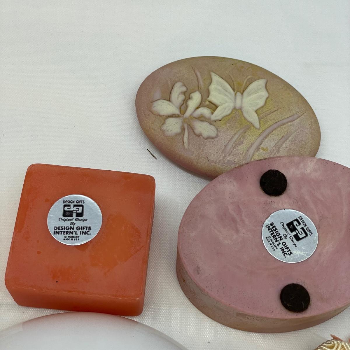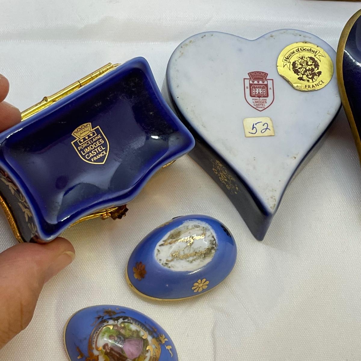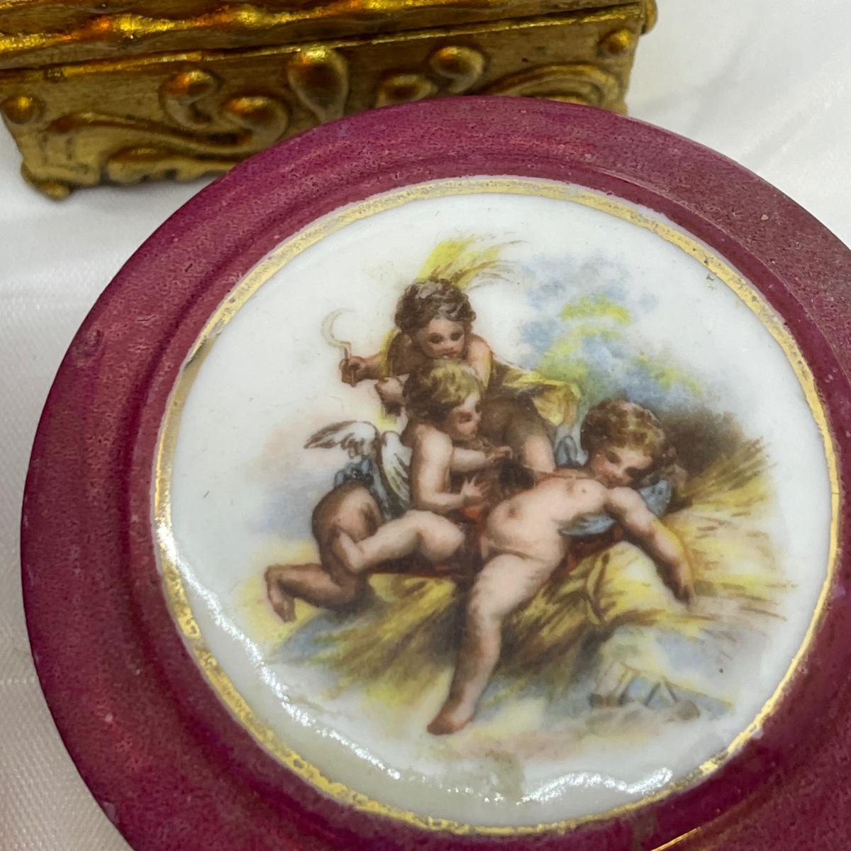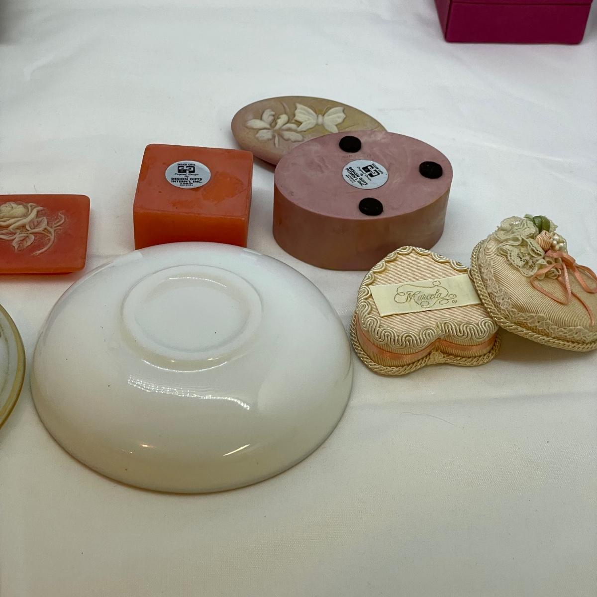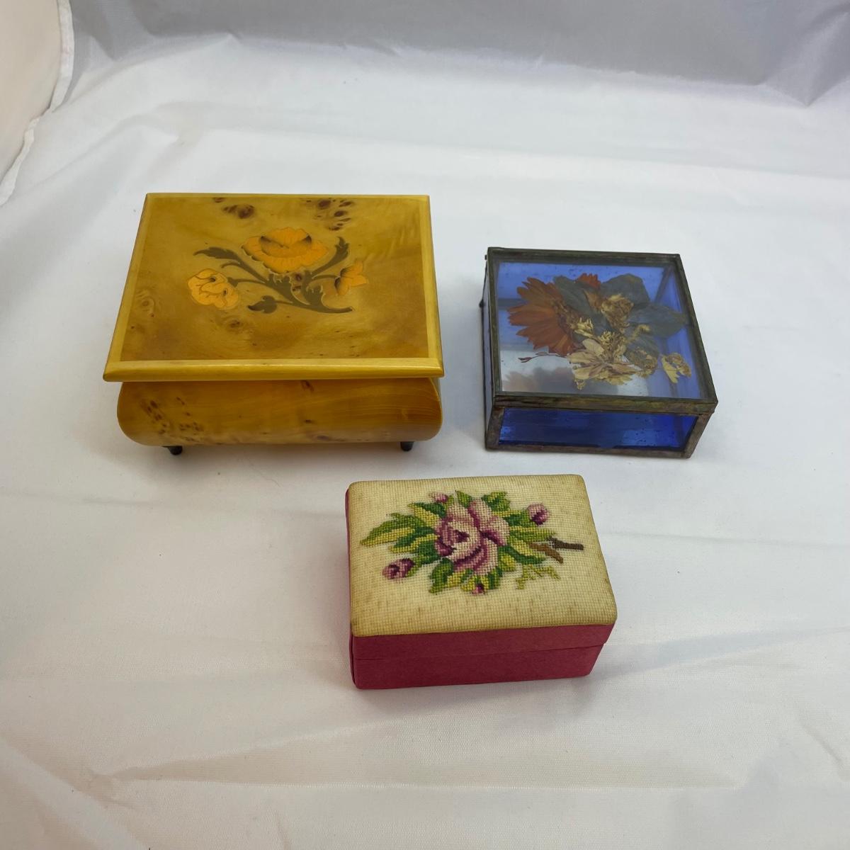 Large collection of classic and Victorian-style trinket boxes. Lot includes two Wedgwood, three marked Limoges, a couple that appear to be milk glass. The flower painted green heart and red/white silhouette-style are likely Westmoreland, the red box is signed. Materials range throughout porcelain, glass, wood, metal, upholstered, a couple are lined, most are not. The smallest Limoges egg is 1” x 1.5” x 1”H, the wooden music box that plays Greensleeves measures up 4.25” x 3.75” x 2.25”H. A round, footed metal box’s lid is no longer attached by its hinge. The butterfly box Design Gifts Intern’l Inc has an illegible signature on the top. See images. Shipping available.