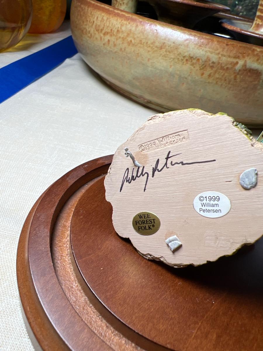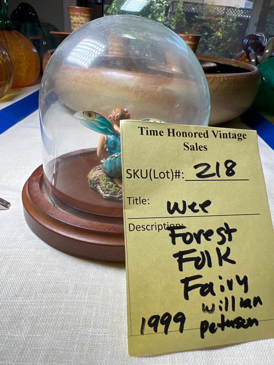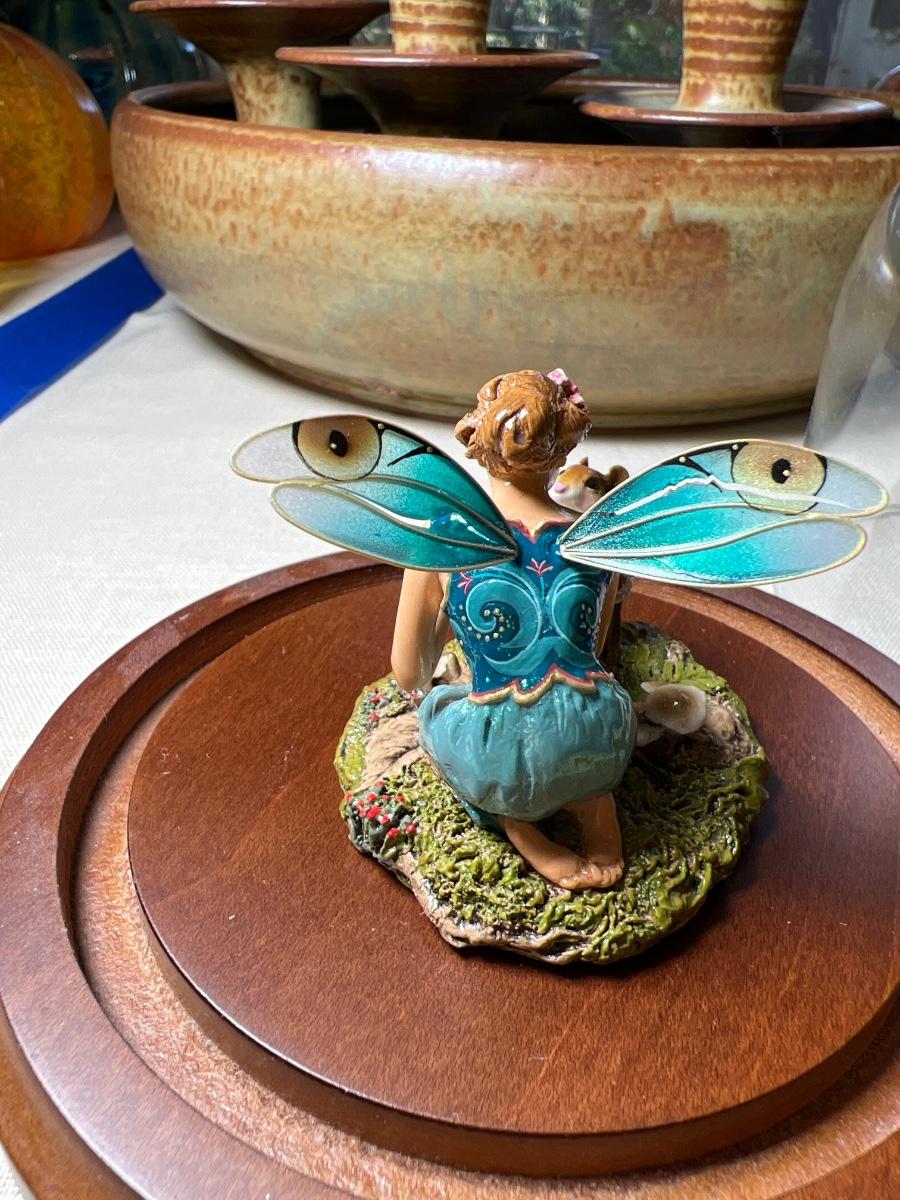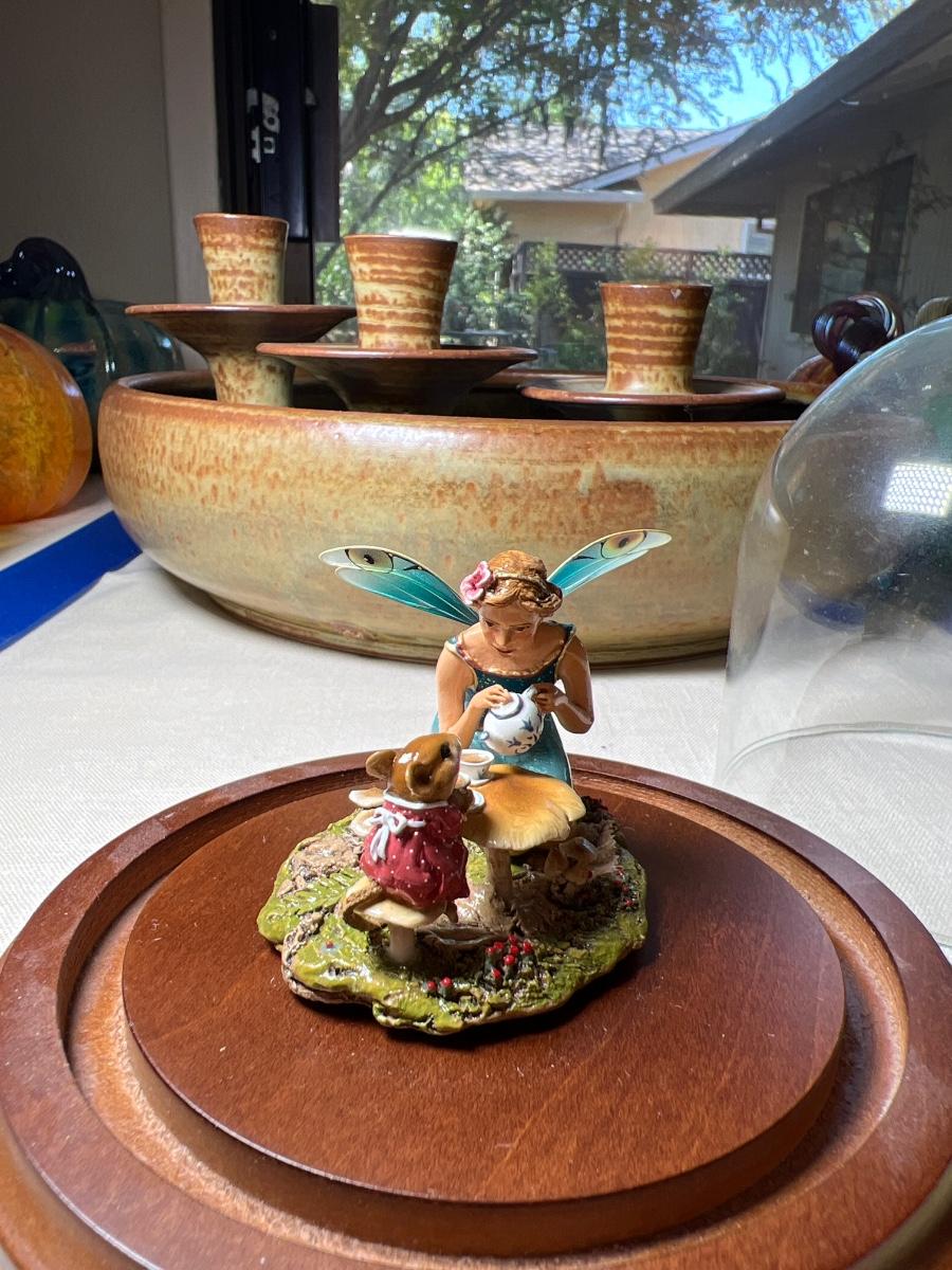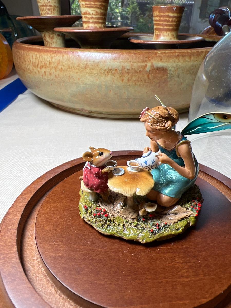 With glass covered case. This ceramic collectible is signed, shows a fairy pouring tea on a mushroom table for a tiny mouse.