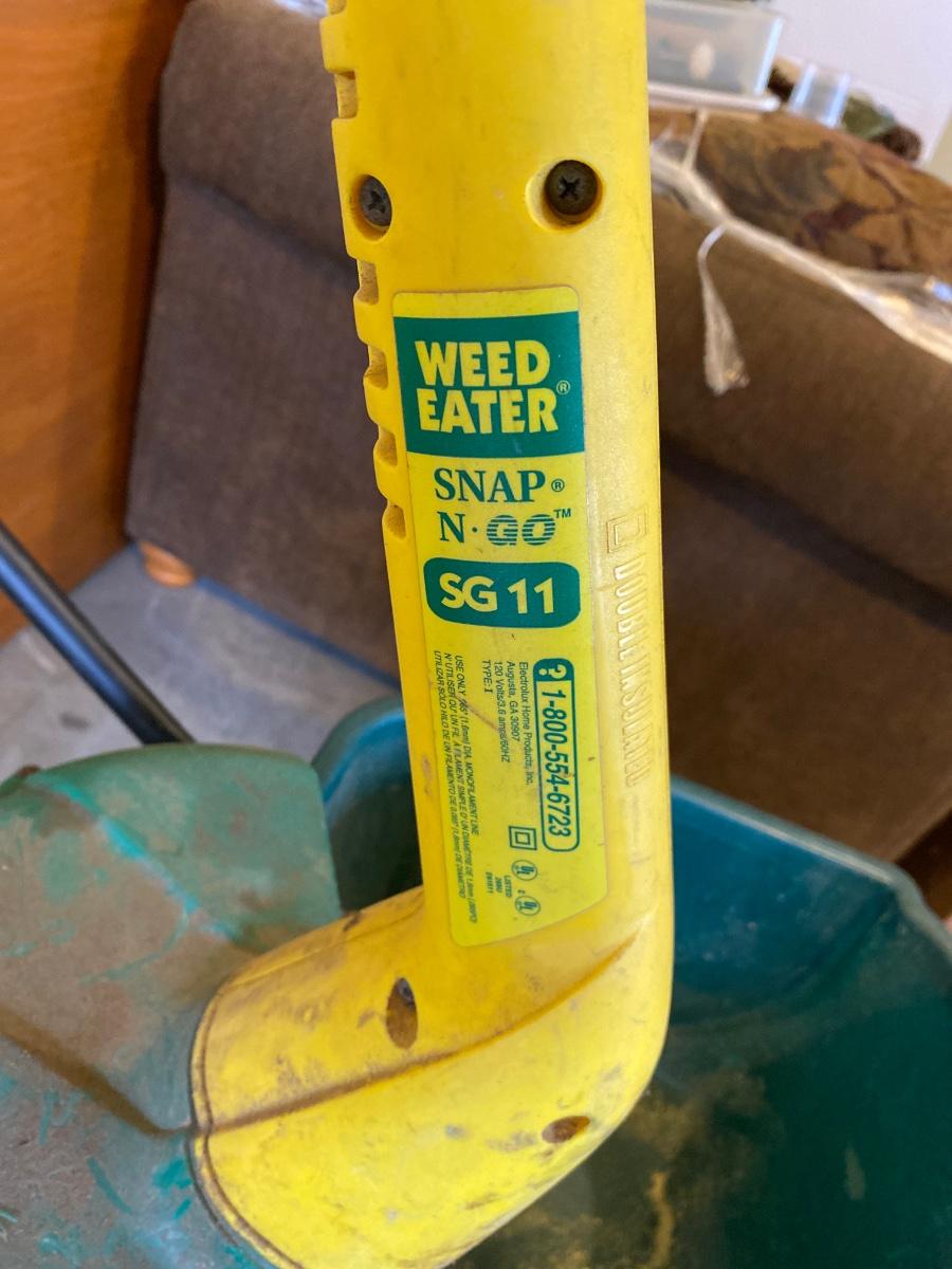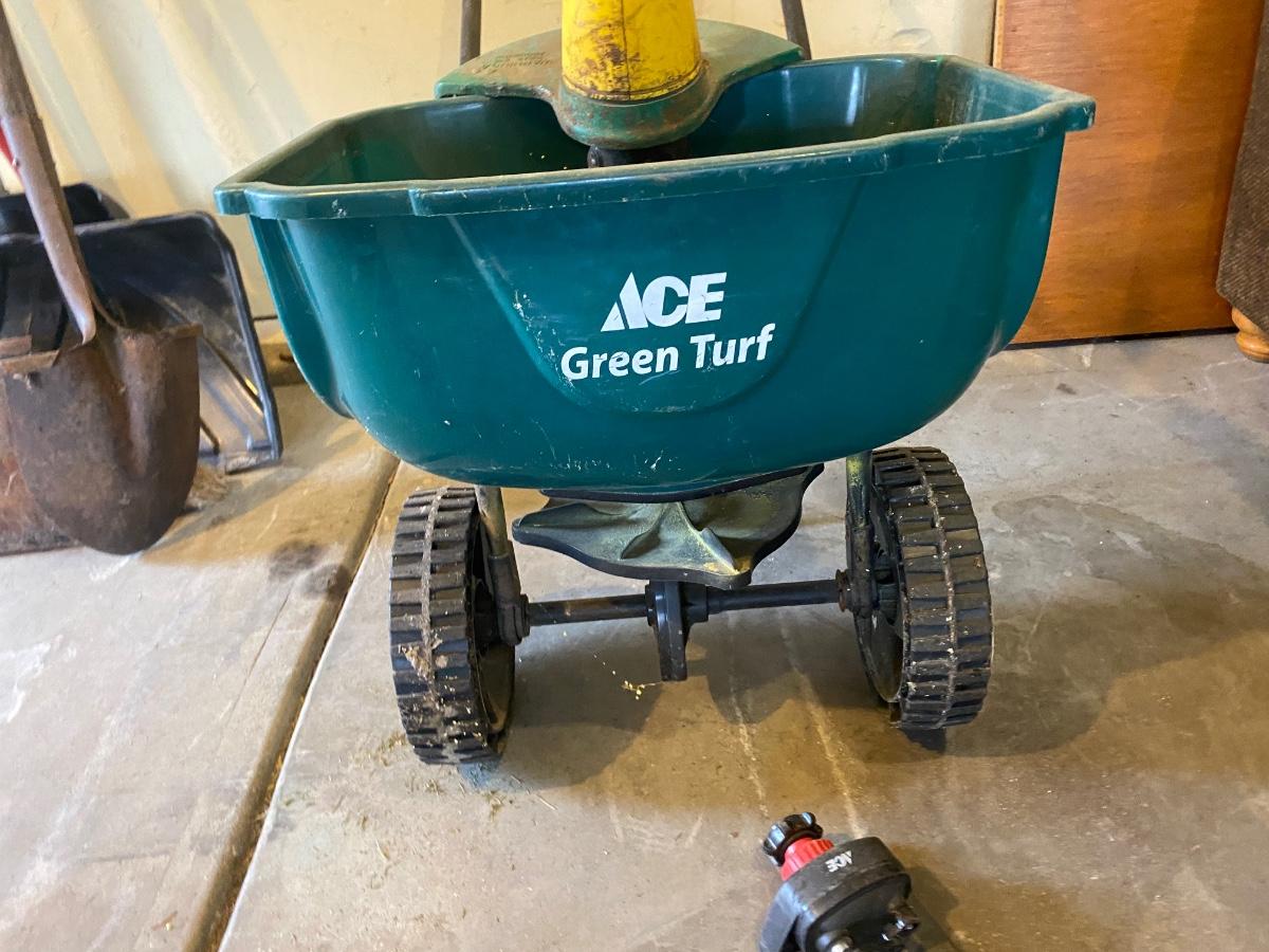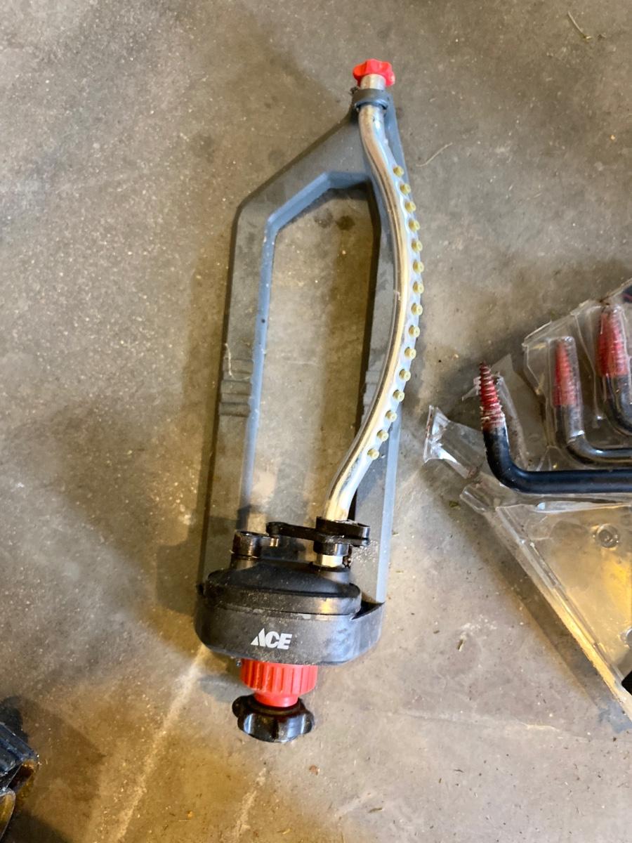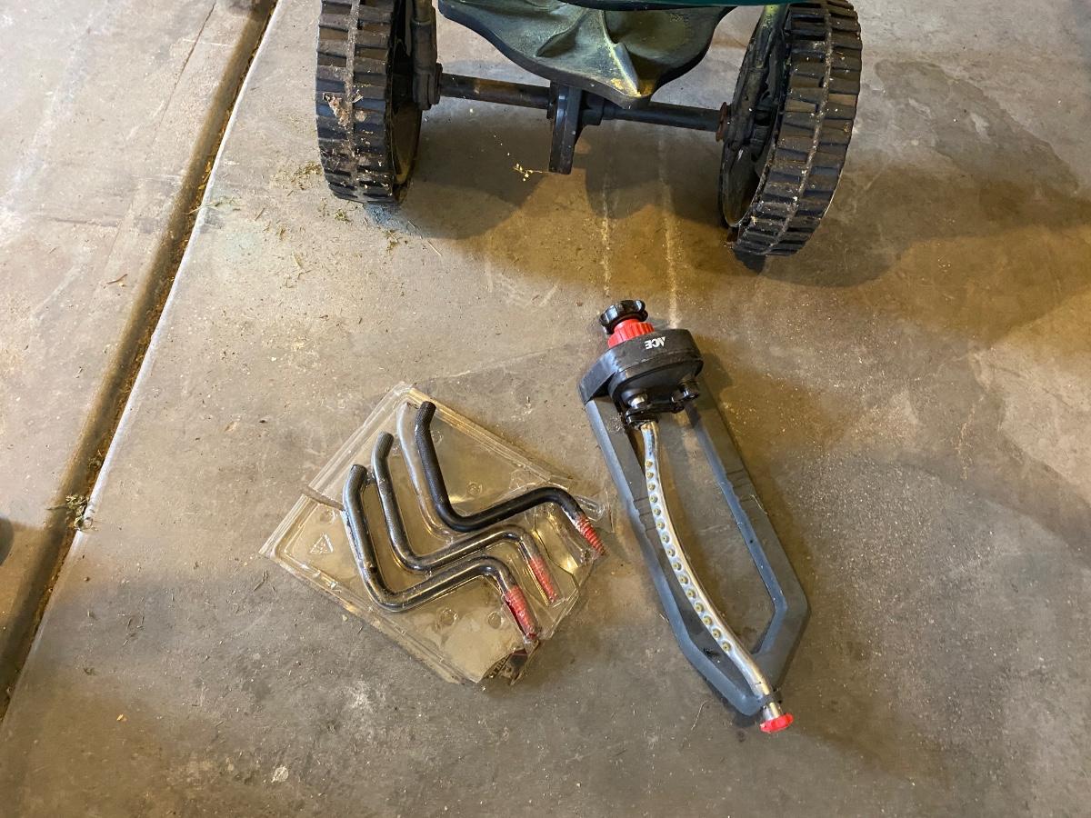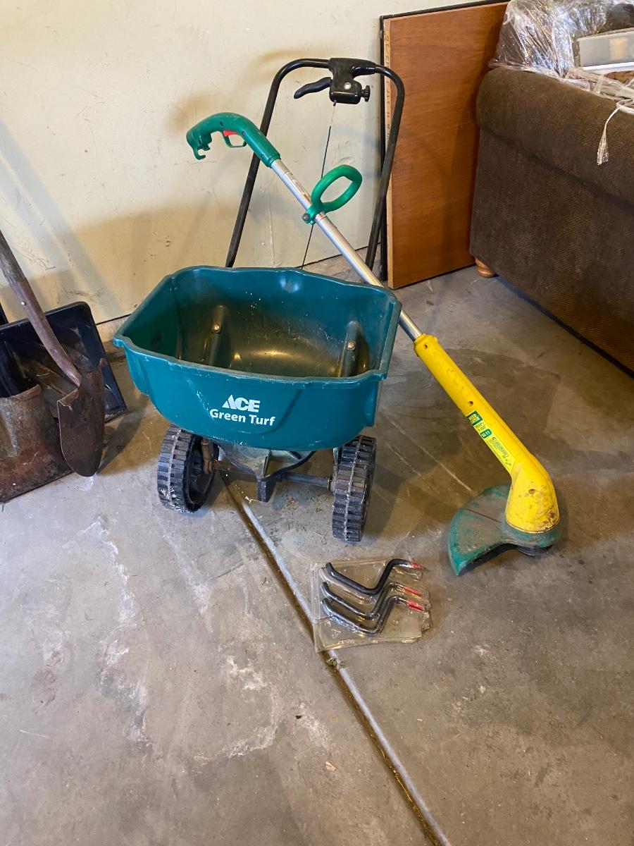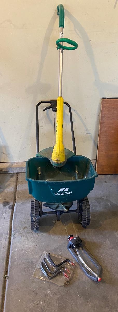 WEED EATER, FERTILIZER SPREADER, SPRINKLER & WALL HOOKS