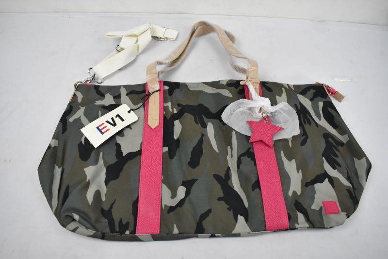 Weekender Bag, Camo with Pink Accents, by EV1. Star Detail, Shoulder Strap & Handle - New