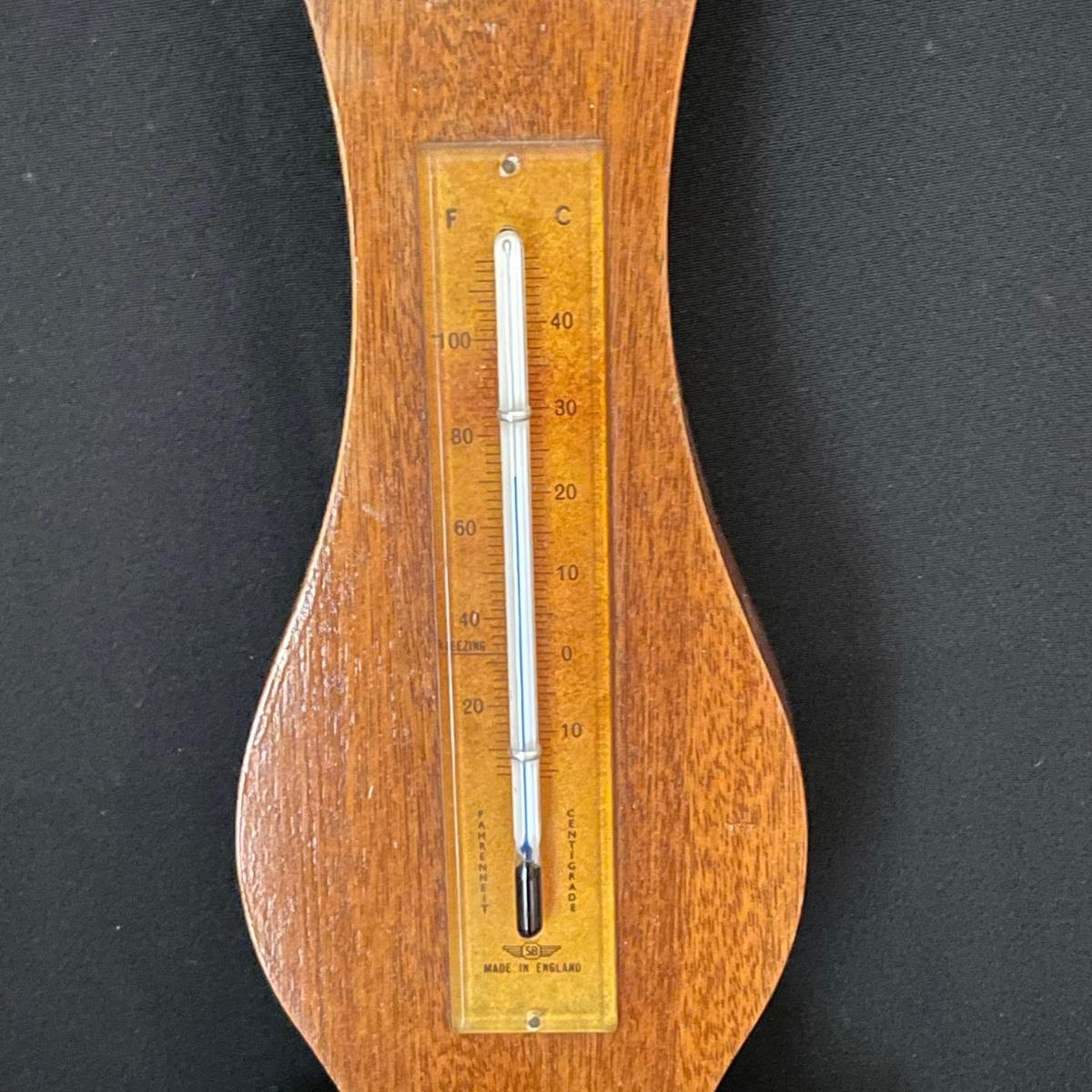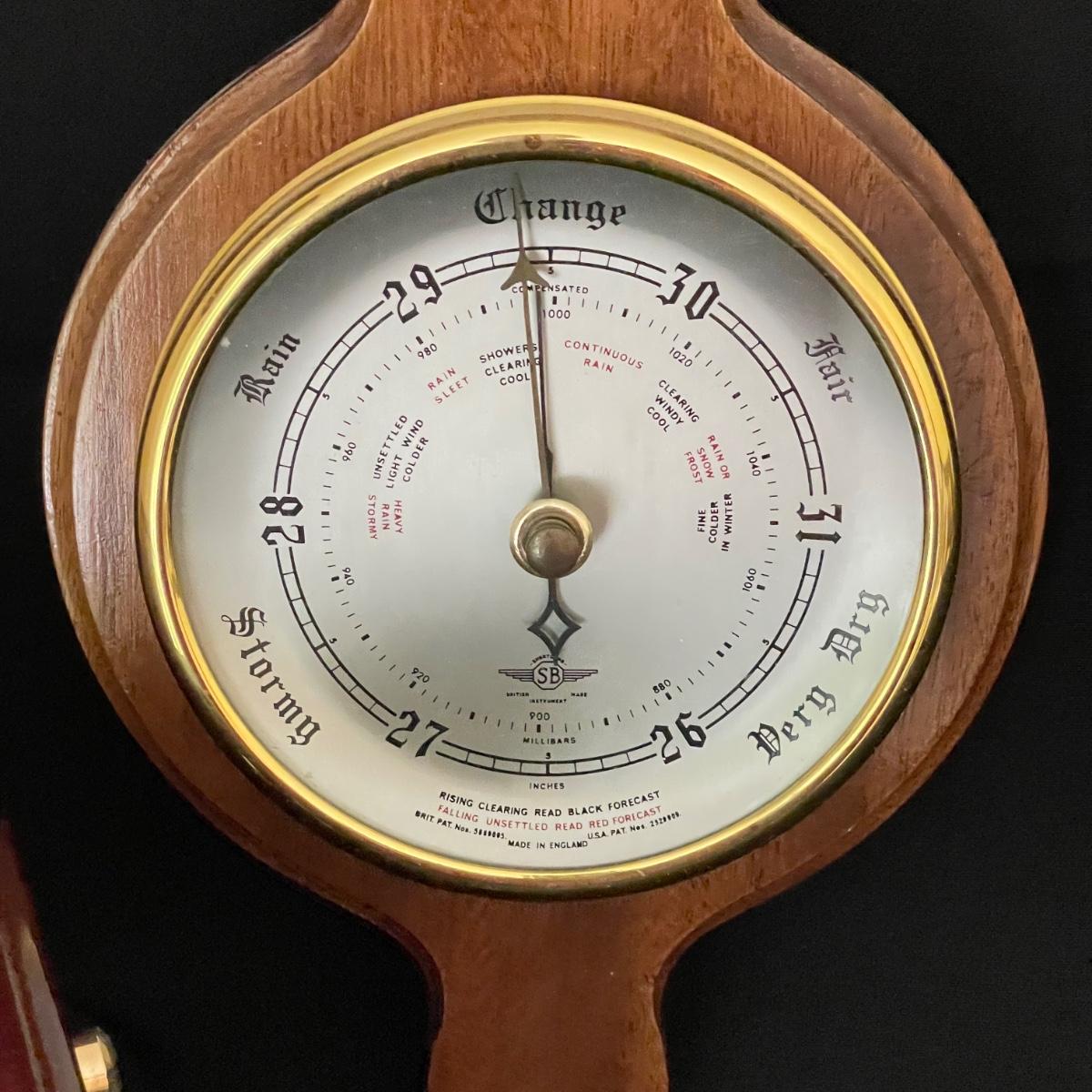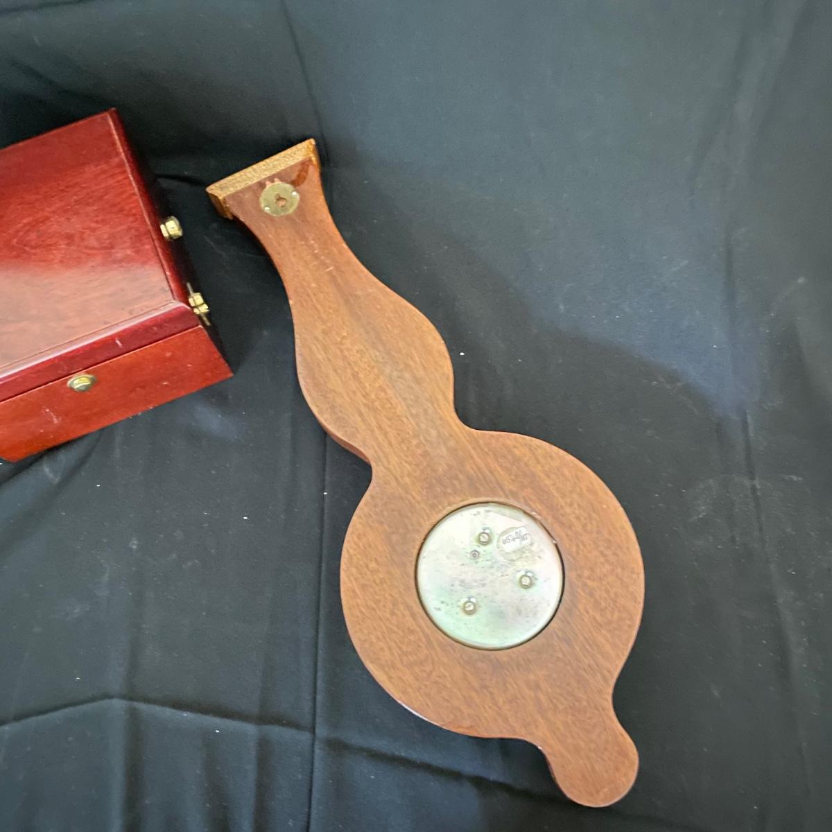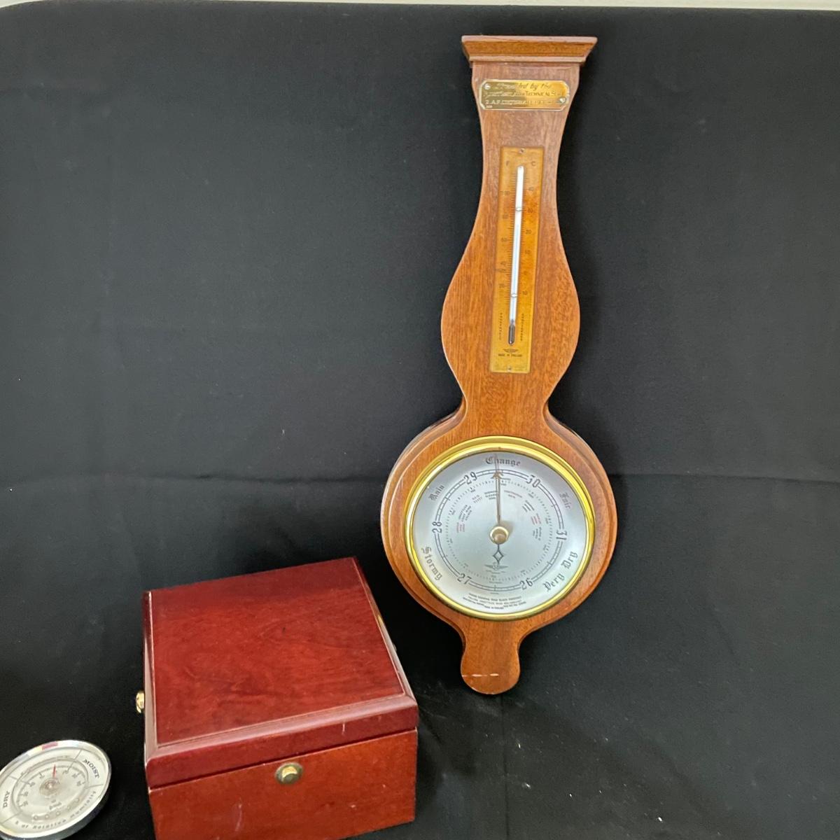 Weems & Plath Gimbal Box Clock for sea travel measures approximately 5.5”sq x 4”. Shortland barometer is 17” long and the British Rototherm has a 2.75” diameter. Both the clock and the barometer have engraved placards, the barometer’s dates back to 1966-68. See images. Items were not tested for accuracy. Shipping available.