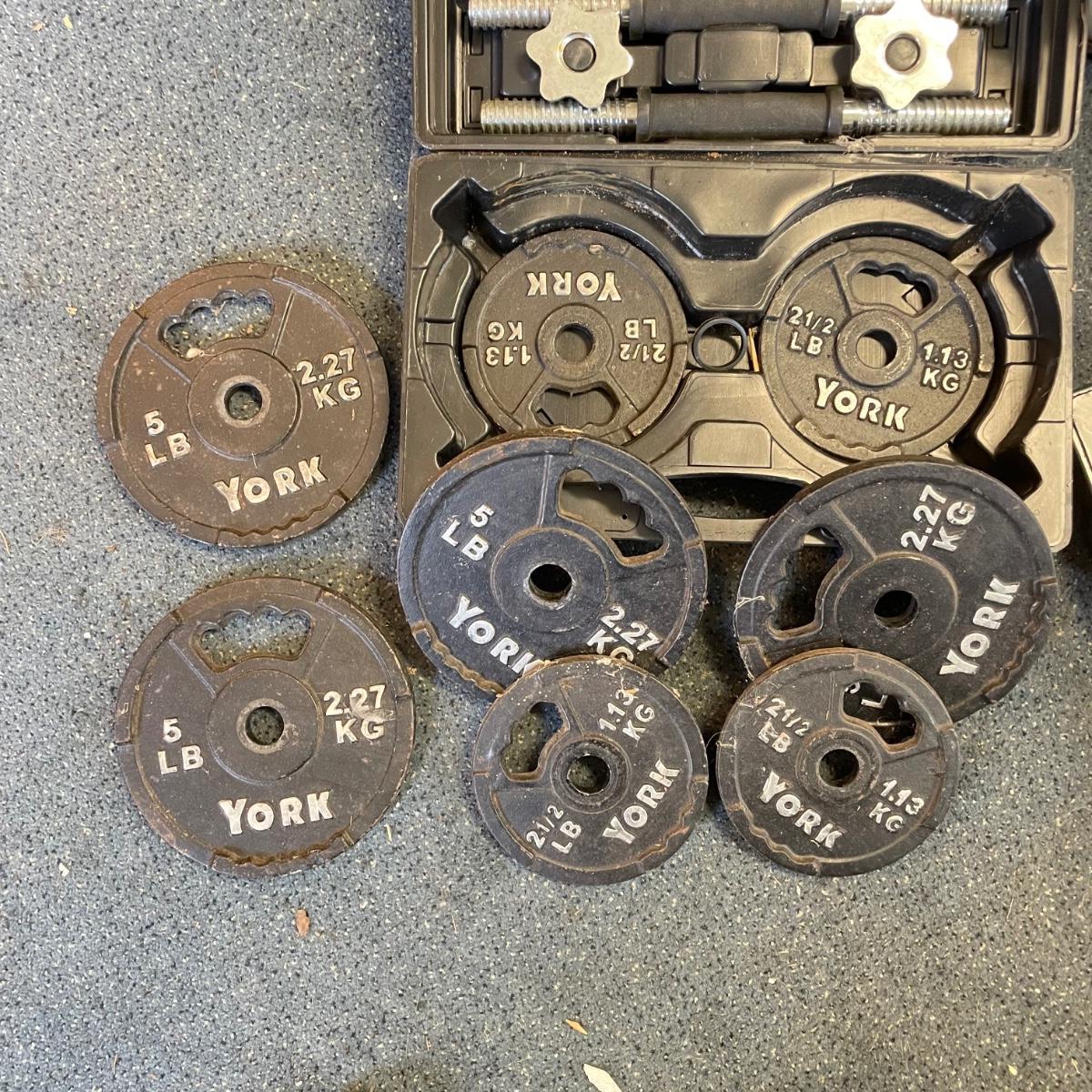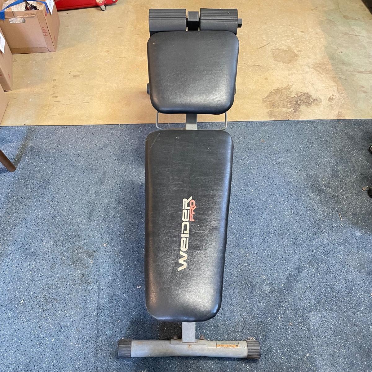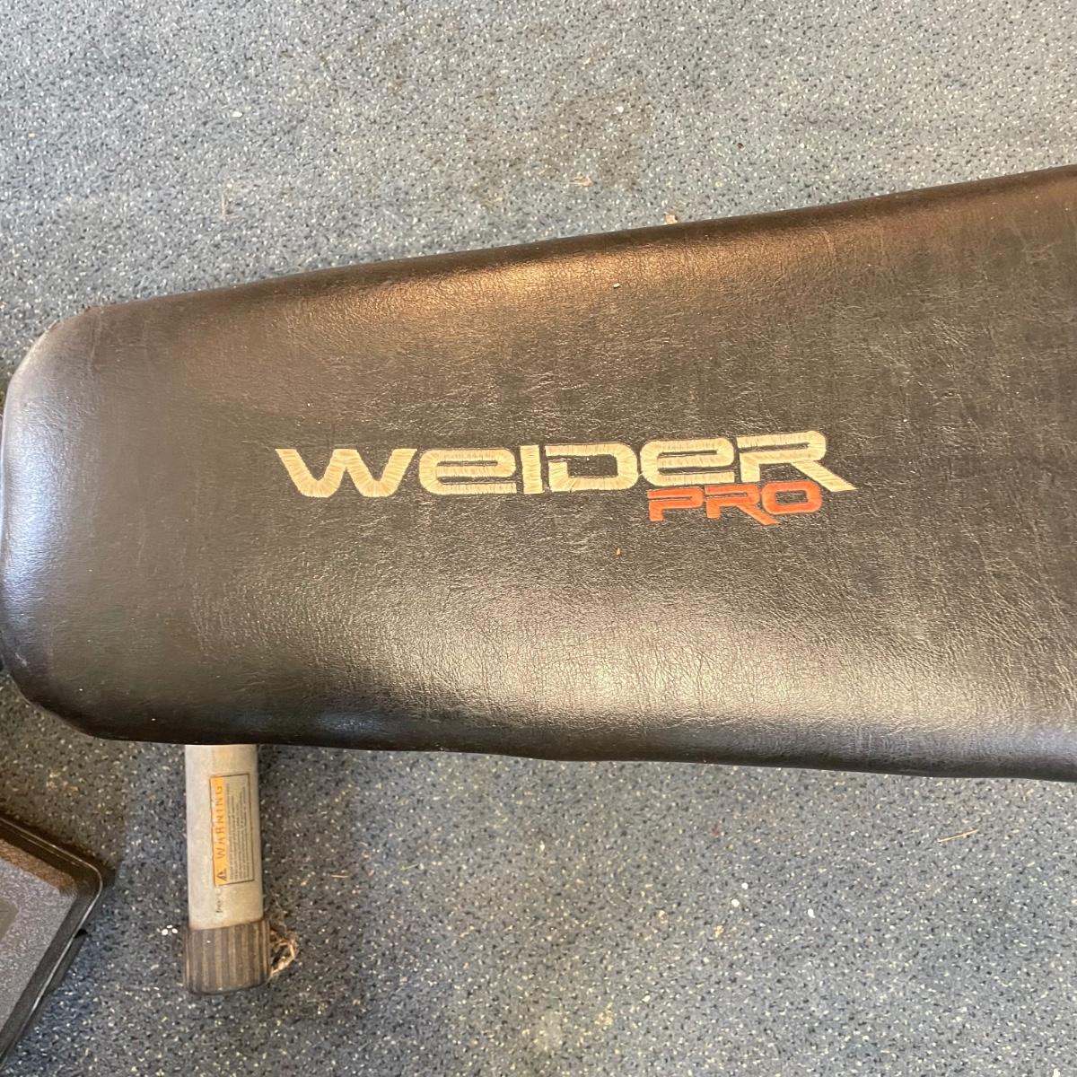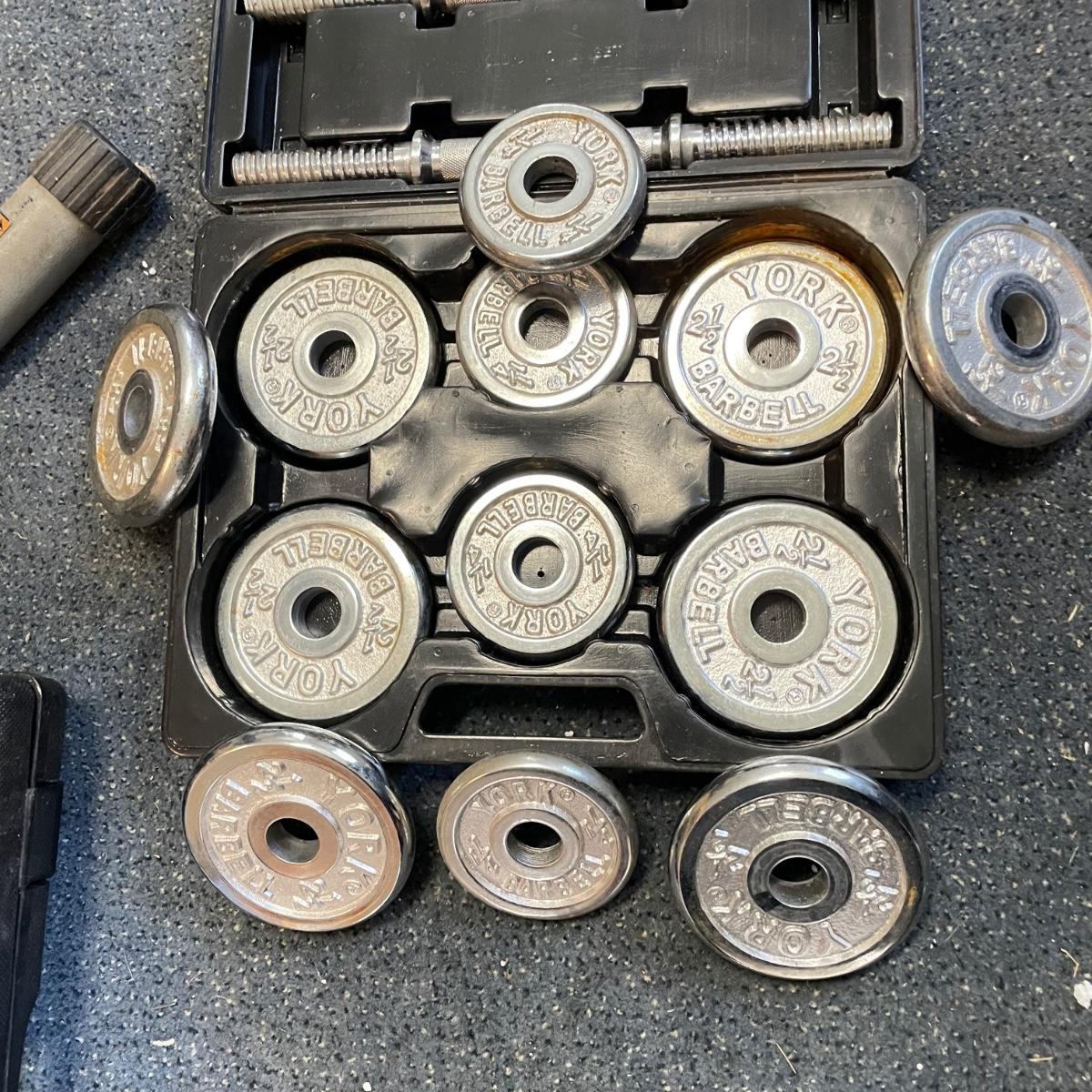 Weider Pro bench has adjustable ergonomic settings, it needs some cleaning but appears to be sturdy. Lot also includes two York dumbbell sets- one has 30lbs of chrome plated plates, the other has 40lbs of cast iron plates. See images. Bench has a metal body with foam supports and a leather-like seat. As shown in photos the bench has some peeling on the underside. It measures 54” x 19” x 22”H. Local pick up only.
