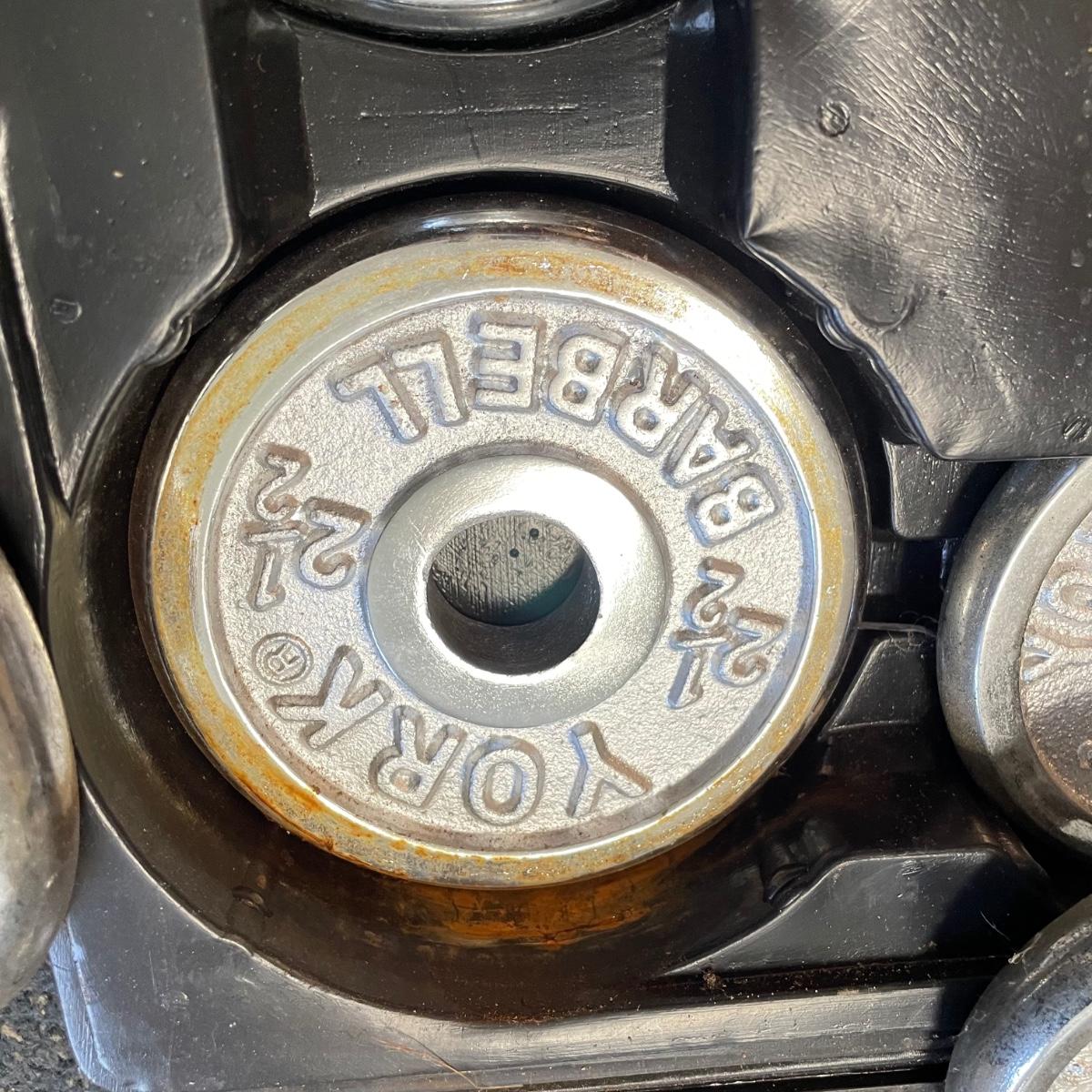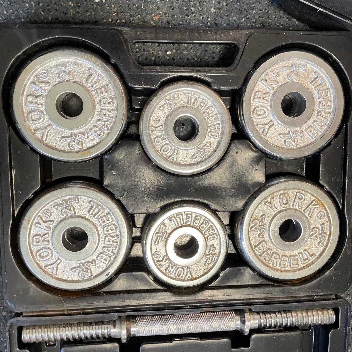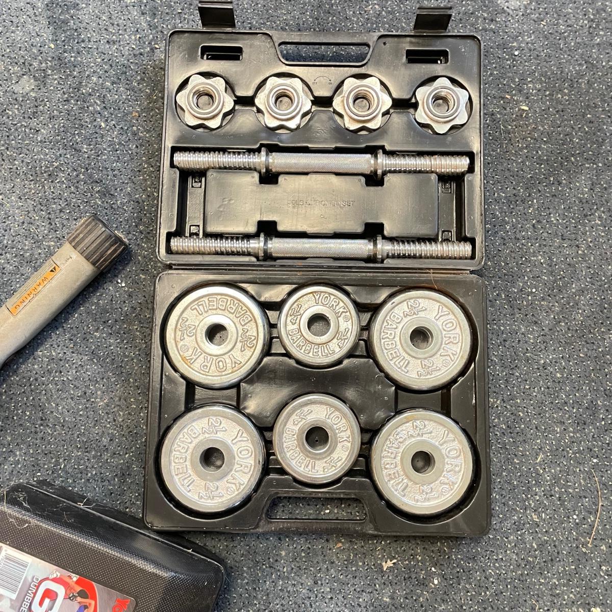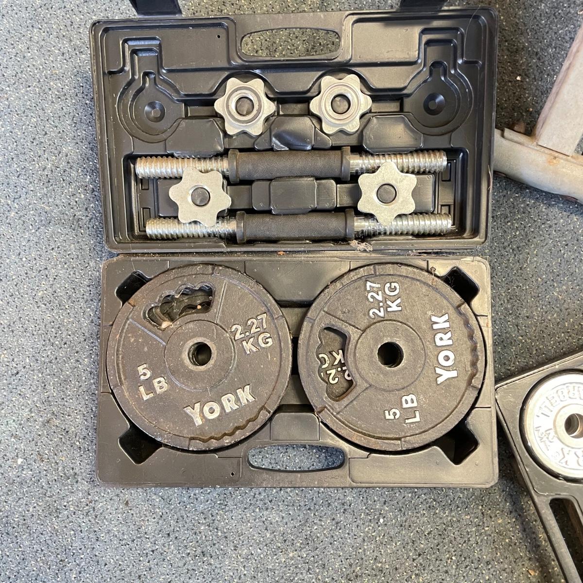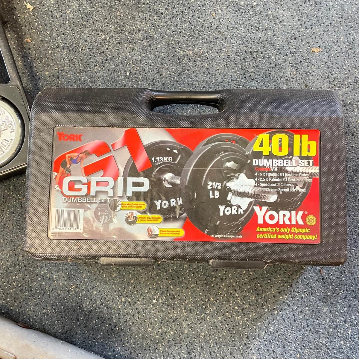 Weider Pro bench has adjustable ergonomic settings, it needs some cleaning but appears to be sturdy. Lot also includes two York dumbbell sets- one has 30lbs of chrome plated plates, the other has 40lbs of cast iron plates. See images. Bench has a metal body with foam supports and a leather-like seat. As shown in photos the bench has some peeling on the underside. It measures 54” x 19” x 22”H. Local pick up only.
