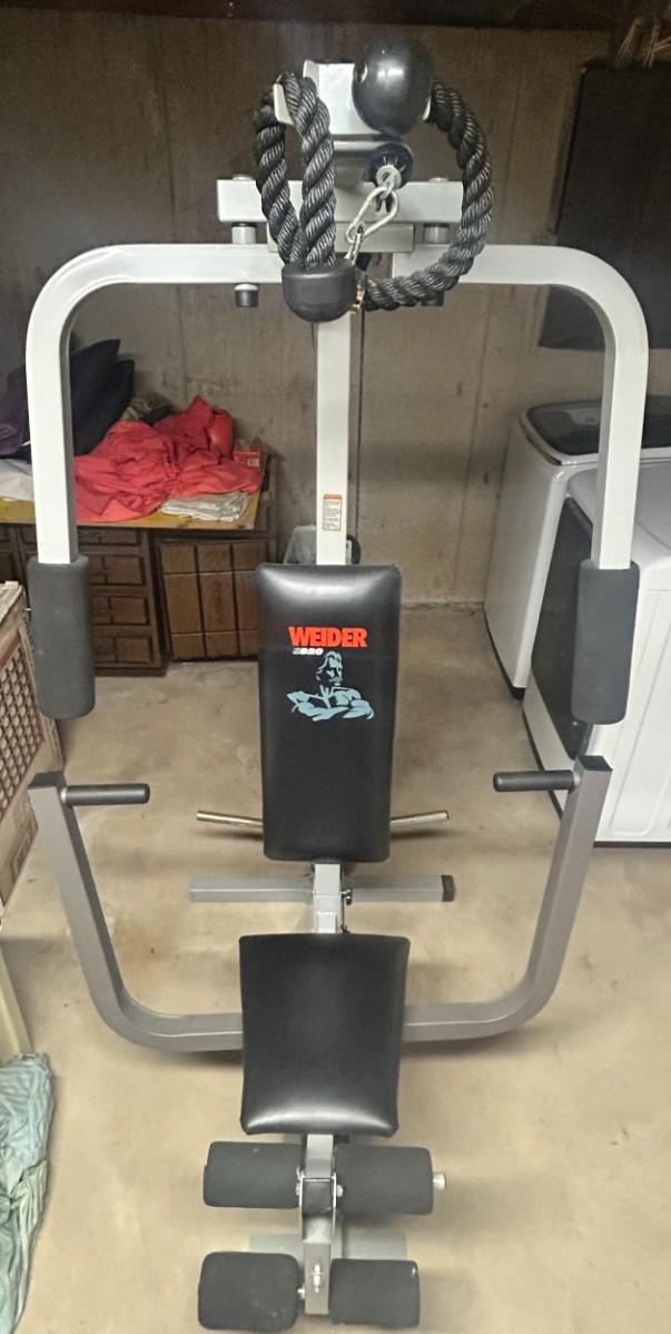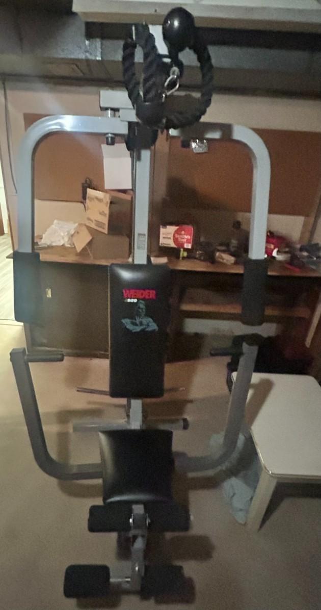 This multiuse home gym is in excellent condition and comes with weights shown. It will need to be brought up from basement for pickup.