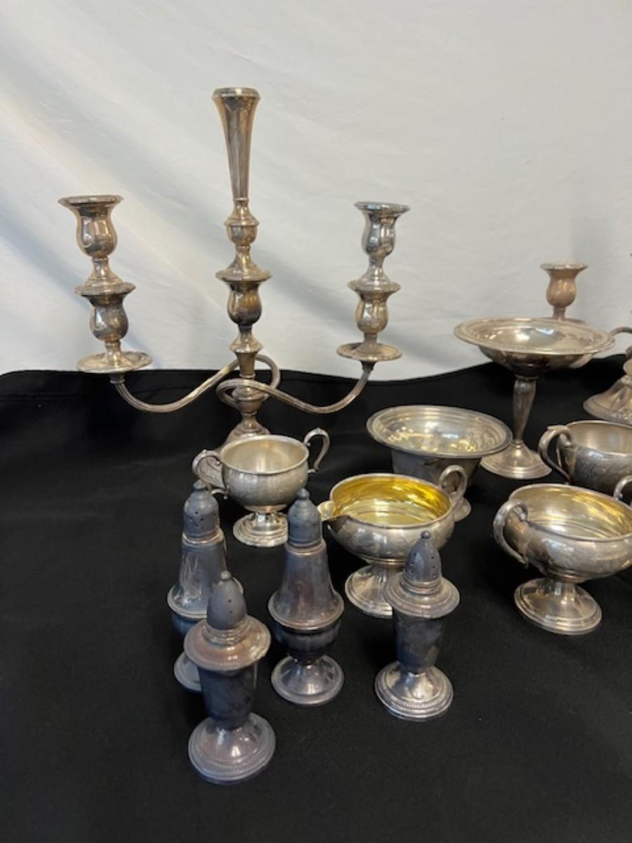 Includes candelabras, bowls, creamer, sugar bowl, and more. Total of 15 pieces. Measurement of largest: 15"H. [EC]