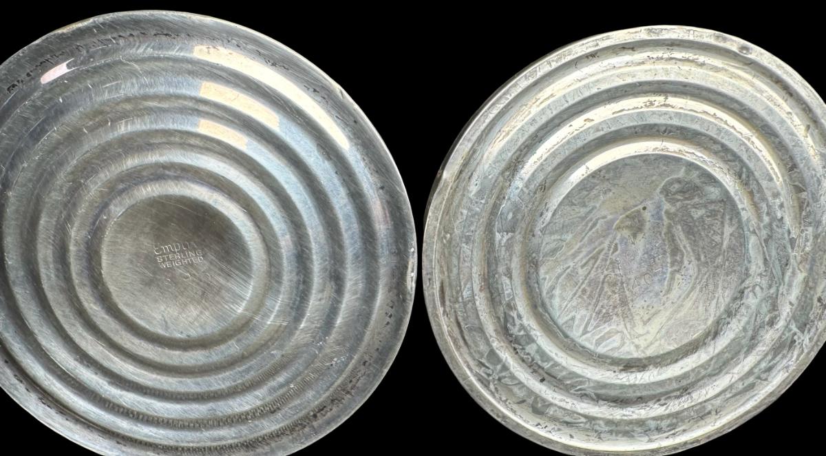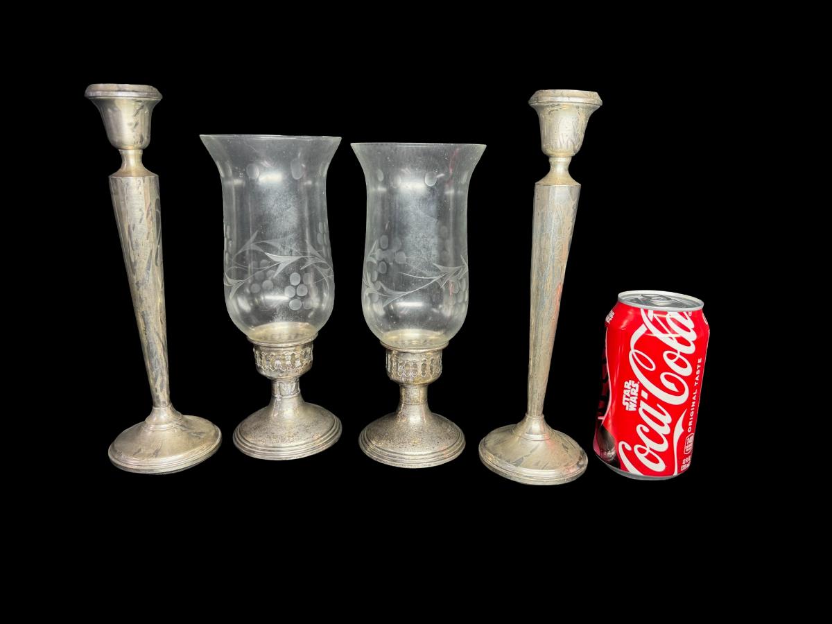 Includes a pair of Duchin of NYC etched clear glass shades on sterling bases; and a pair of KMK sterling candlesticks. All have weighted bases. Age related wear. [JL]