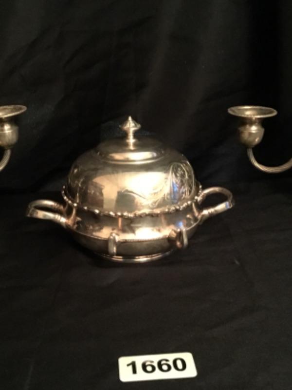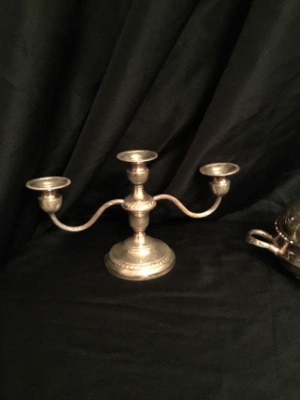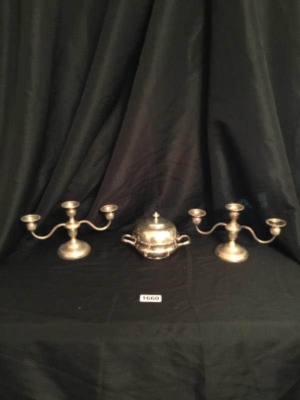 Weighted sterling silver candelabras and small silver plated dish lot 1660