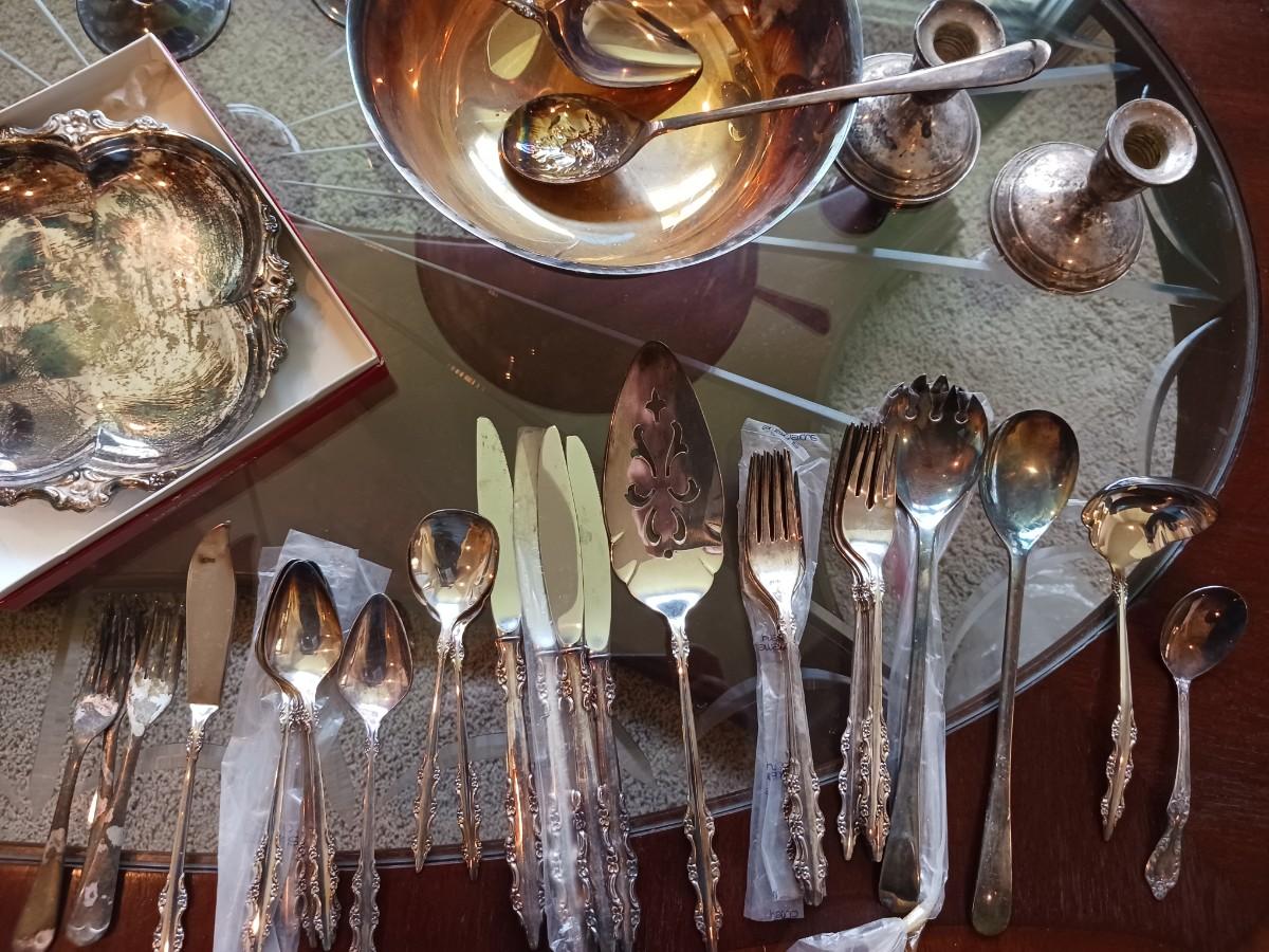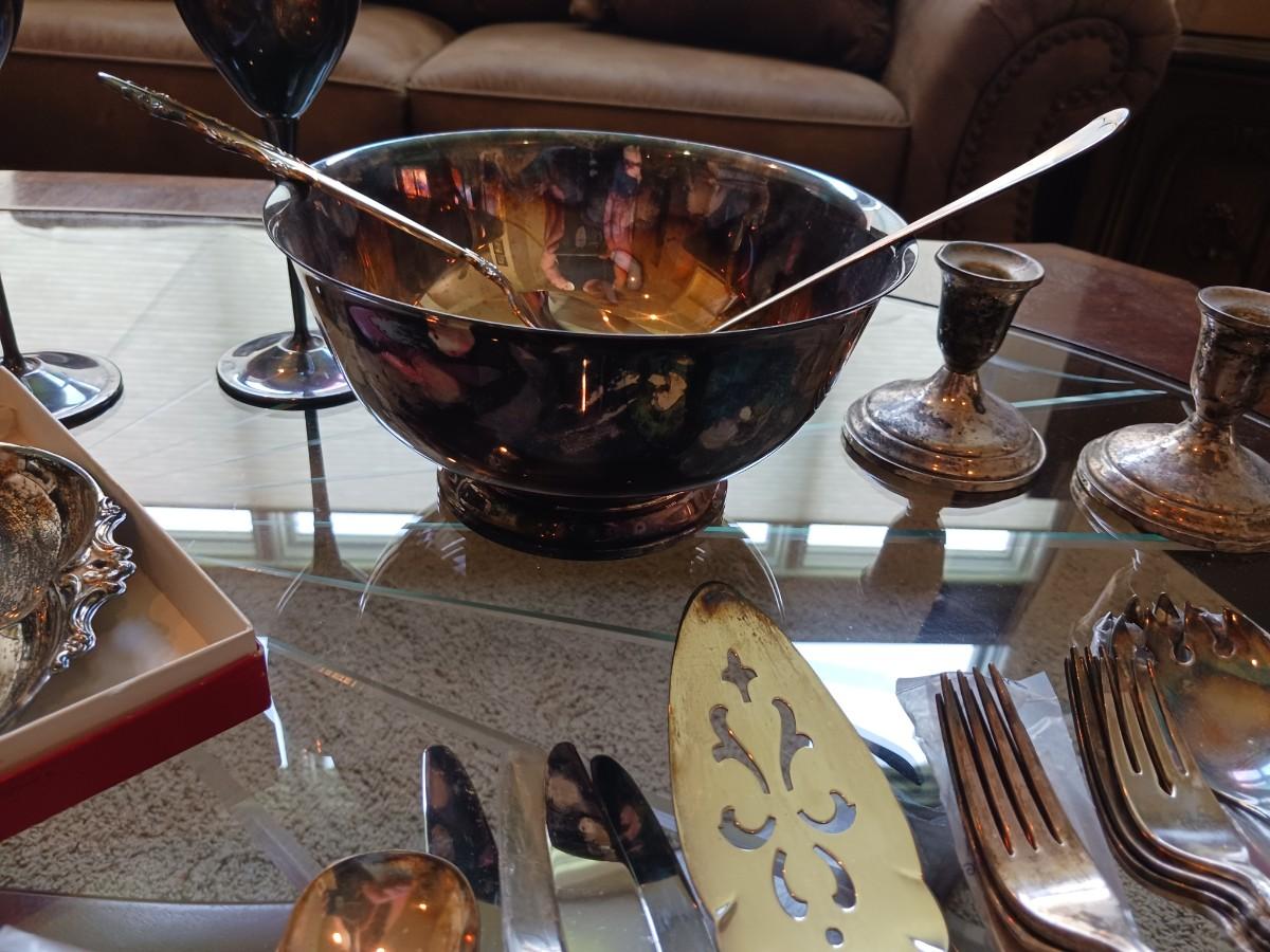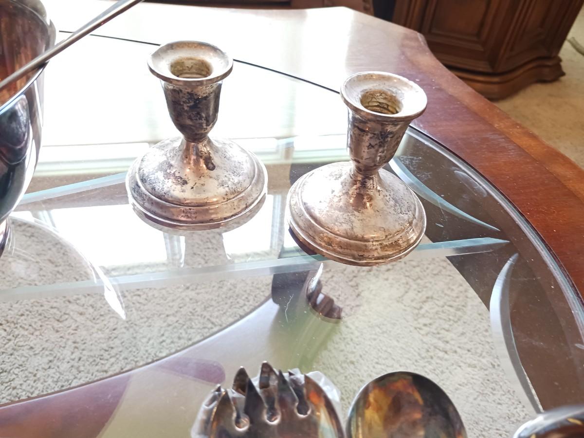 WEIGHTED STERLING SILVER CANDLE HOLDERS AND SILVER PLATED SERVING PIECES