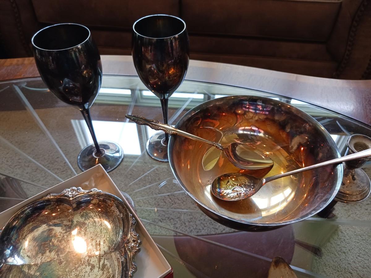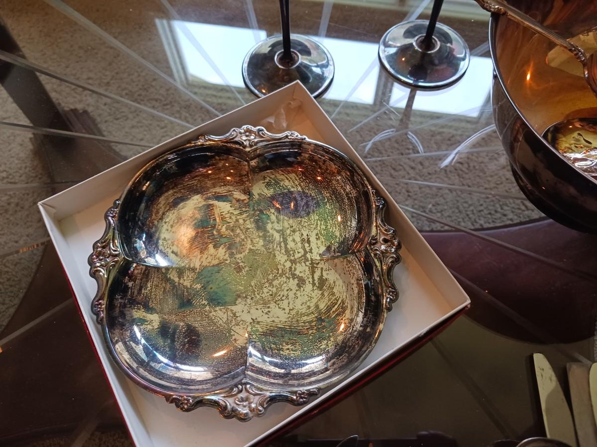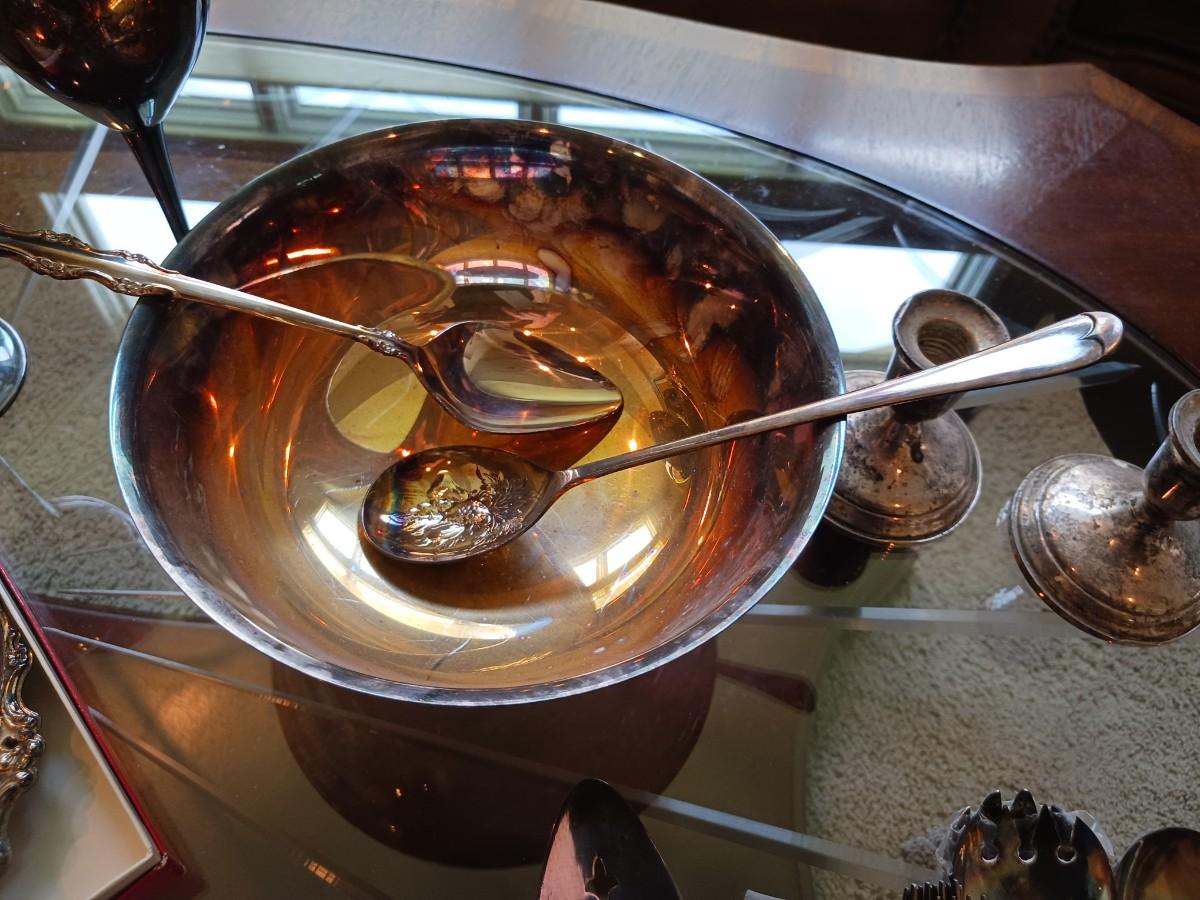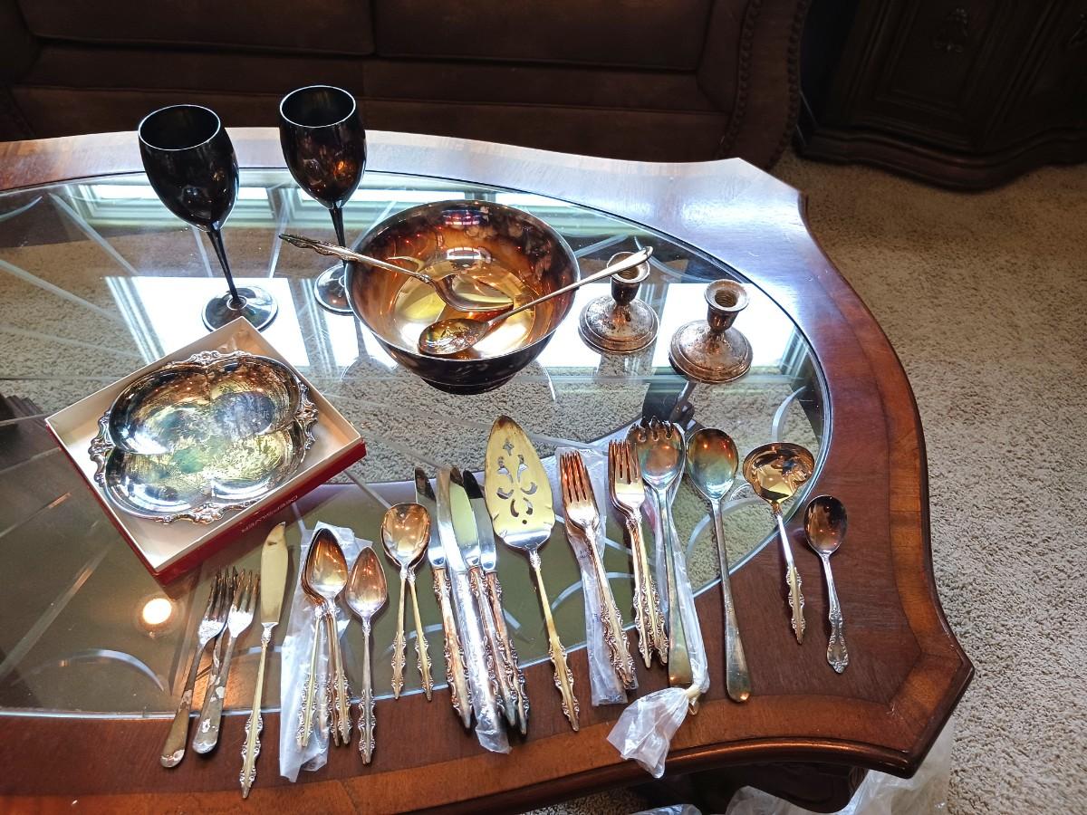 WEIGHTED STERLING SILVER CANDLE HOLDERS AND SILVER PLATED SERVING PIECES