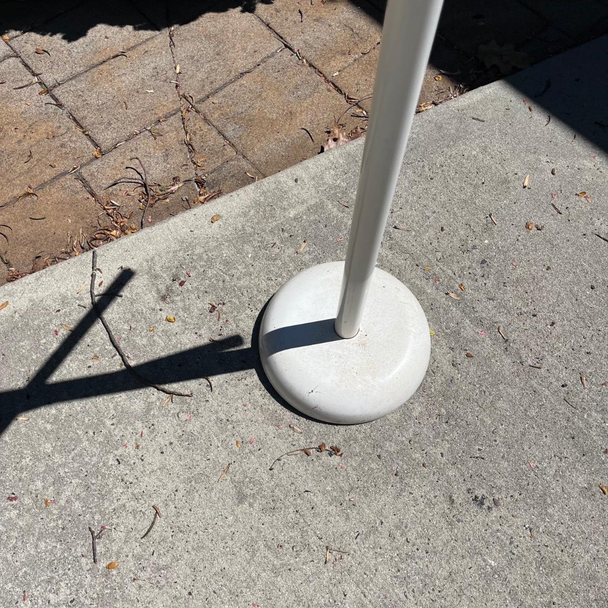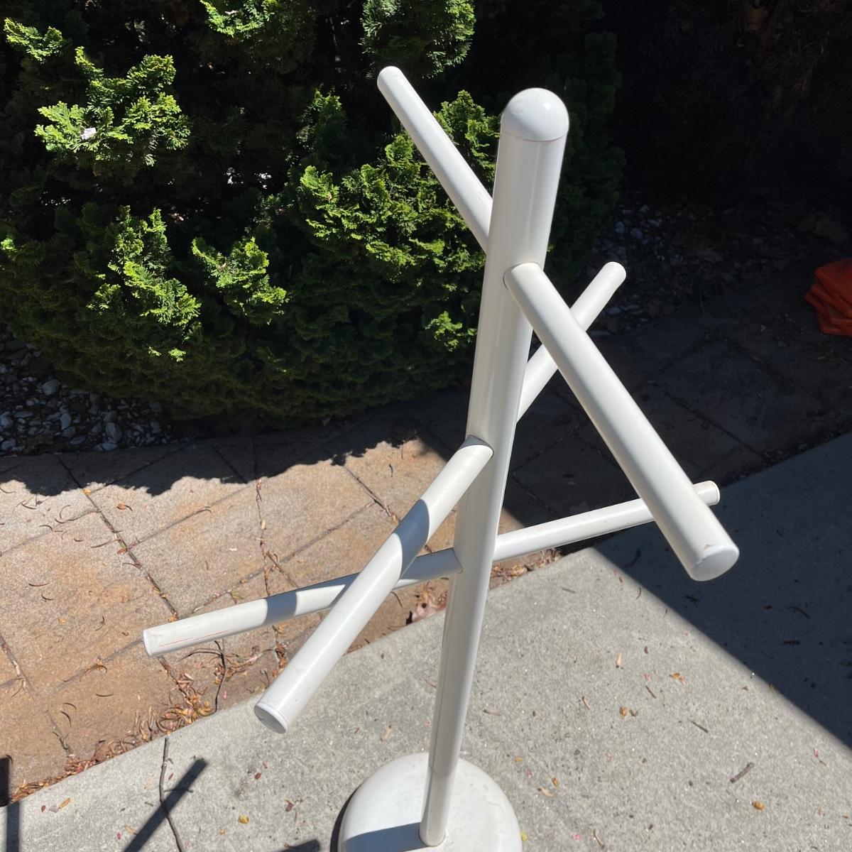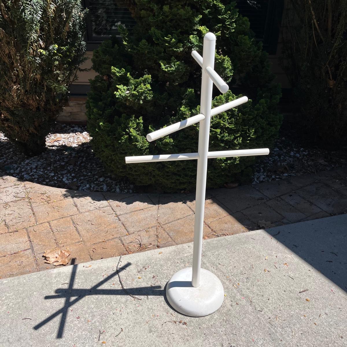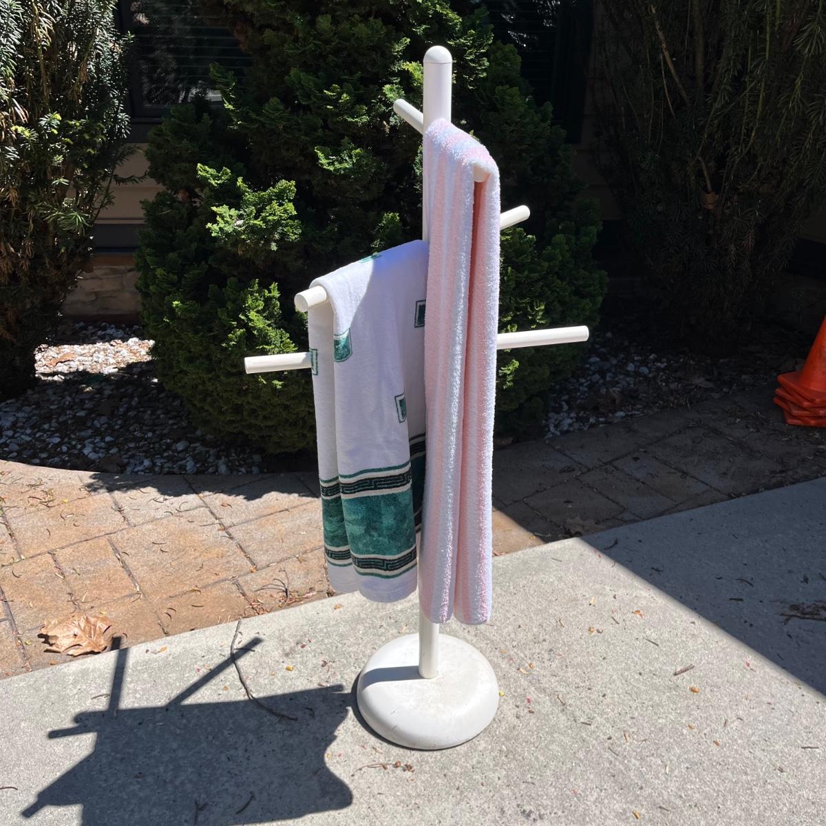 Lot includes a weighted PVC towel rack with two towels. Rack measures 24”D x 52”H.