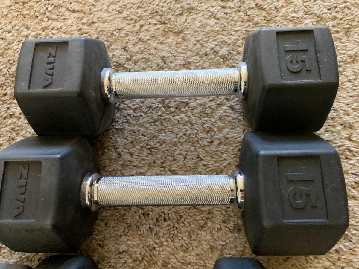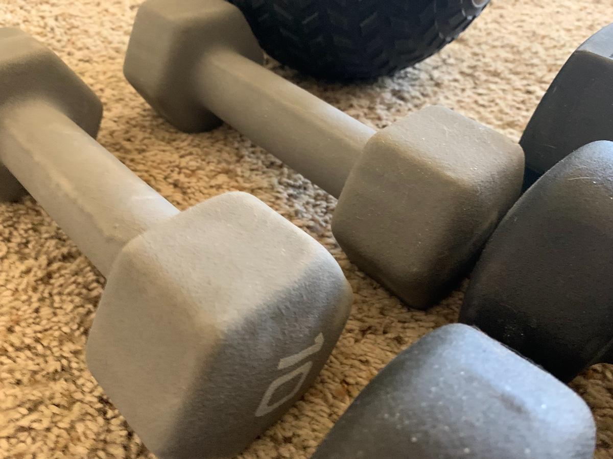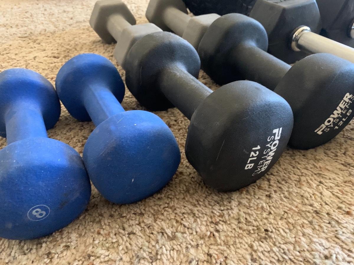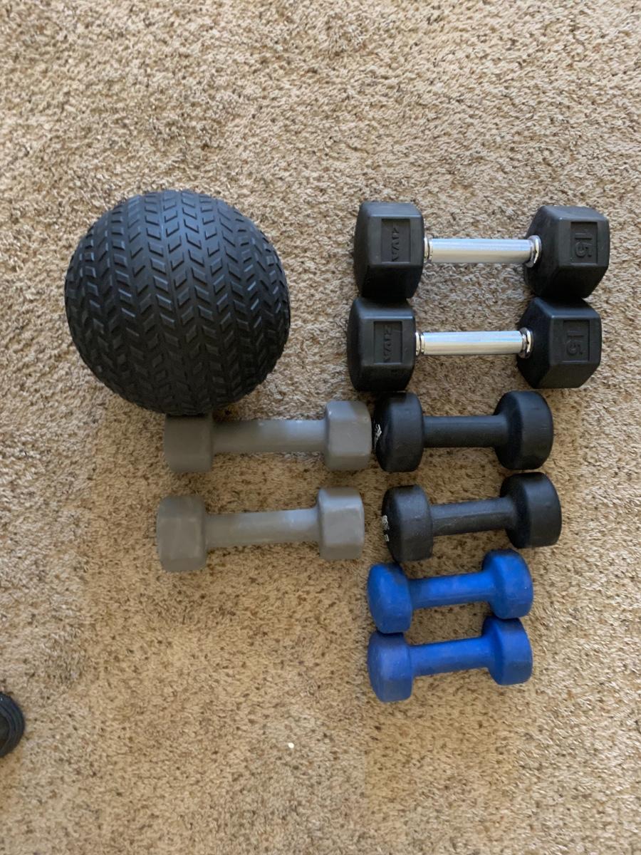 Includes one 6 lb medicine ball, 8, 10, 12, and 15 lb weights. All in good to great condition
