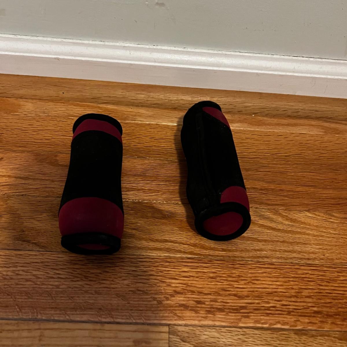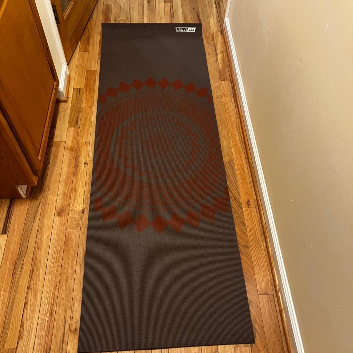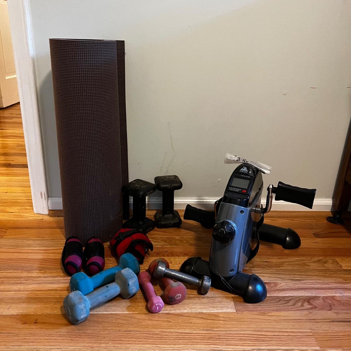 Fitness equipment includes four sets of free weights; 10 lb, 5 lb., 2lb and 1 lb. as well as one single one pound dumbbell. Also included is a velcro weight (not marked feels like 2 lbs) and an Evoland pedal exerciser. The pedal exerciser has foot strap, a tension wheel and a timer/calories burned read out and measures approximately 15” x 15” x 12”H. Also included is a FitSpirit yoga mat that measures 72” x 24”.