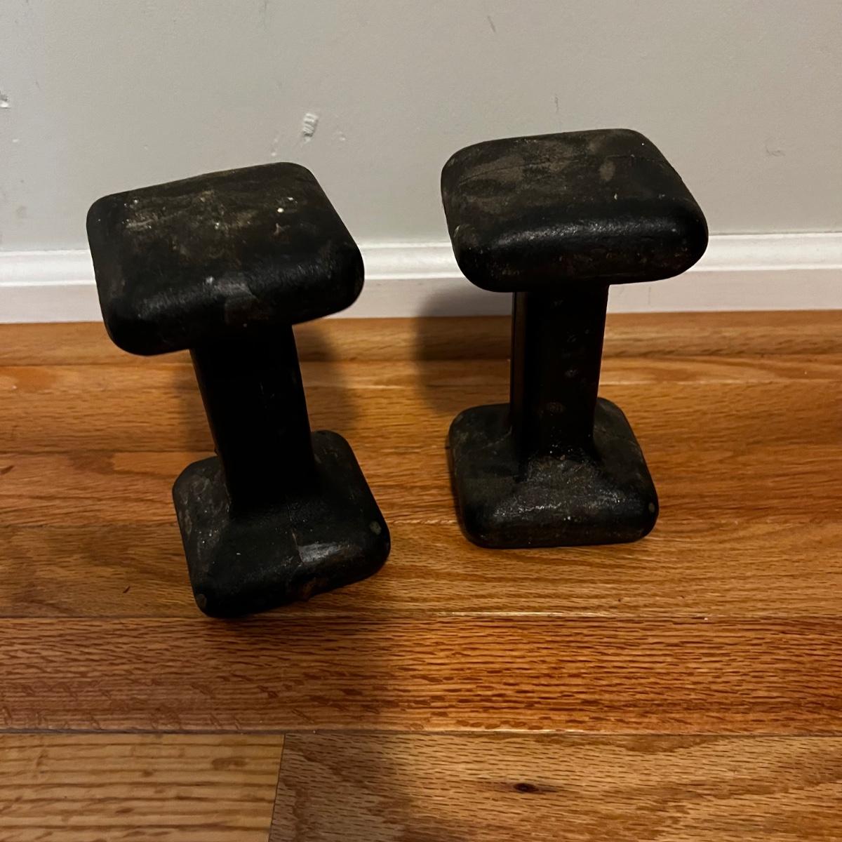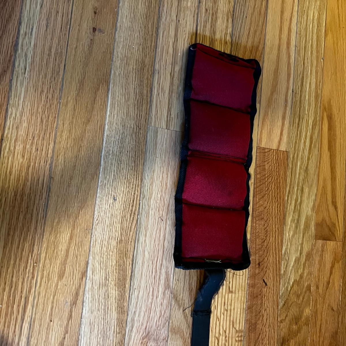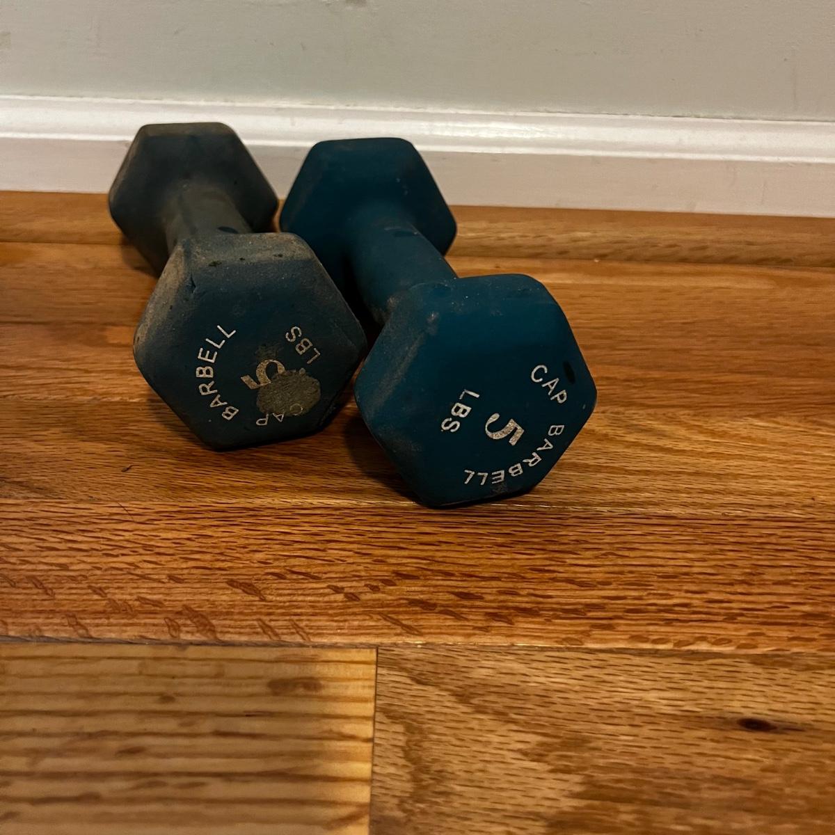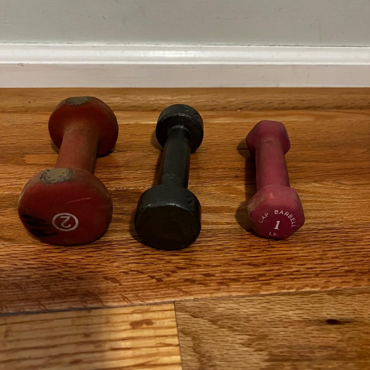 Fitness equipment includes four sets of free weights; 10 lb, 5 lb., 2lb and 1 lb. as well as one single one pound dumbbell. Also included is a velcro weight (not marked feels like 2 lbs) and an Evoland pedal exerciser. The pedal exerciser has foot strap, a tension wheel and a timer/calories burned read out and measures approximately 15” x 15” x 12”H. Also included is a FitSpirit yoga mat that measures 72” x 24”.