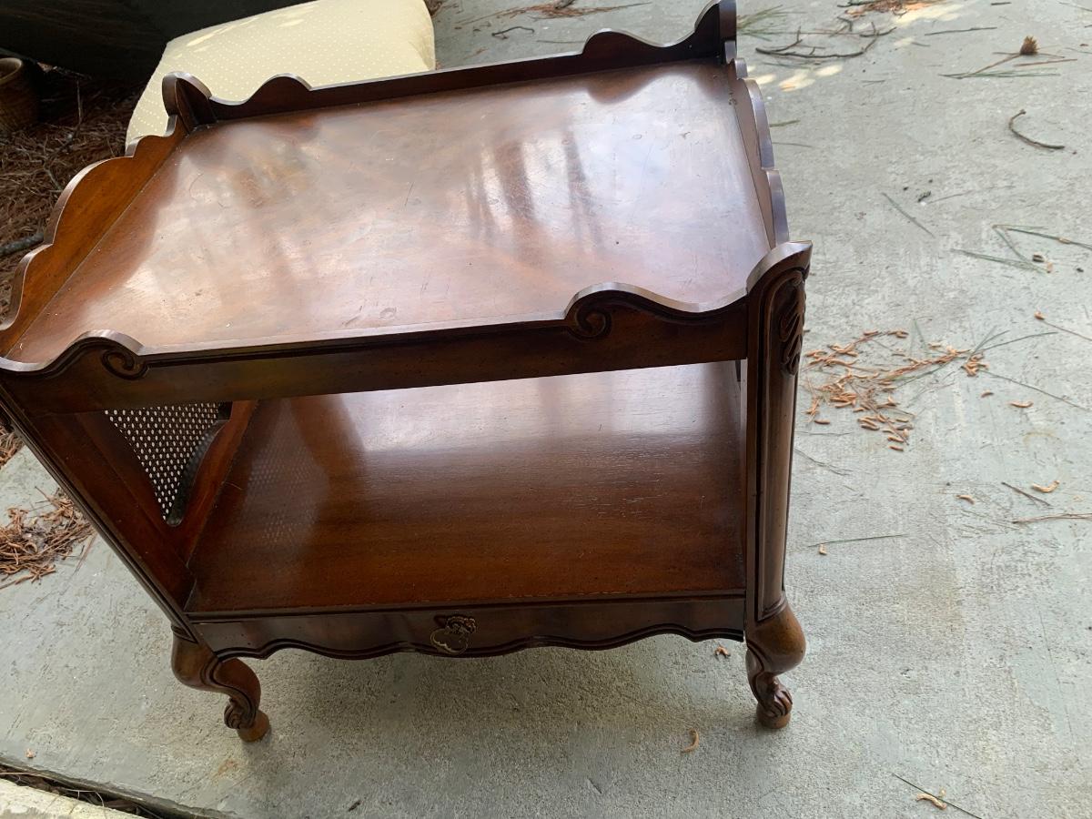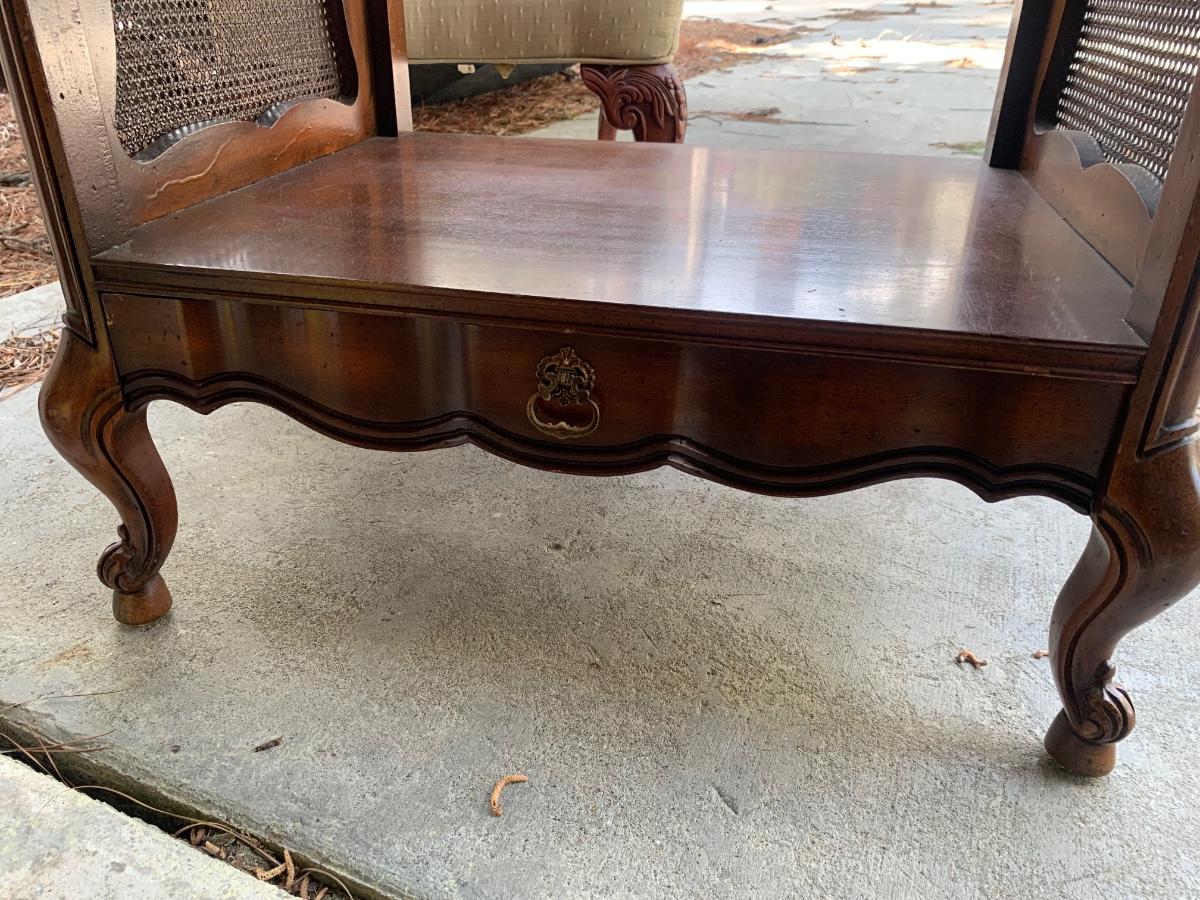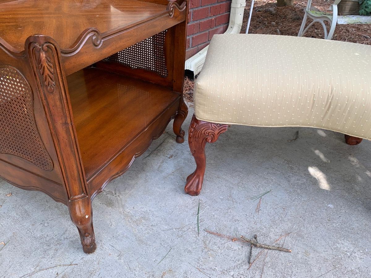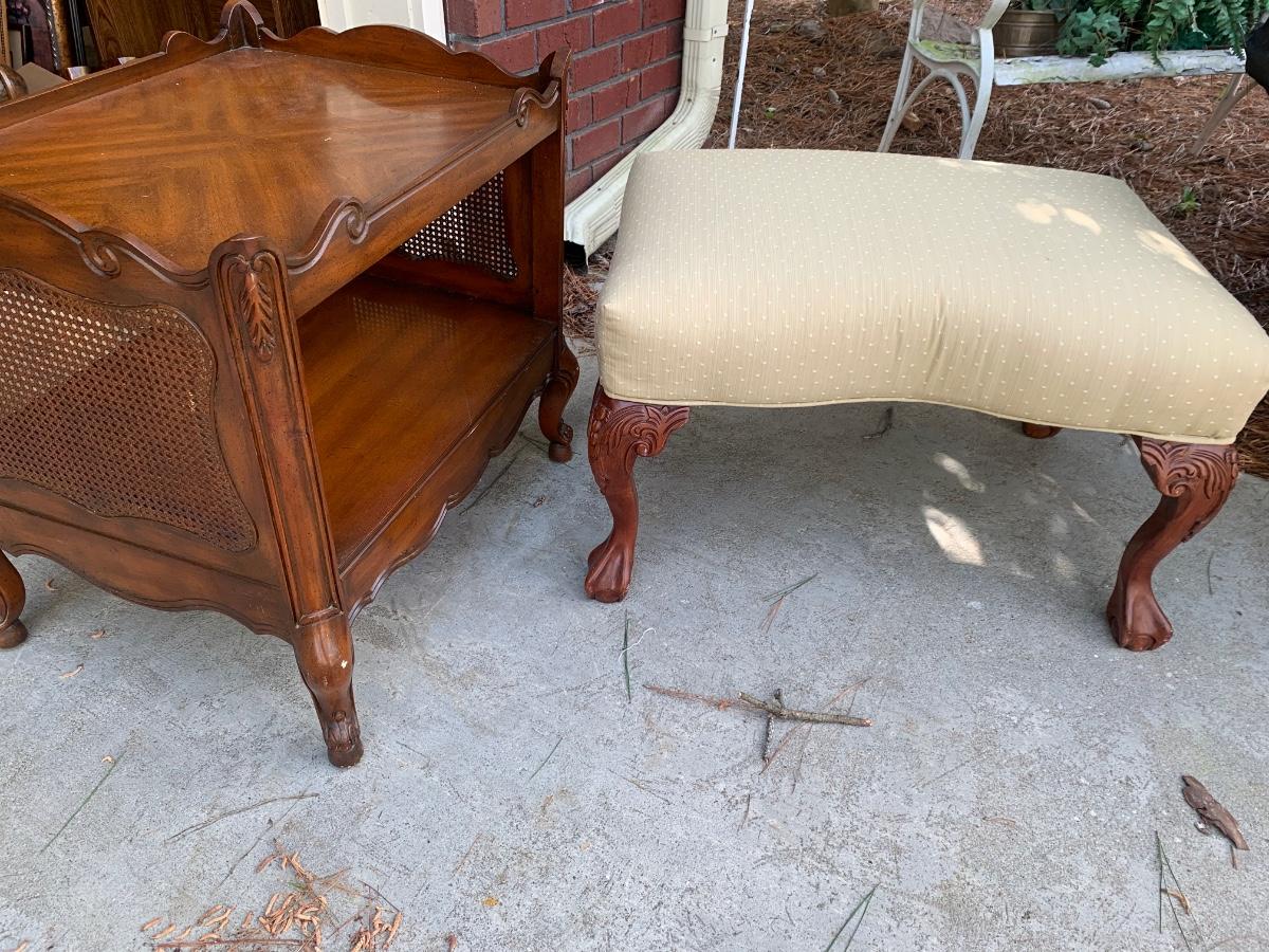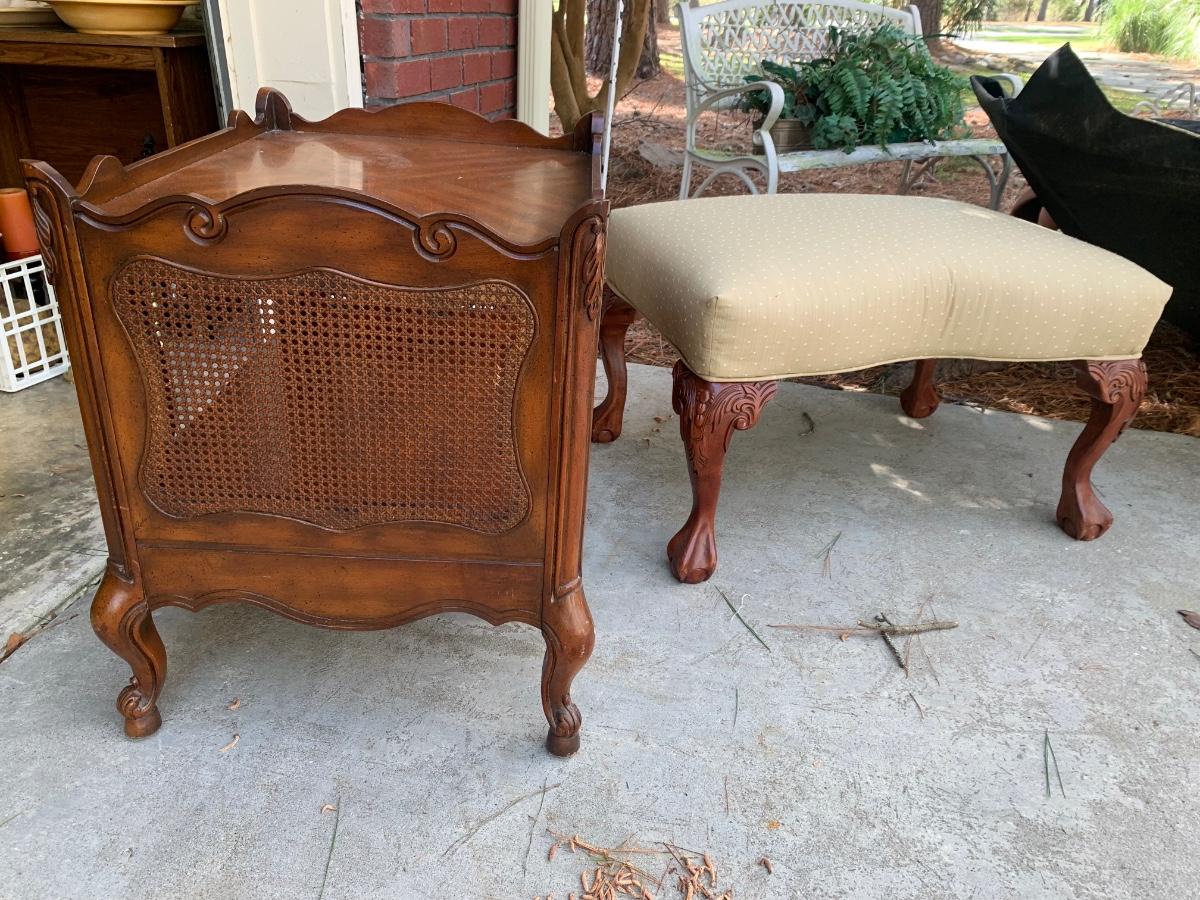 Weiman wood and wicker 2 tier side table with drawer and an ottoman -label shows color and fabric type