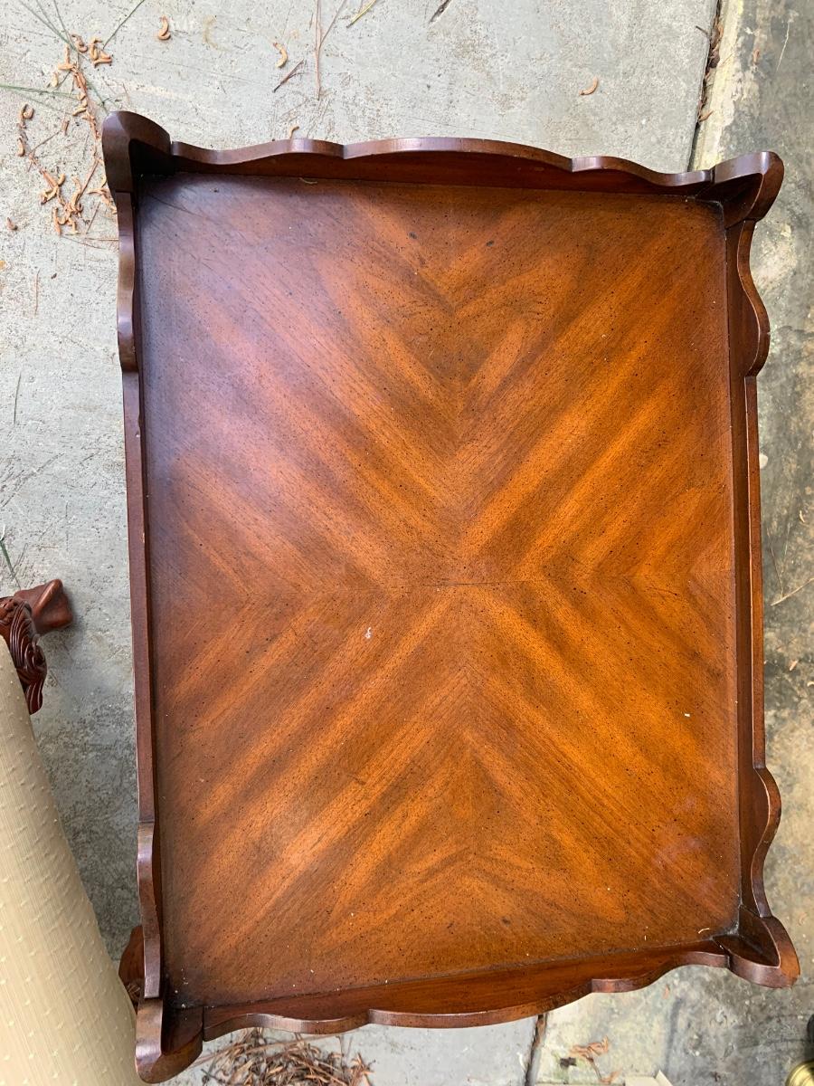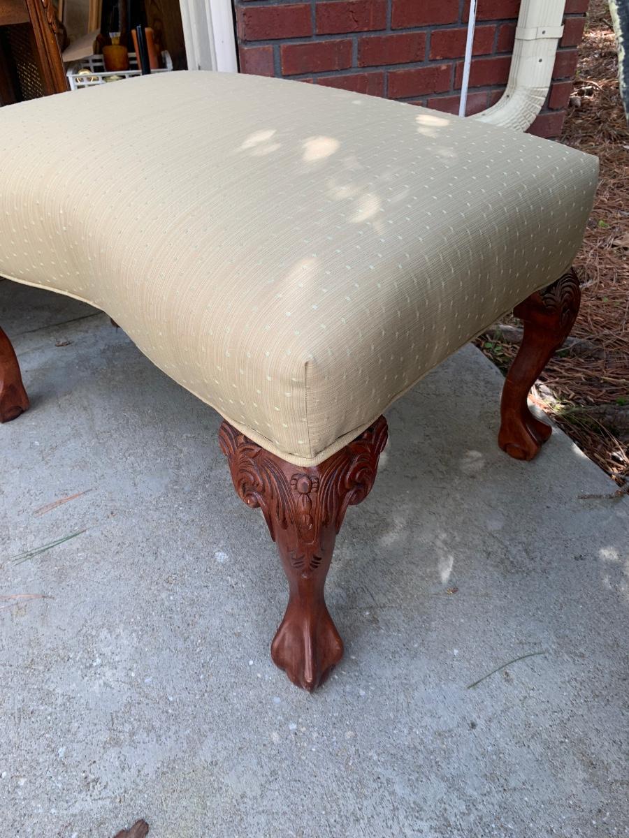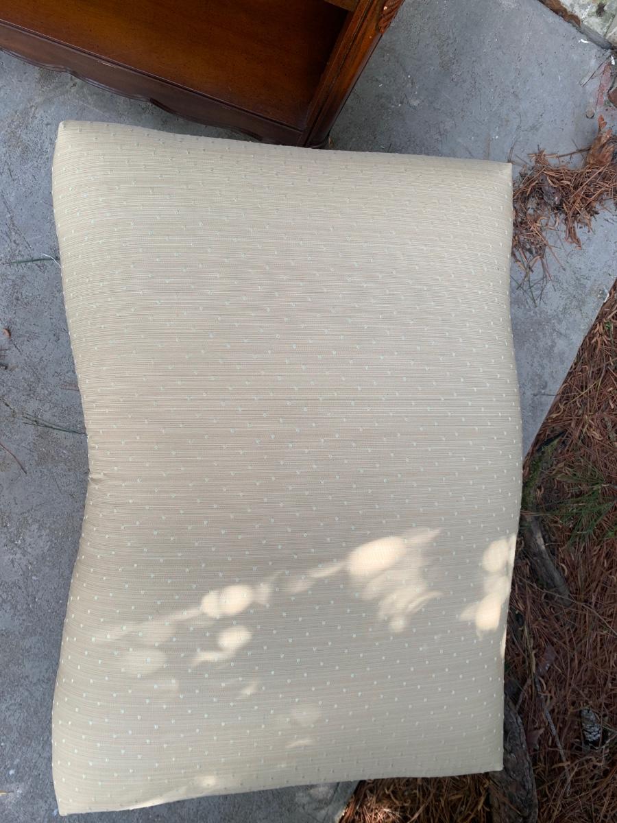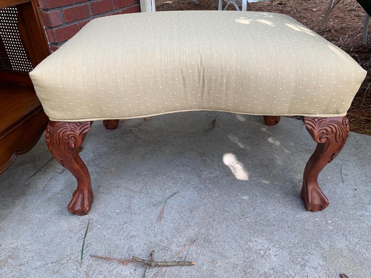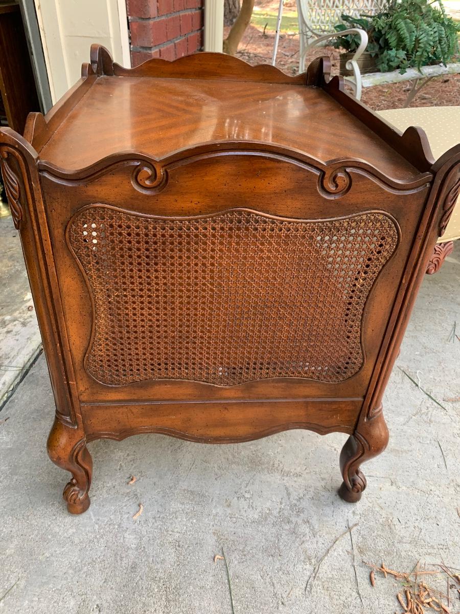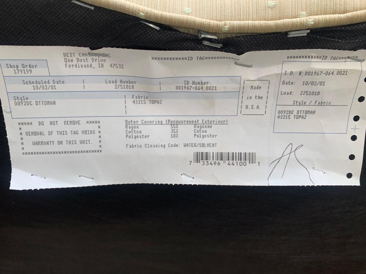Weiman wood and wicker 2 tier side table with drawer and an ottoman -label shows color and fabric type
