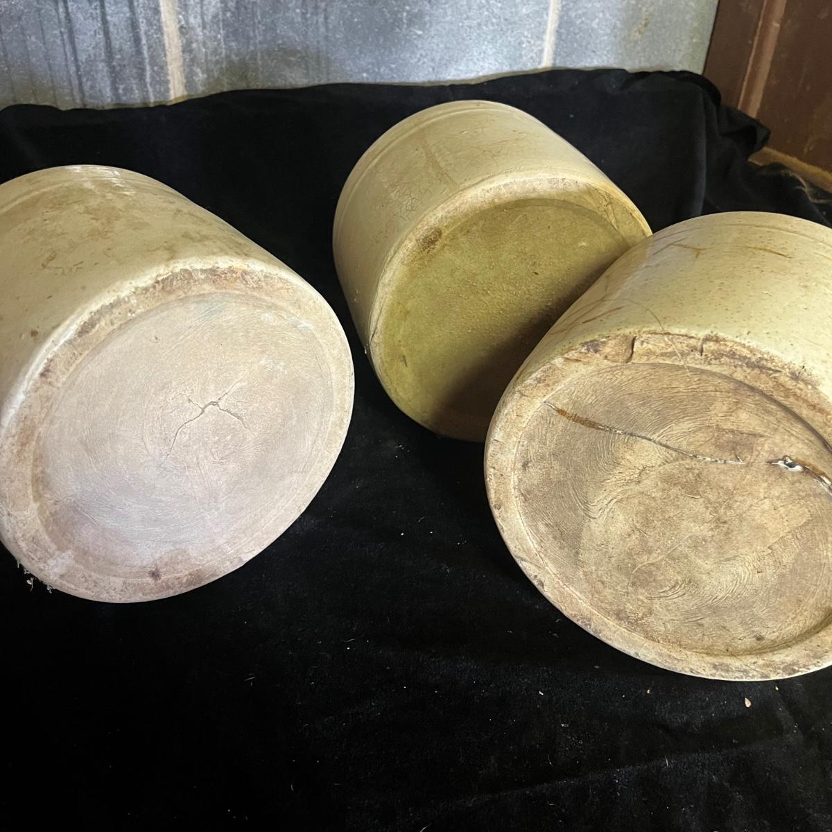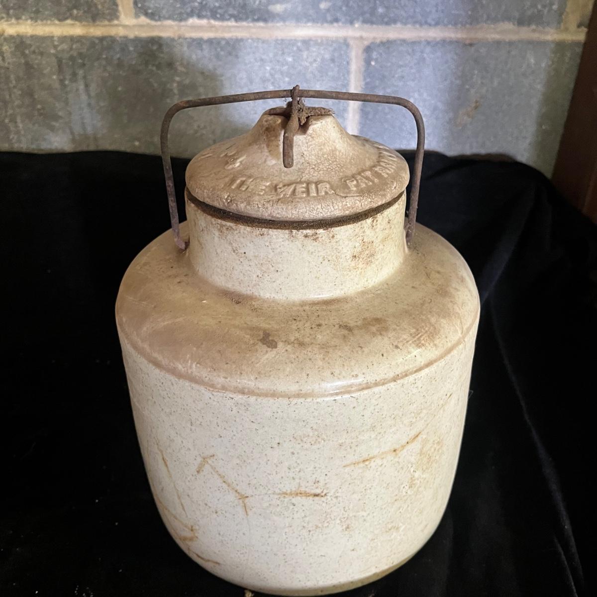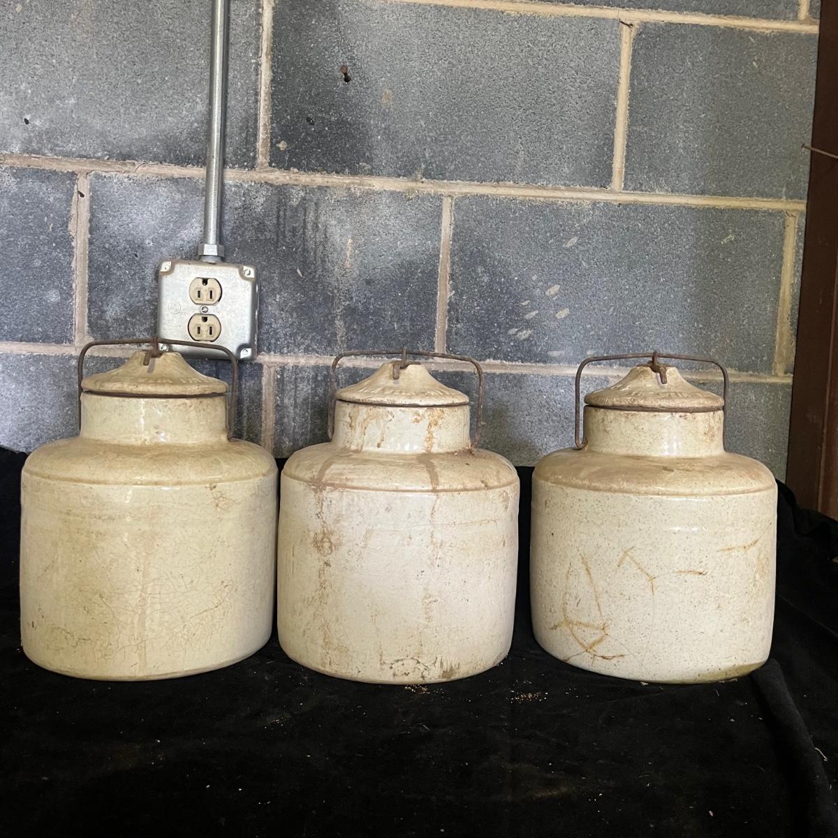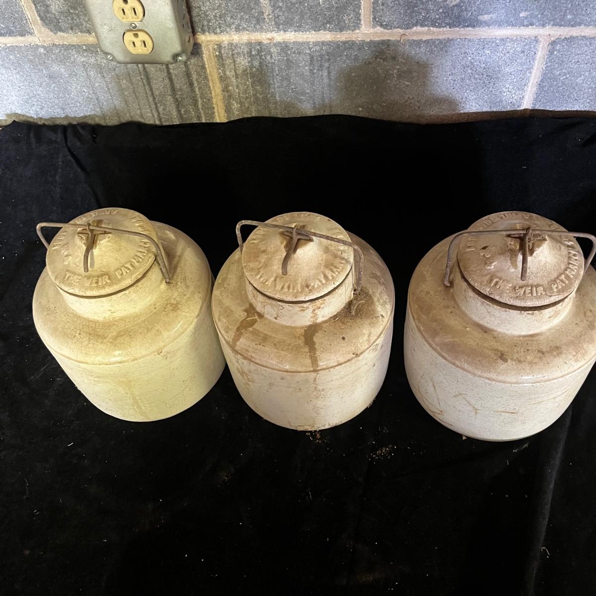 Lot includes three Weir canning jars with lids. Jars measure 7.5”D x 10”H. All jars have crazing and chips and small cracks, see pictures.