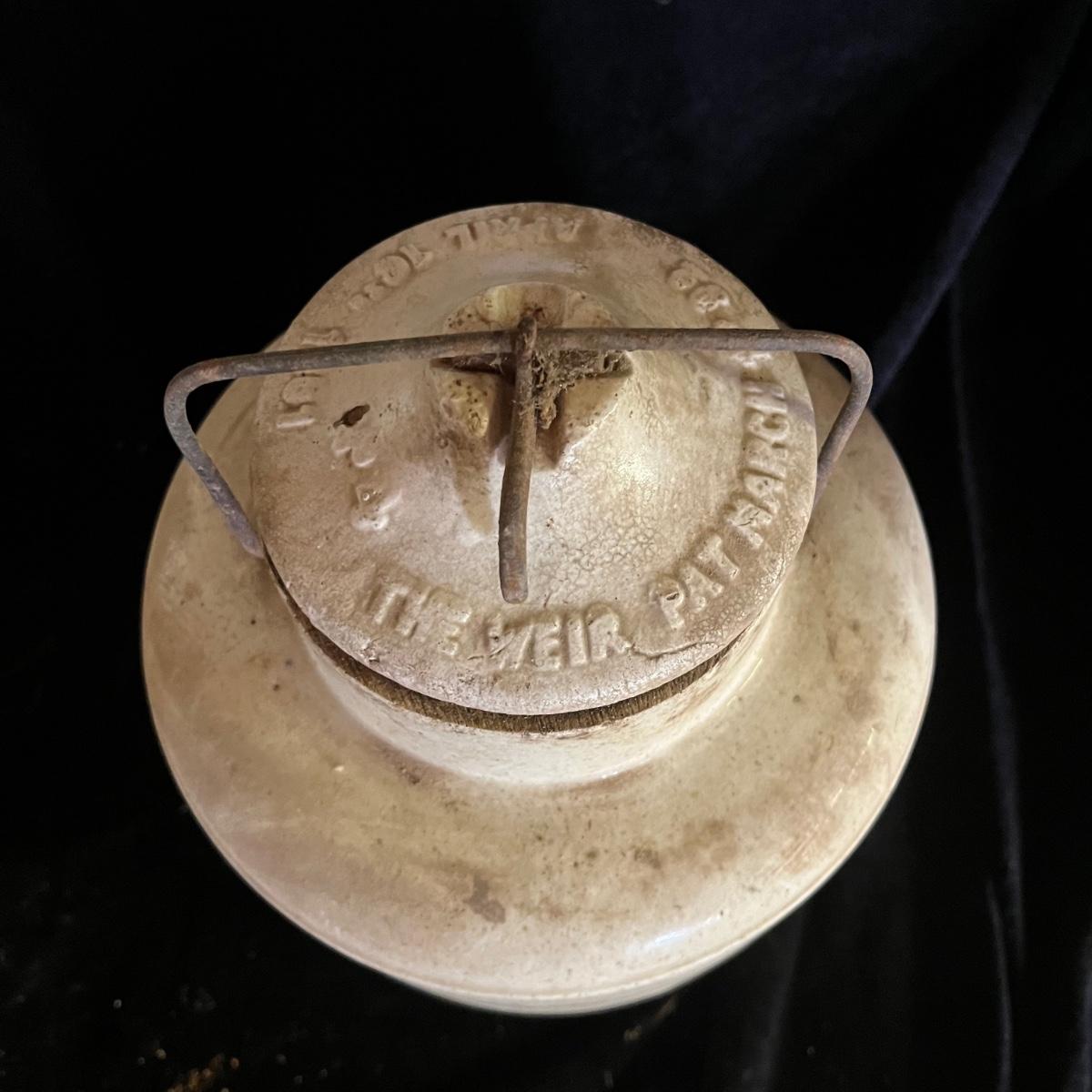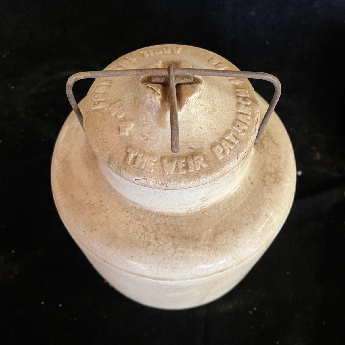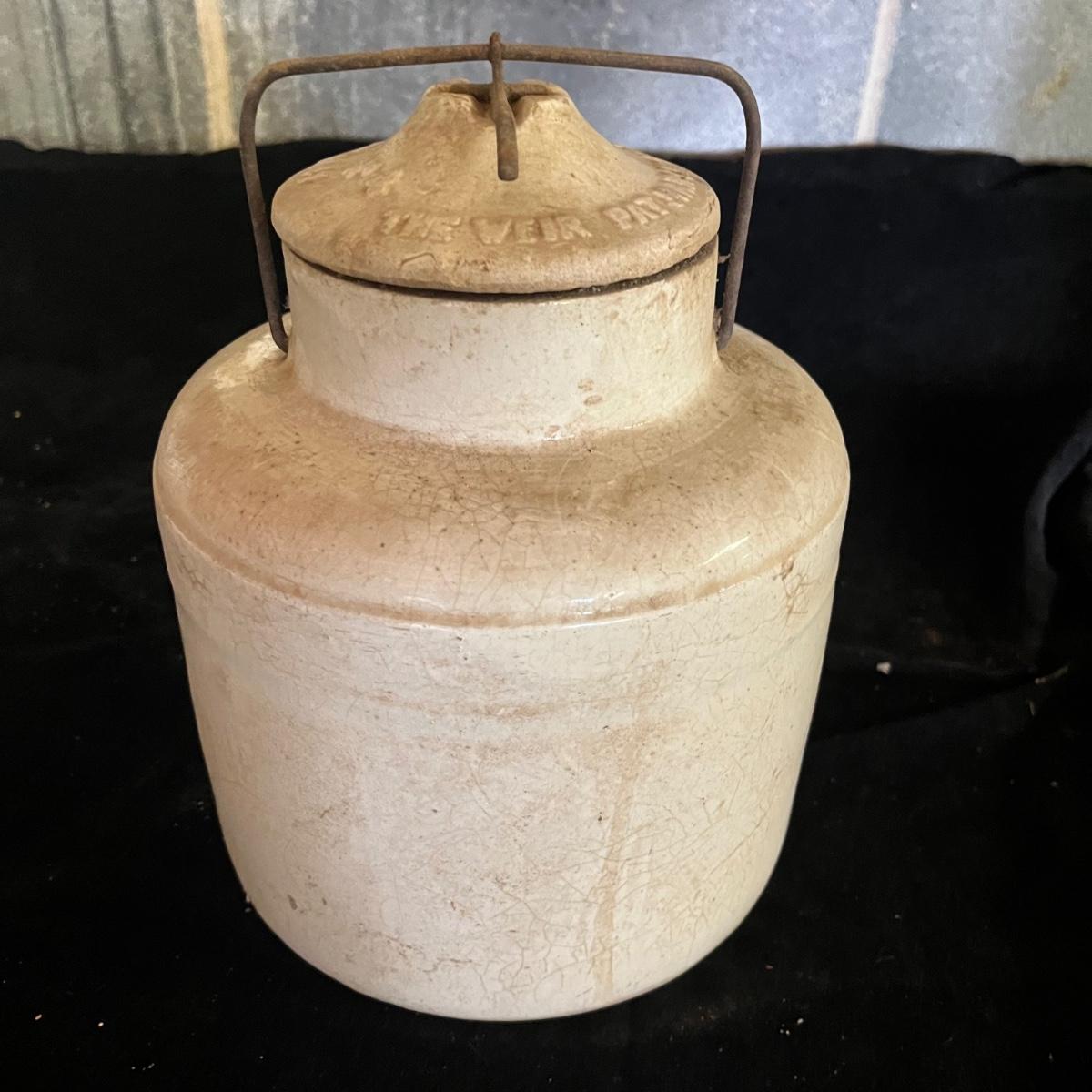 Lot includes three Weir canning jars with lids. Jars measure 7.5”D x 10”H. All jars have crazing and chips and small cracks, see pictures.