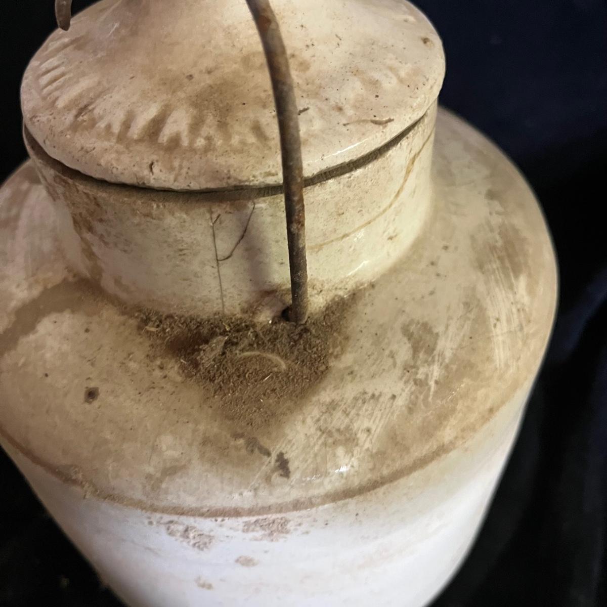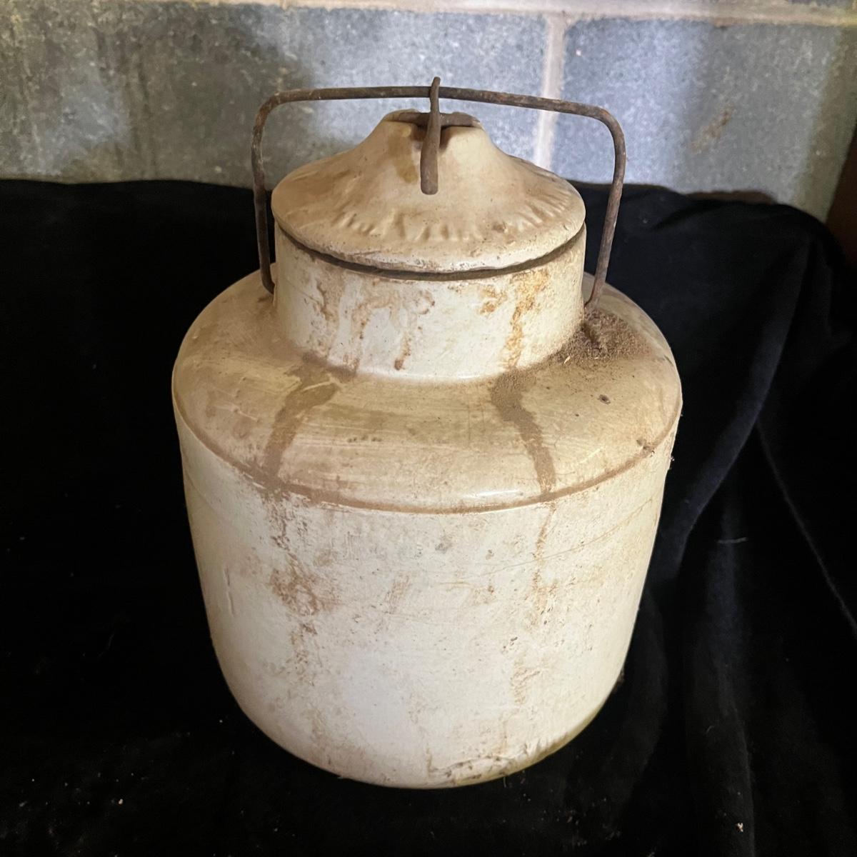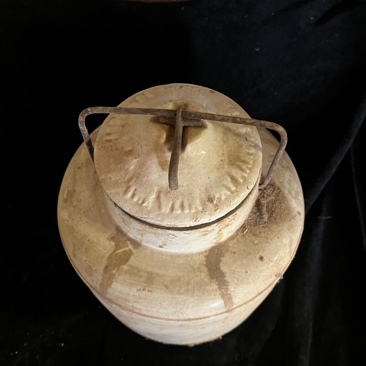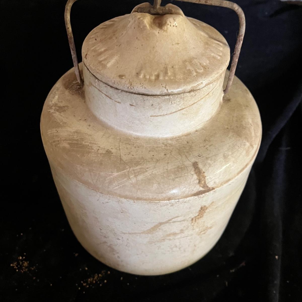 Lot includes three Weir canning jars with lids. Jars measure 7.5”D x 10”H. All jars have crazing and chips and small cracks, see pictures.