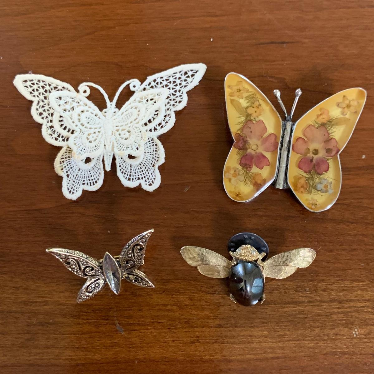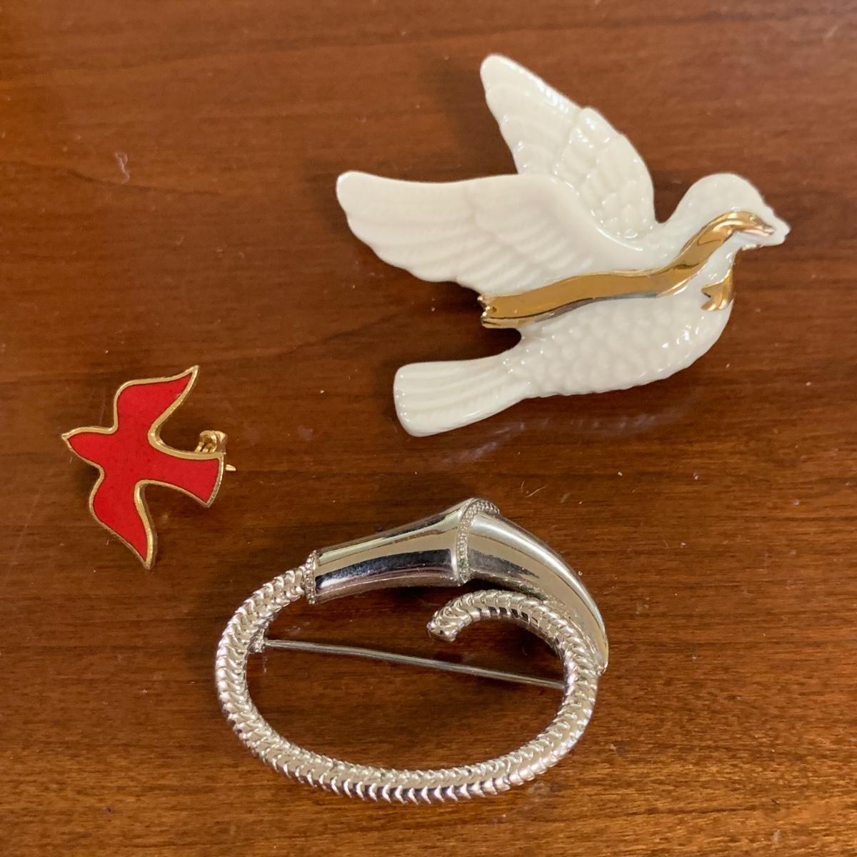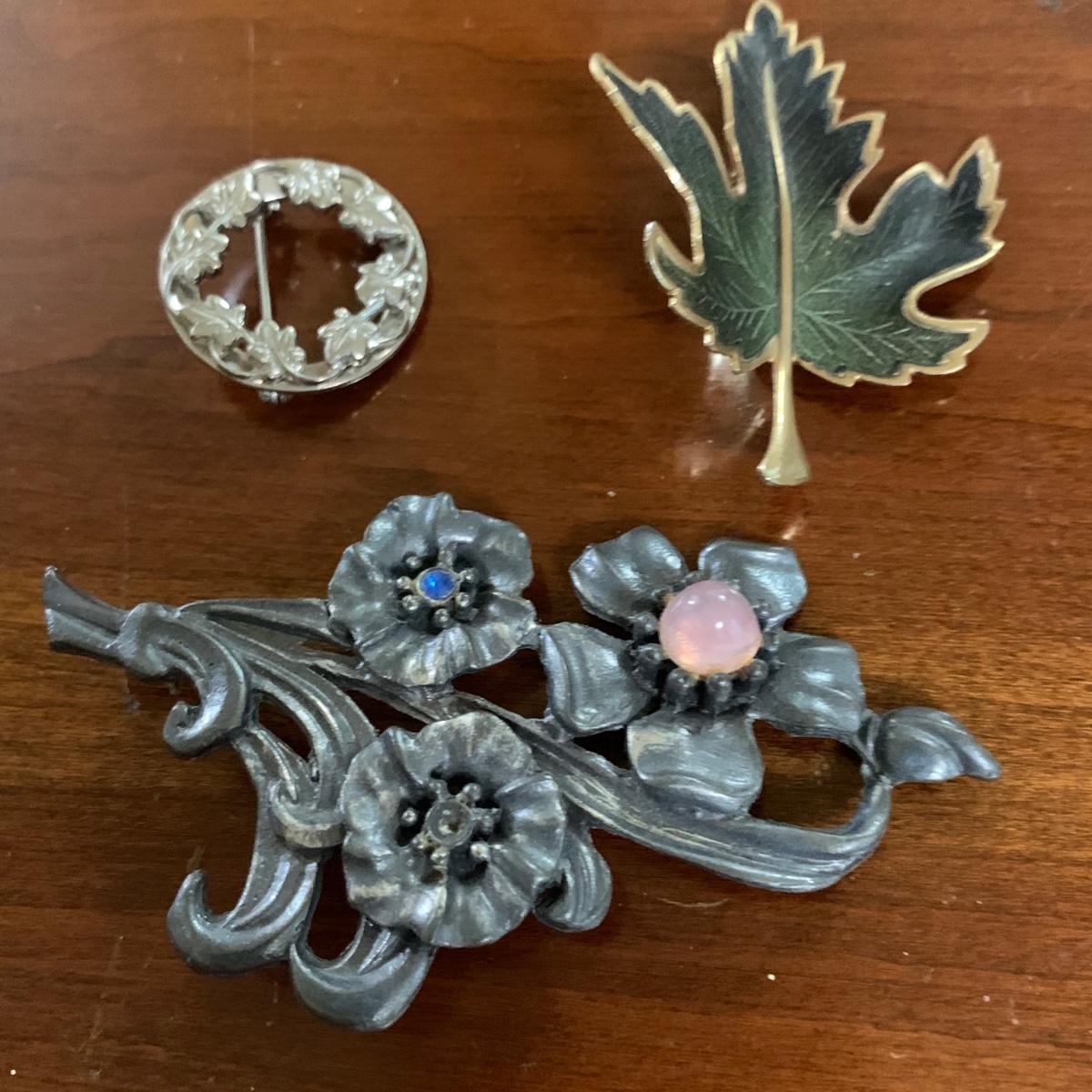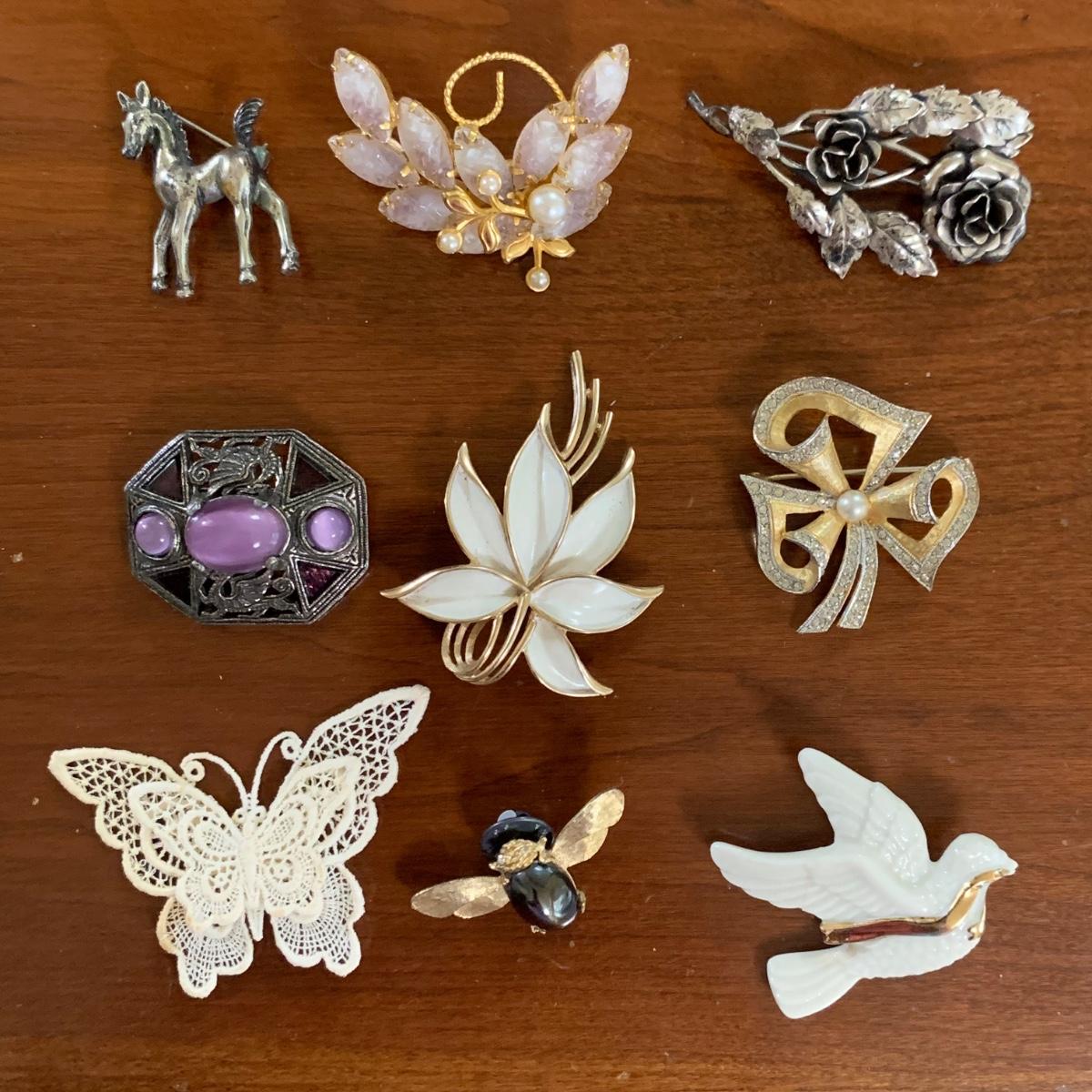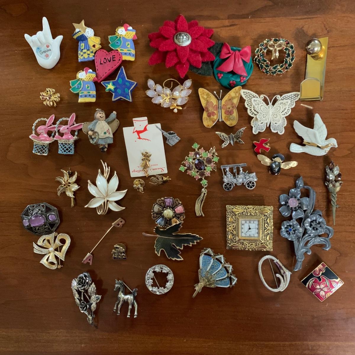 30+ fashion pins plus five button covers. The rose pin is stamped “Danecraft Sterling” and the horse is stamped “Beau Sterling”. The other pins are made of various materials including metal, fabric, clay, and porcelain. The dove pin is marked “Lenox”. The bow shaped pin with the pearlescent bead in the center is marked “Weiss”. There is also one Trifari, one Miracle, one Monet, and two marked Spain. The largest pin is the felt red poinsettia which is about 3”d.