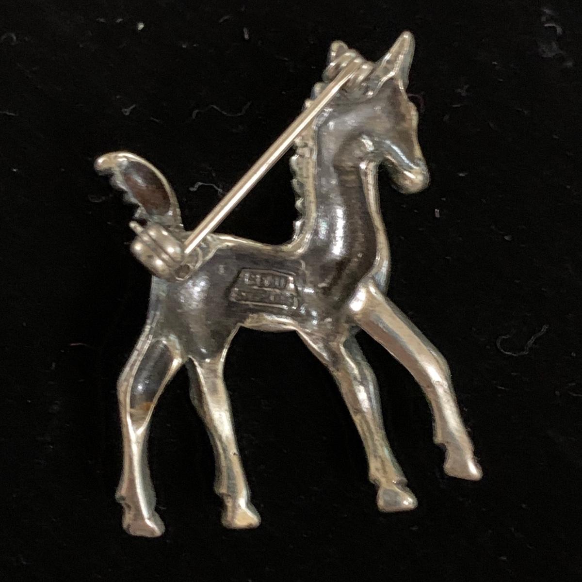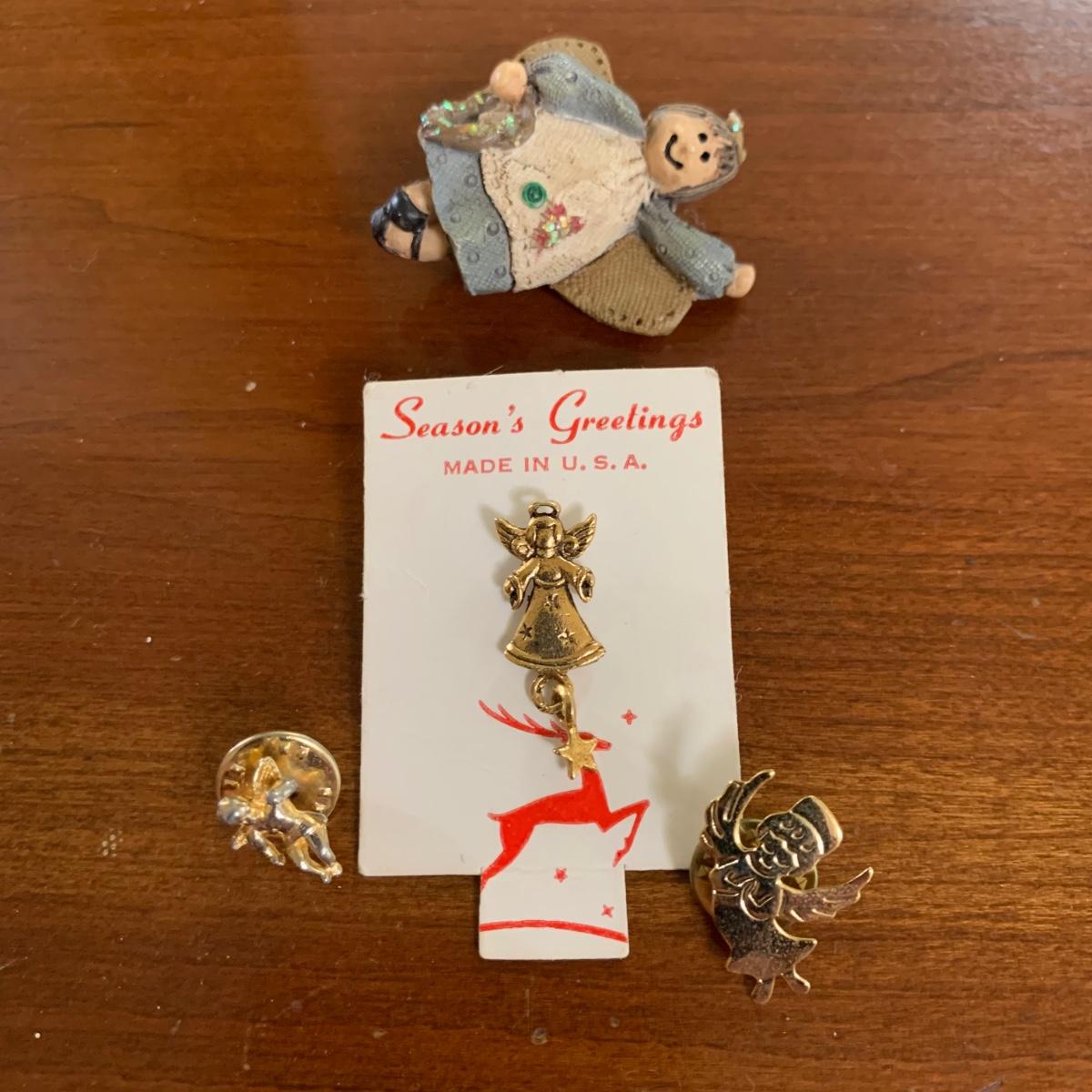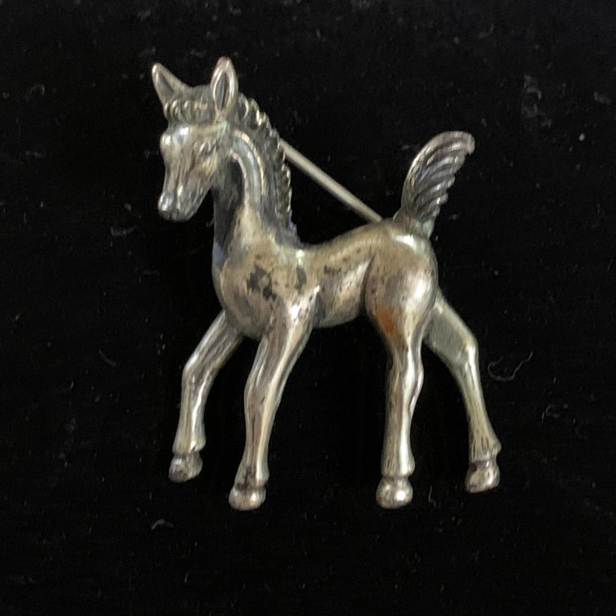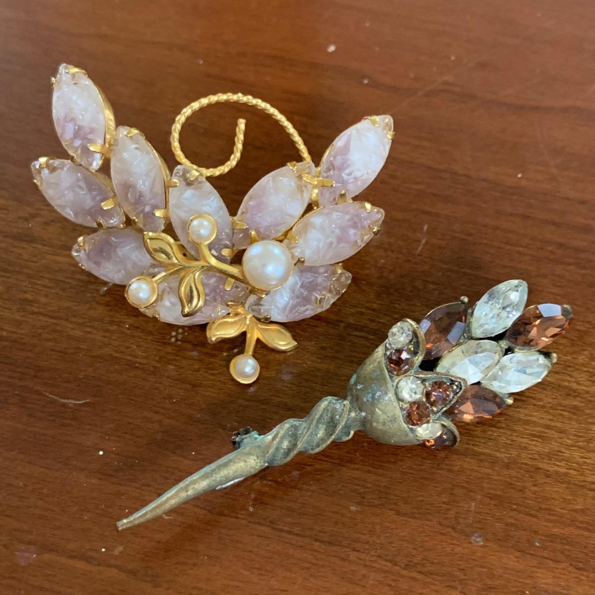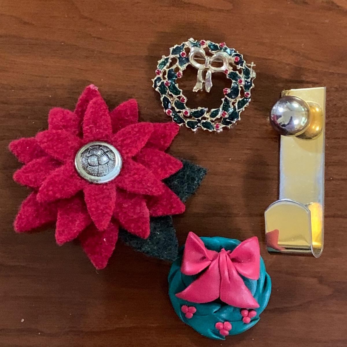 30+ fashion pins plus five button covers. The rose pin is stamped “Danecraft Sterling” and the horse is stamped “Beau Sterling”. The other pins are made of various materials including metal, fabric, clay, and porcelain. The dove pin is marked “Lenox”. The bow shaped pin with the pearlescent bead in the center is marked “Weiss”. There is also one Trifari, one Miracle, one Monet, and two marked Spain. The largest pin is the felt red poinsettia which is about 3”d.