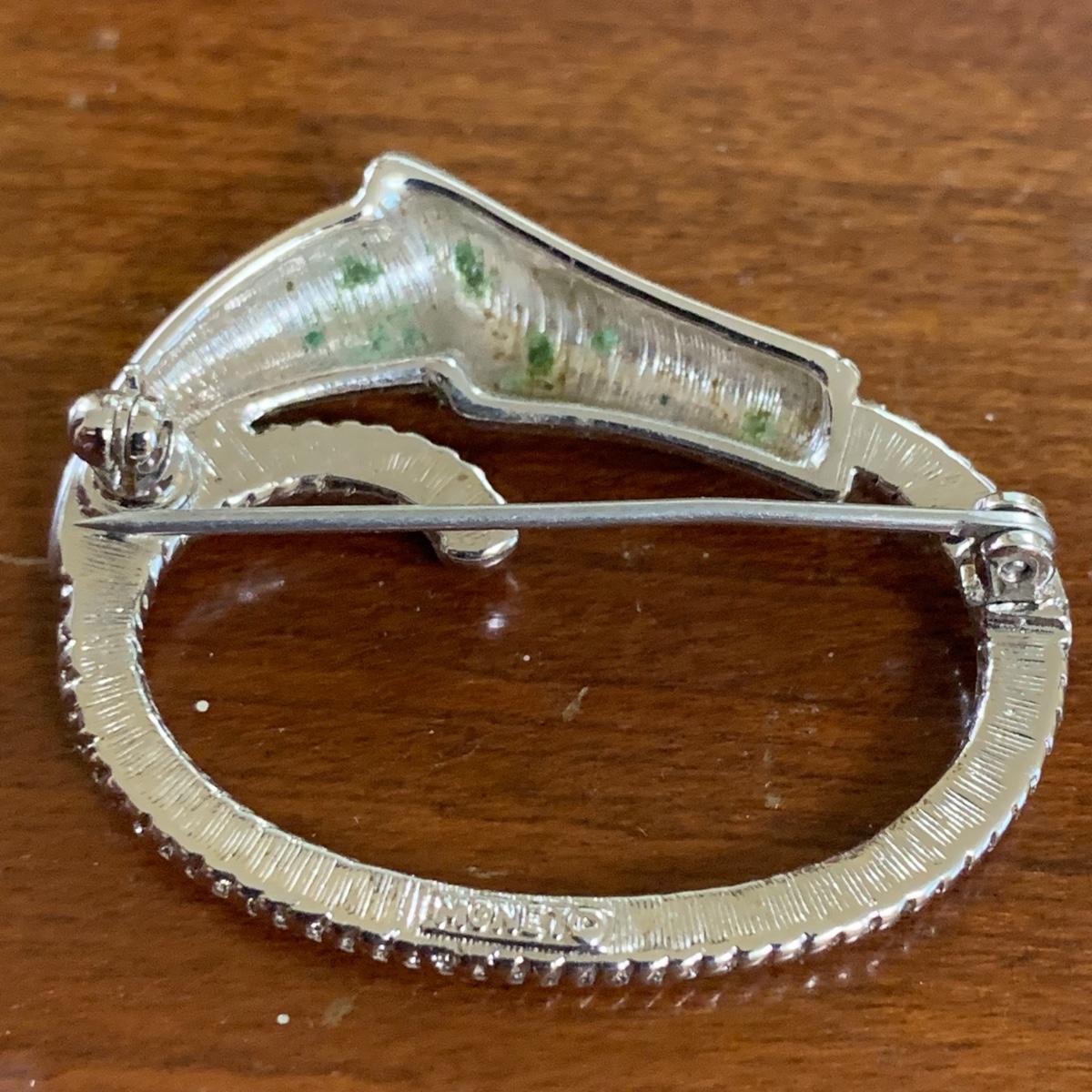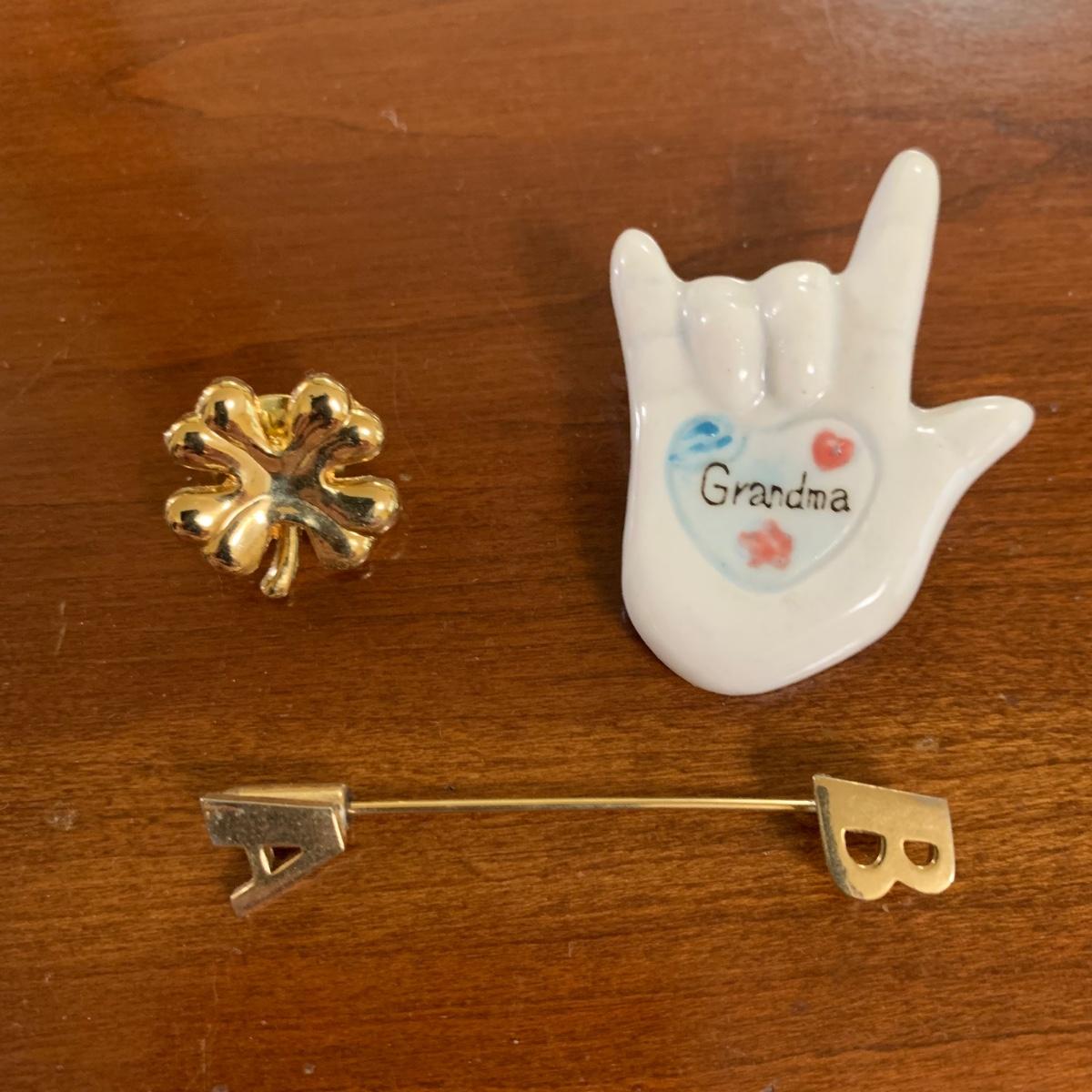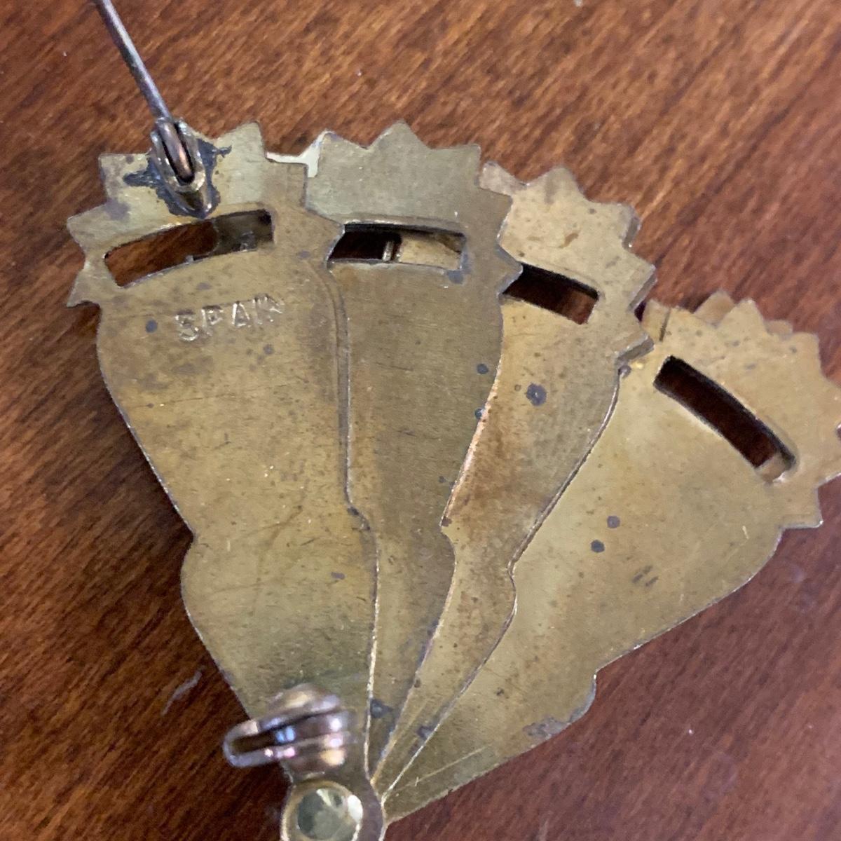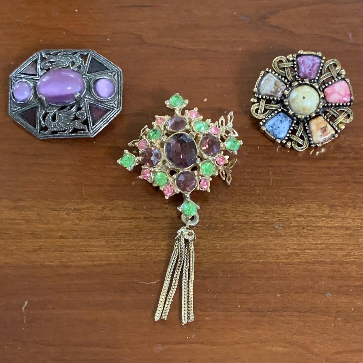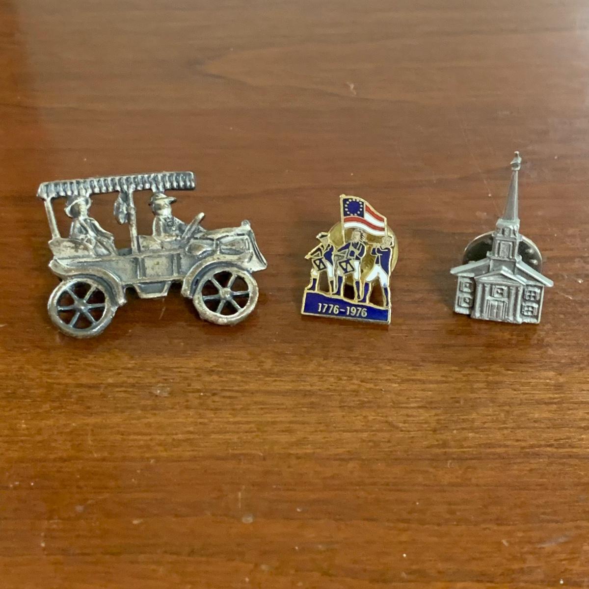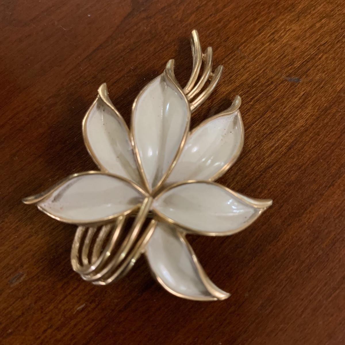 30+ fashion pins plus five button covers. The rose pin is stamped “Danecraft Sterling” and the horse is stamped “Beau Sterling”. The other pins are made of various materials including metal, fabric, clay, and porcelain. The dove pin is marked “Lenox”. The bow shaped pin with the pearlescent bead in the center is marked “Weiss”. There is also one Trifari, one Miracle, one Monet, and two marked Spain. The largest pin is the felt red poinsettia which is about 3”d.