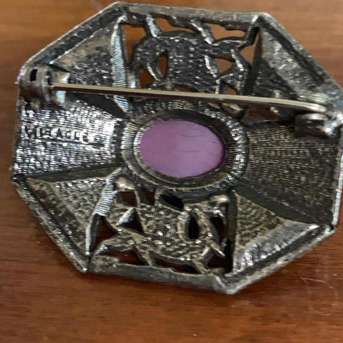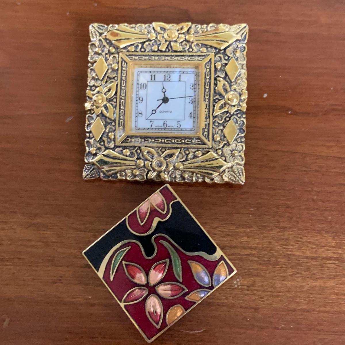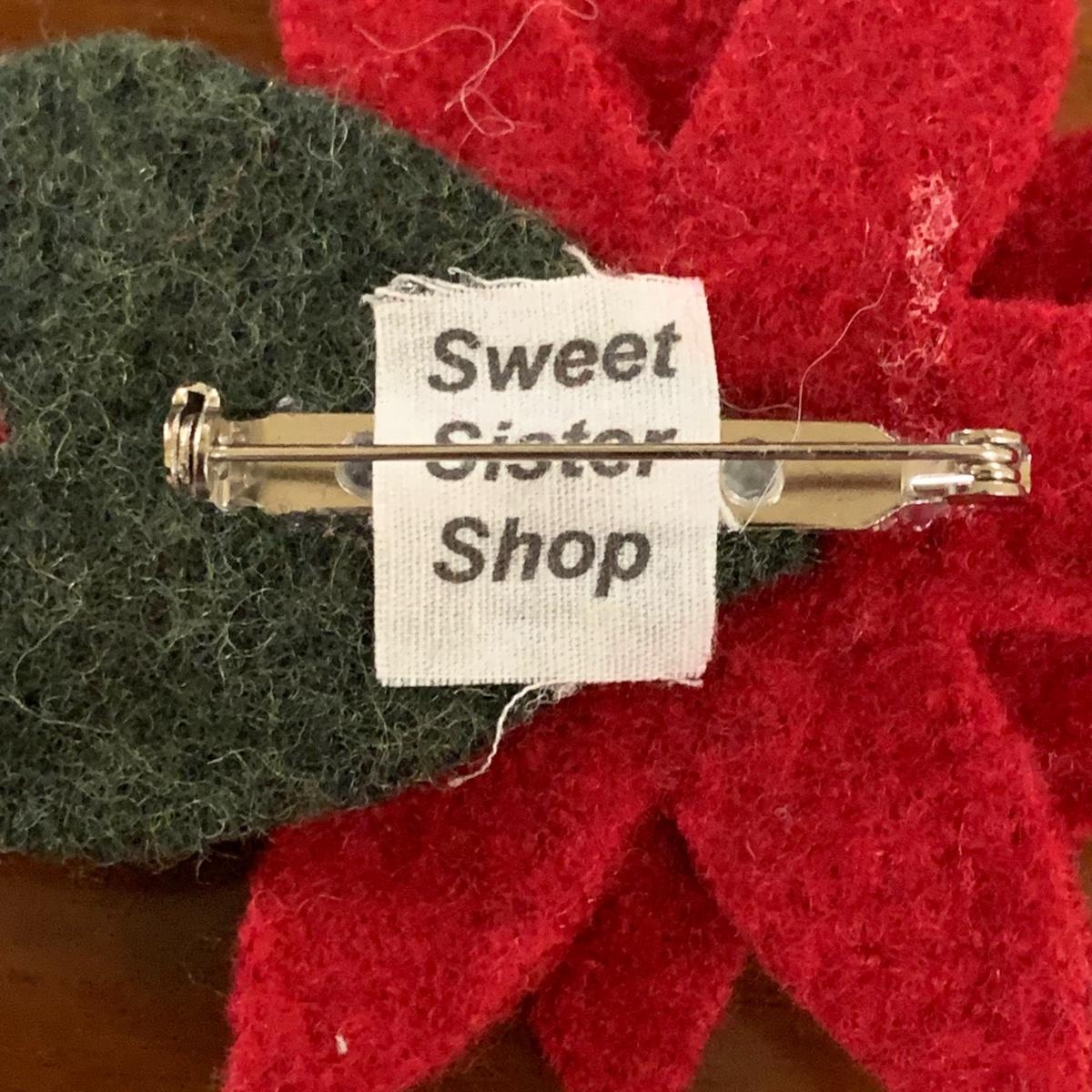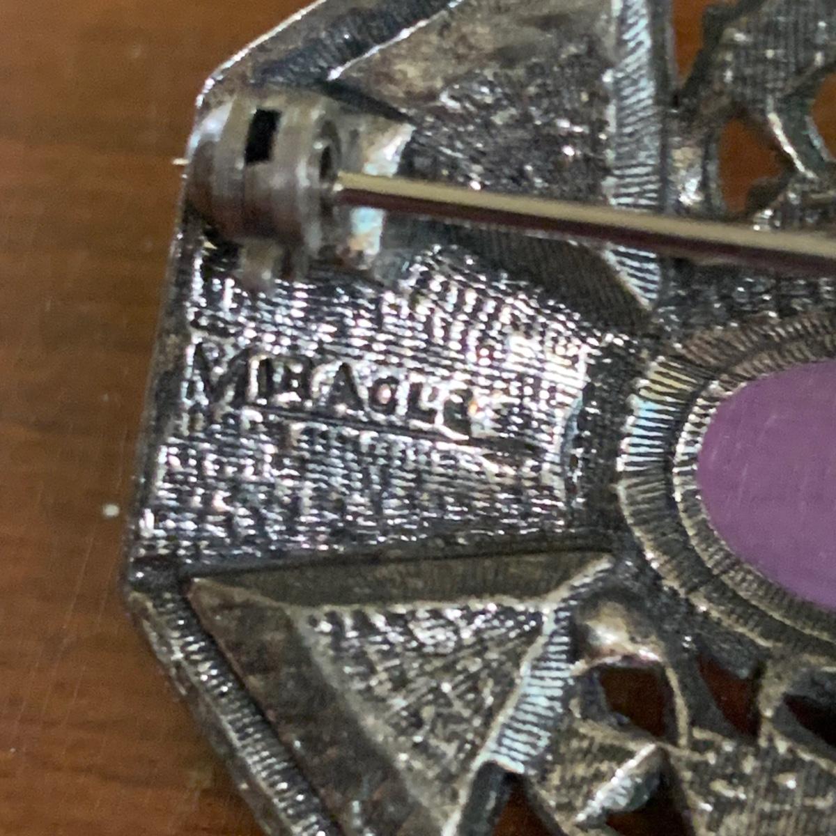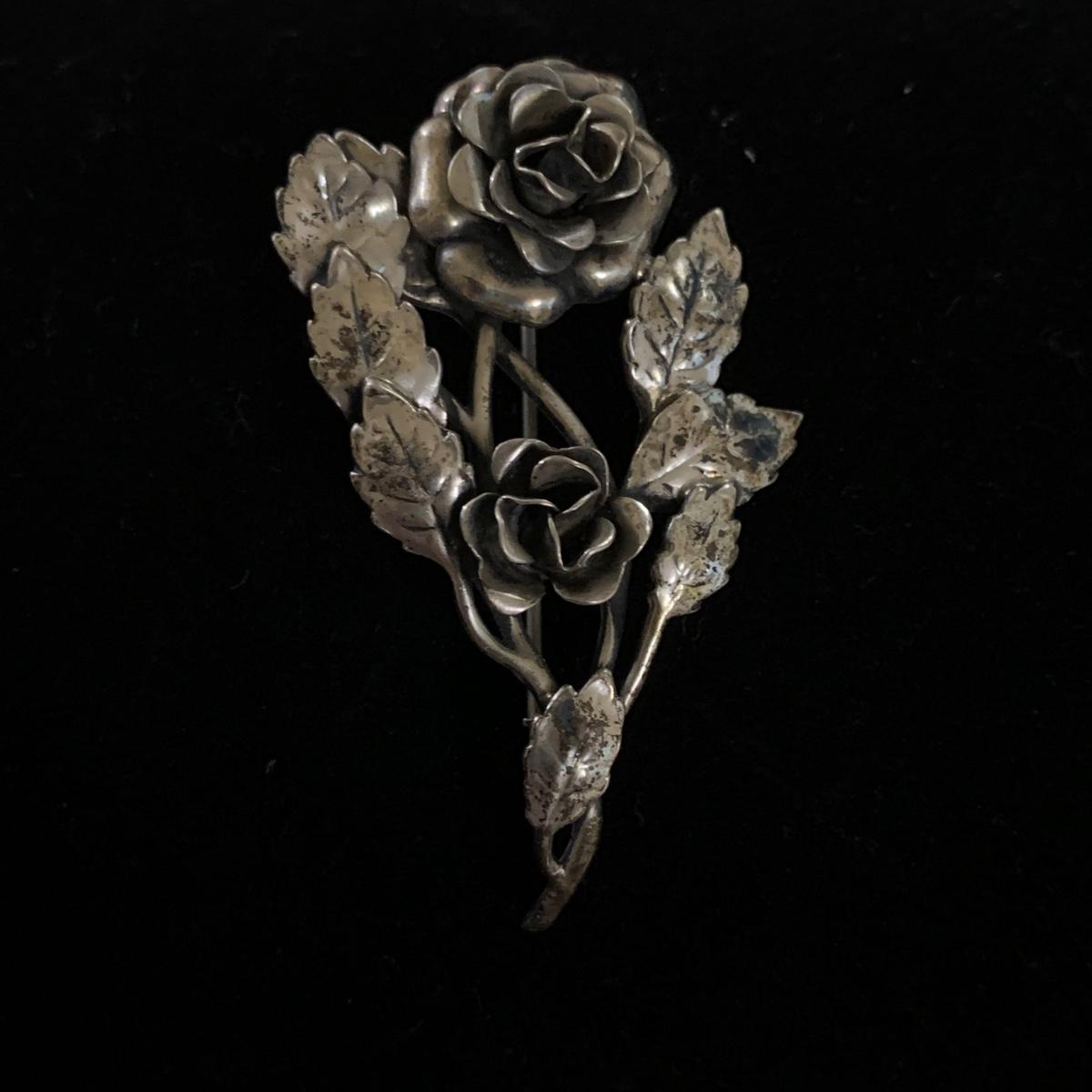 30+ fashion pins plus five button covers. The rose pin is stamped “Danecraft Sterling” and the horse is stamped “Beau Sterling”. The other pins are made of various materials including metal, fabric, clay, and porcelain. The dove pin is marked “Lenox”. The bow shaped pin with the pearlescent bead in the center is marked “Weiss”. There is also one Trifari, one Miracle, one Monet, and two marked Spain. The largest pin is the felt red poinsettia which is about 3”d.