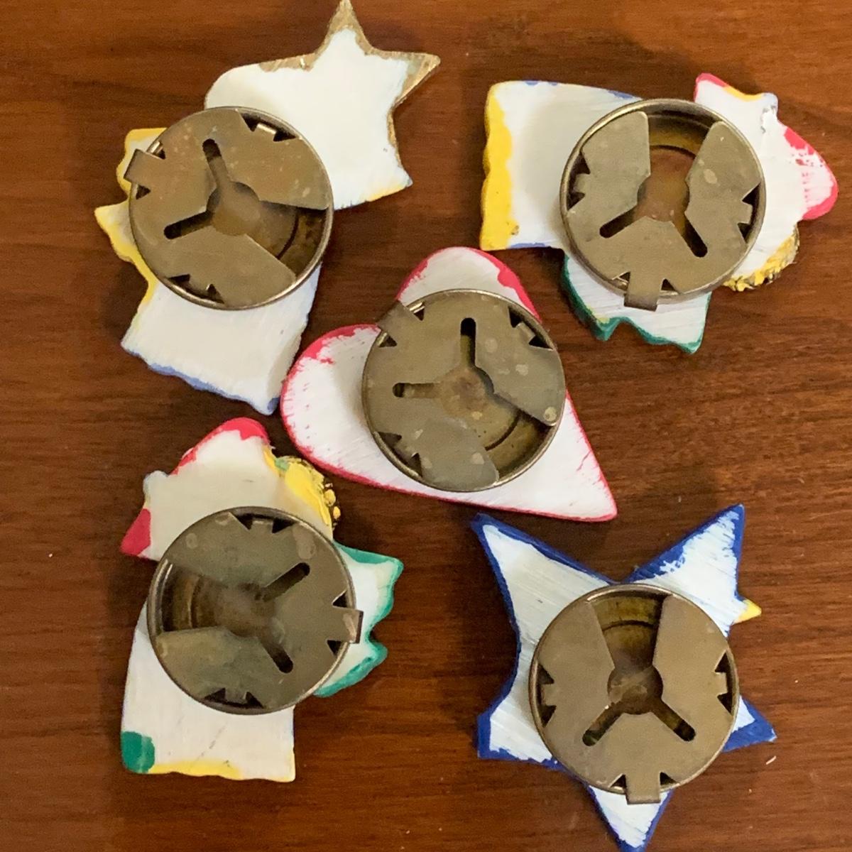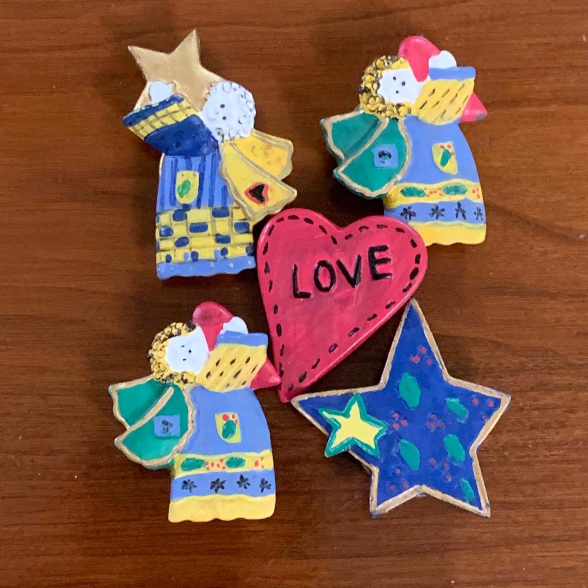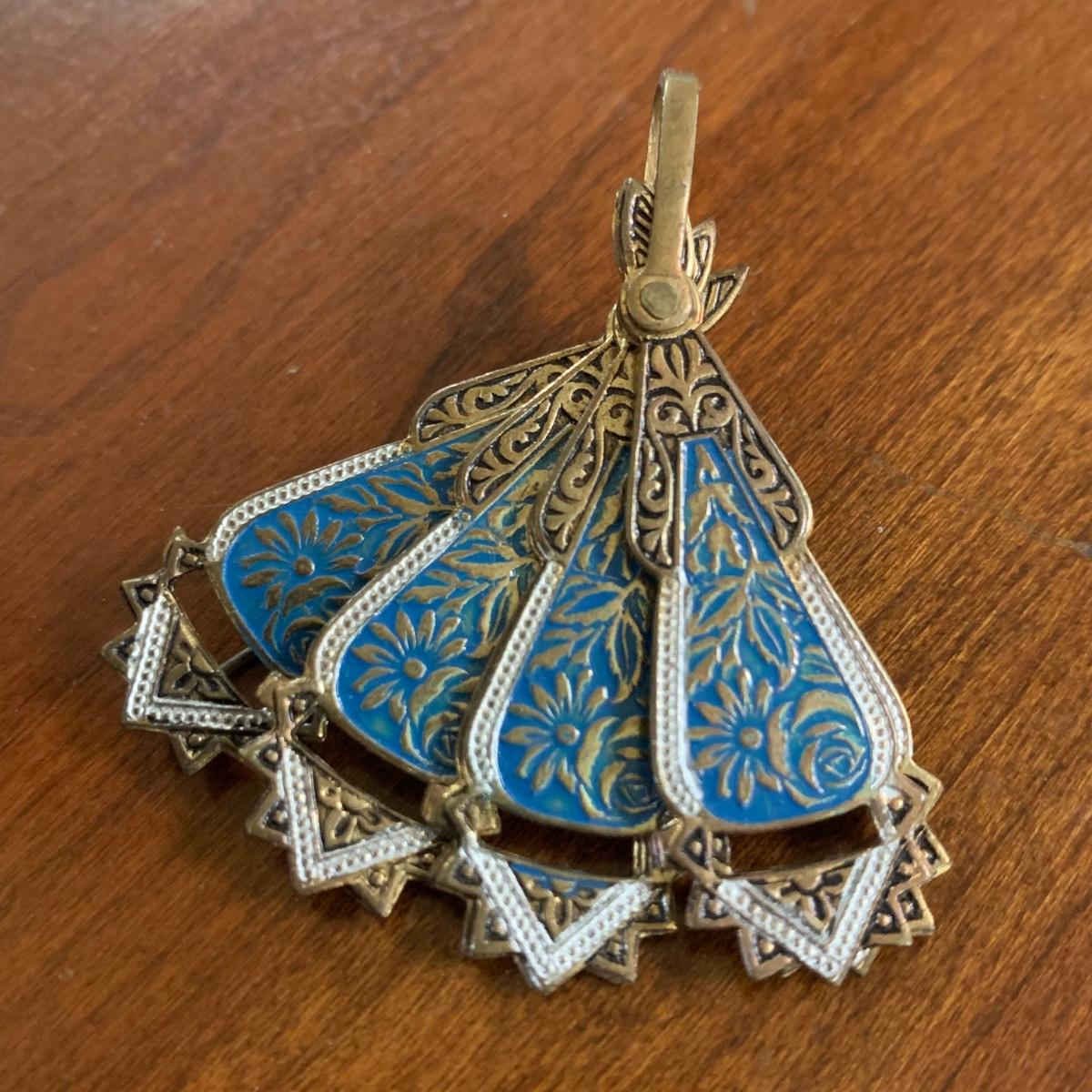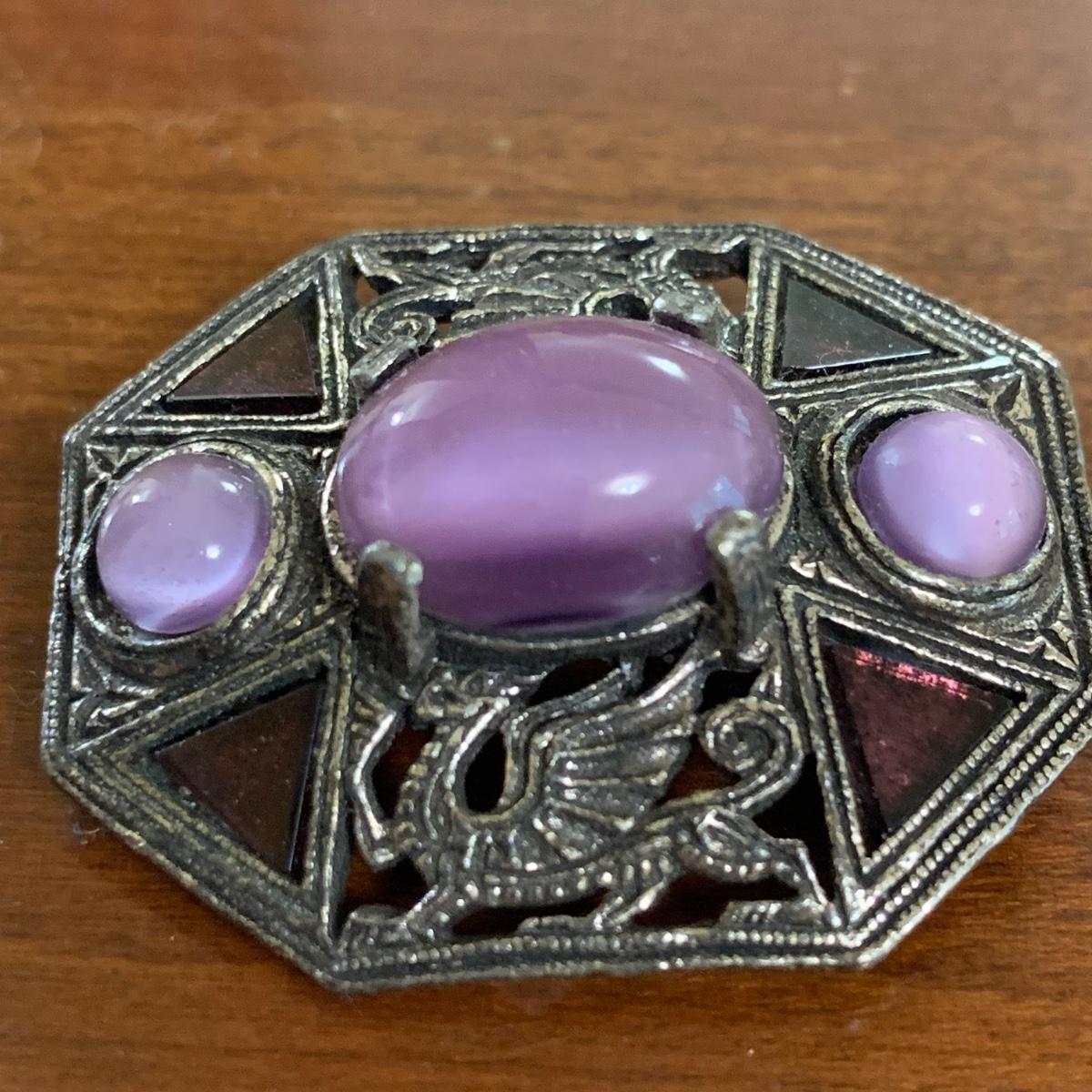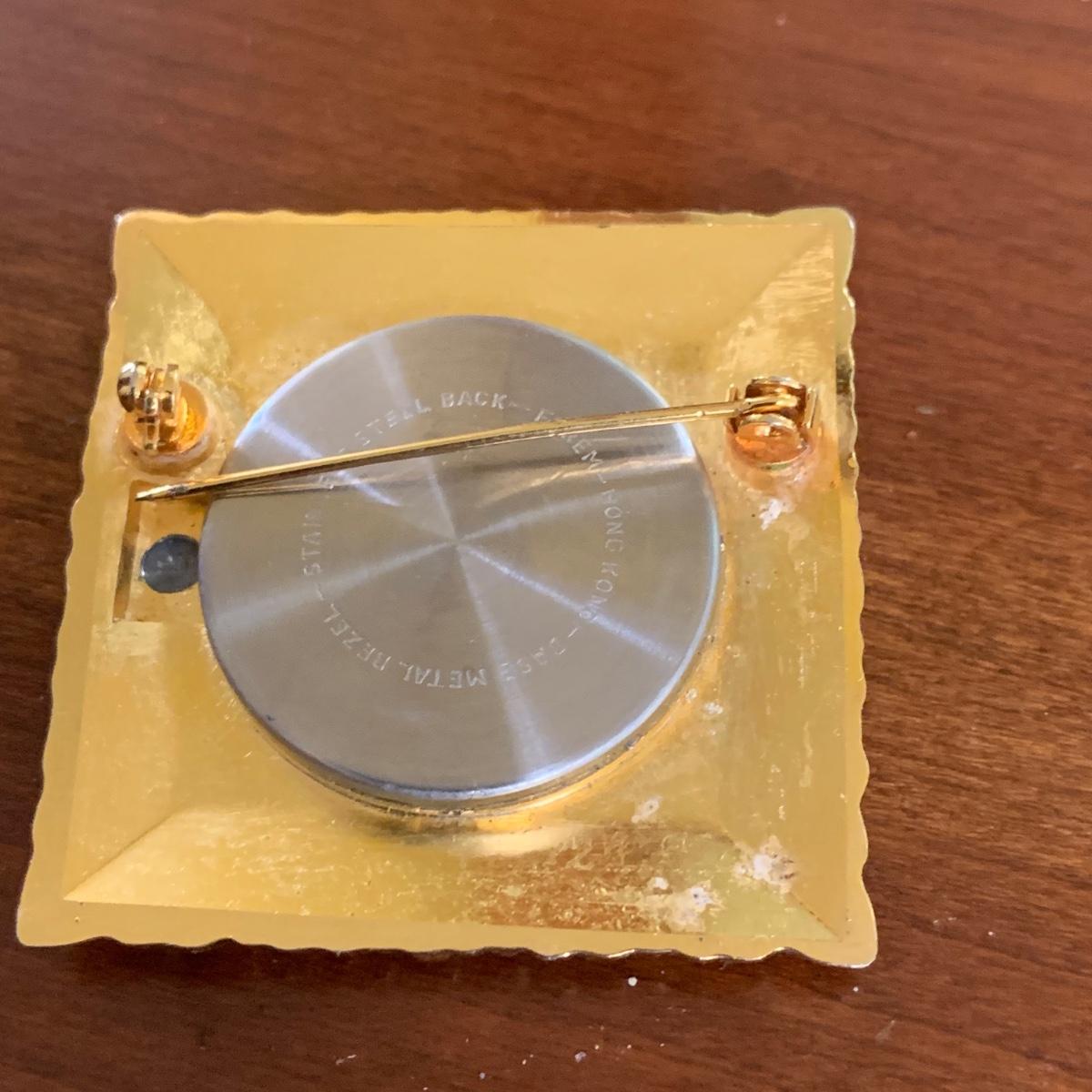 30+ fashion pins plus five button covers. The rose pin is stamped “Danecraft Sterling” and the horse is stamped “Beau Sterling”. The other pins are made of various materials including metal, fabric, clay, and porcelain. The dove pin is marked “Lenox”. The bow shaped pin with the pearlescent bead in the center is marked “Weiss”. There is also one Trifari, one Miracle, one Monet, and two marked Spain. The largest pin is the felt red poinsettia which is about 3”d.
