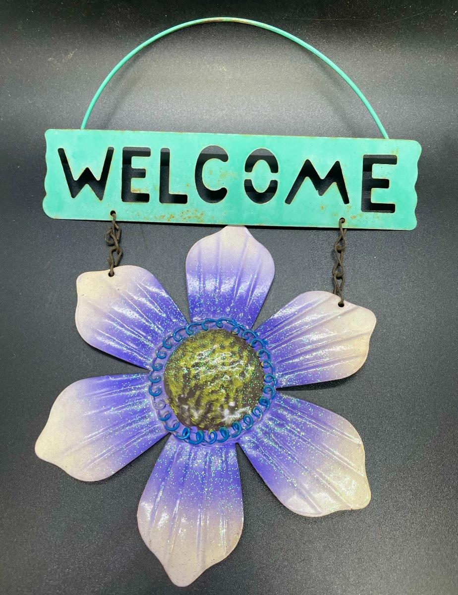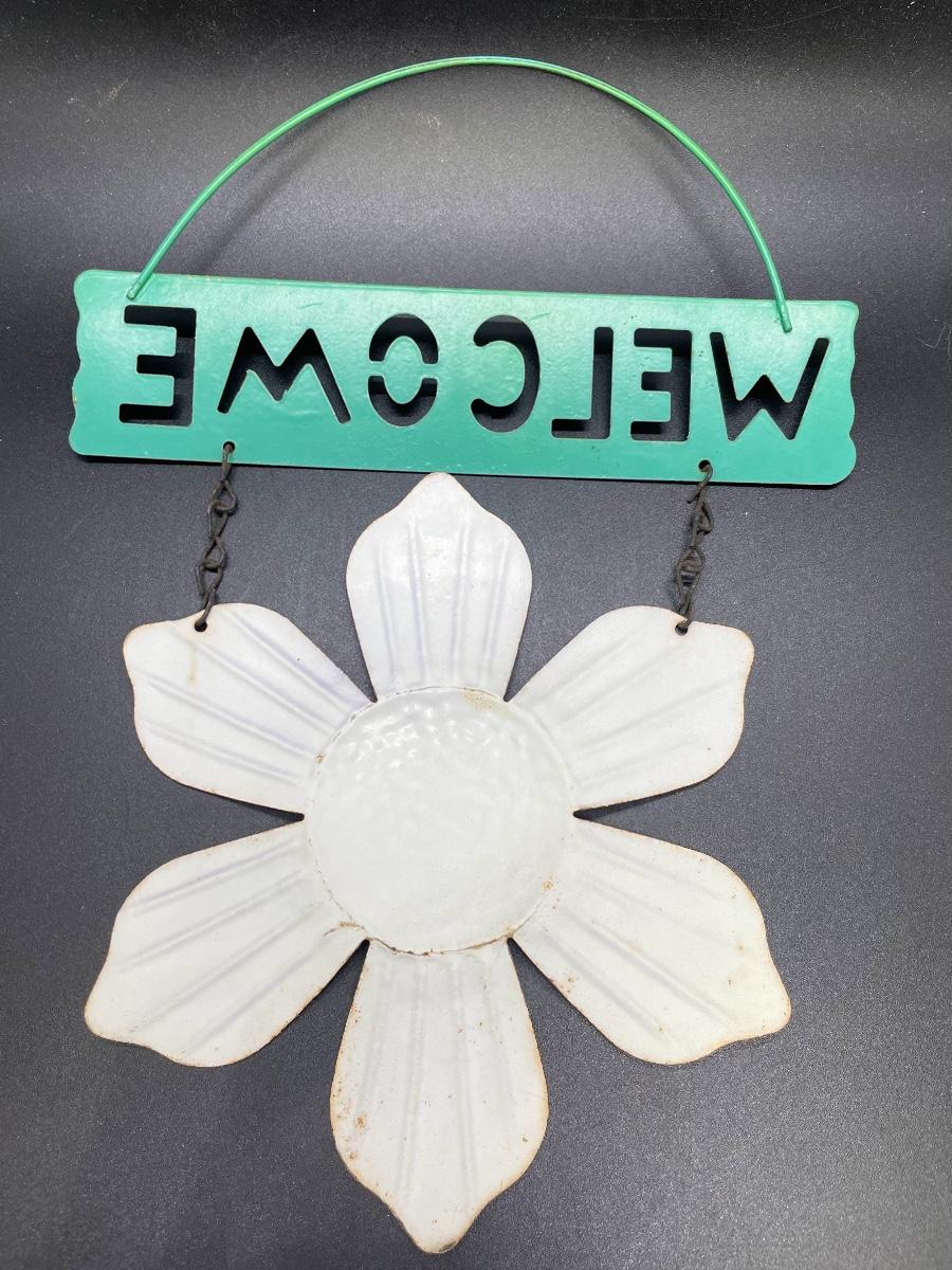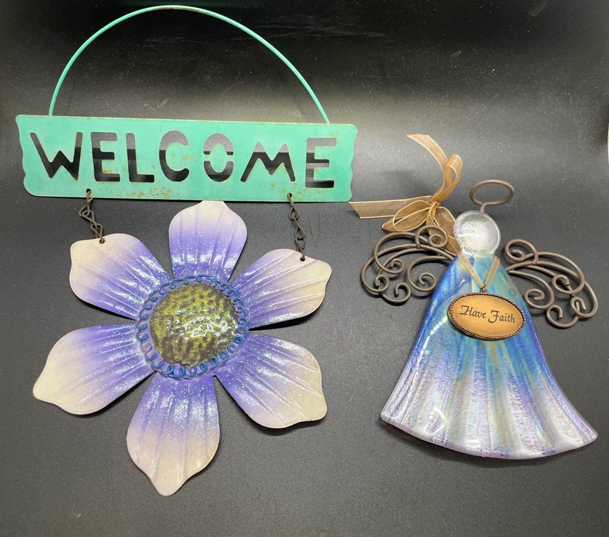 Painted Metal Welcome Flower and Angel Set of Two Hanging Signs