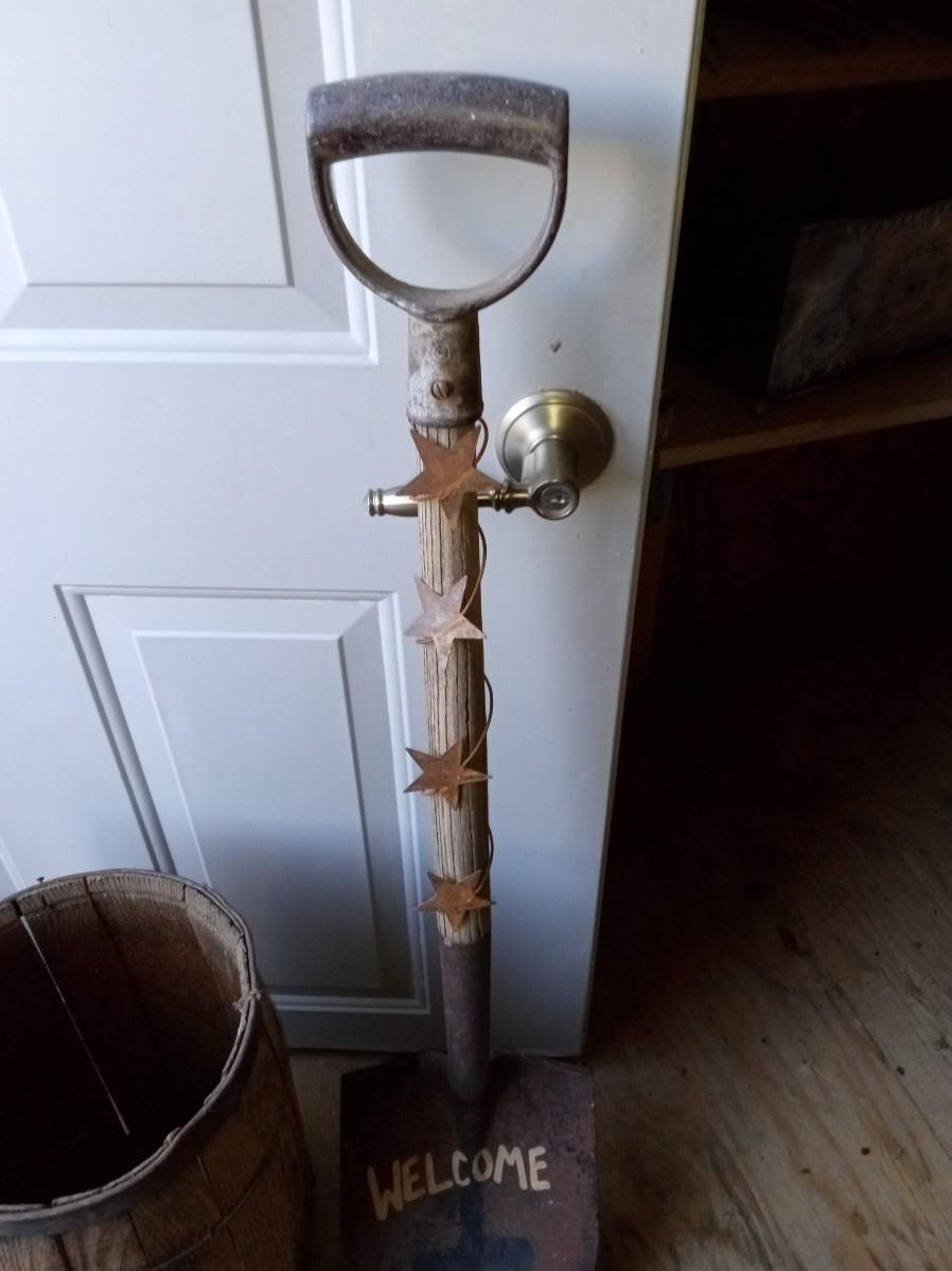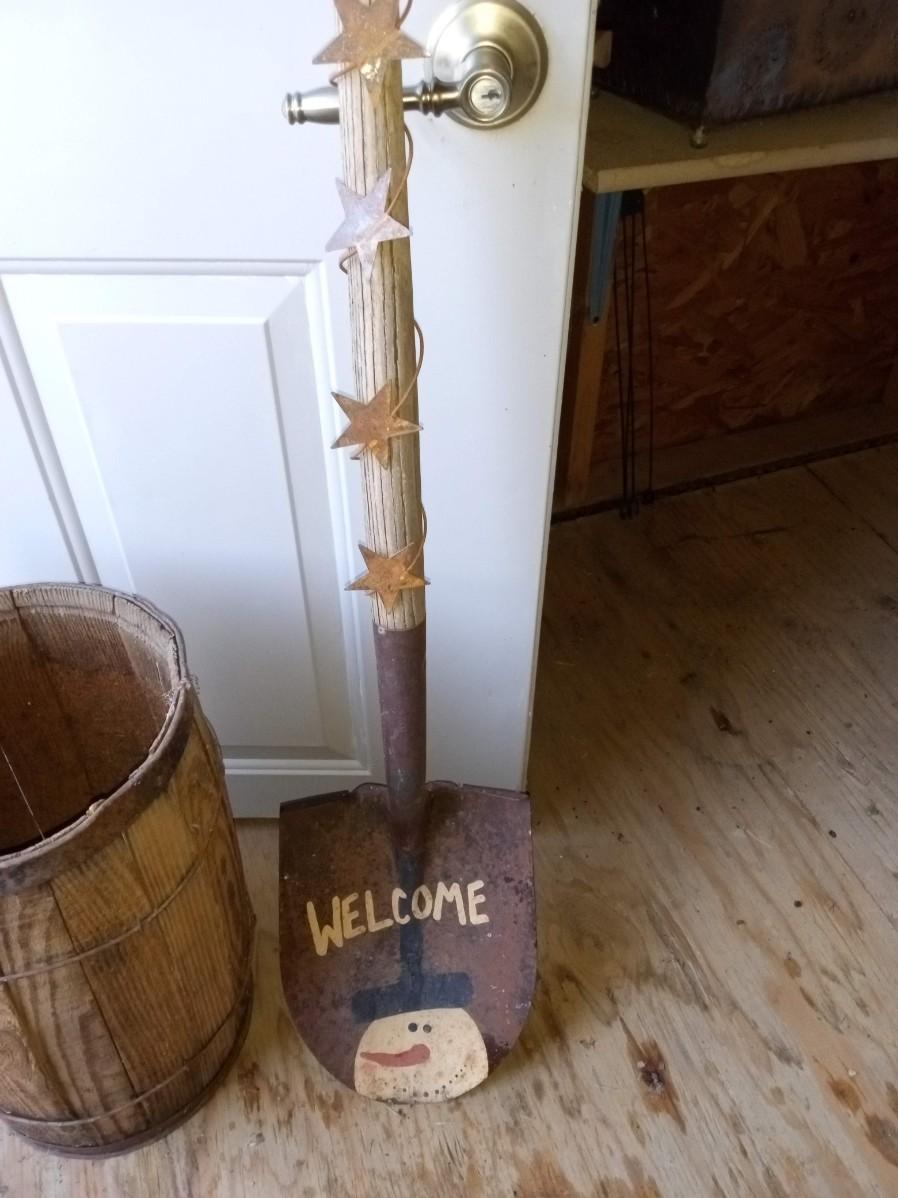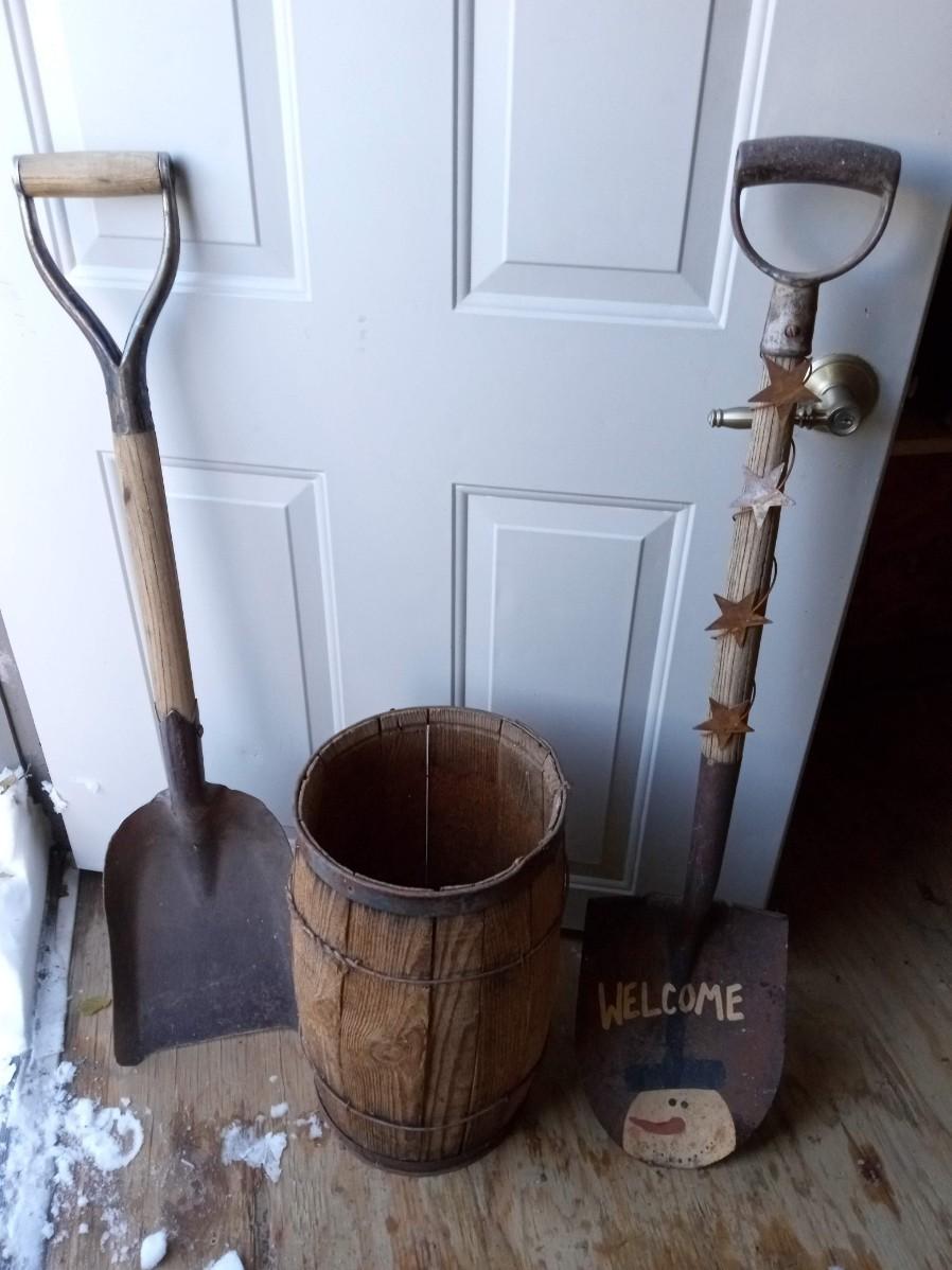 WELCOME SHOVEL, SMALL WHISKEY BARREL AND SQUARE SHOVEL