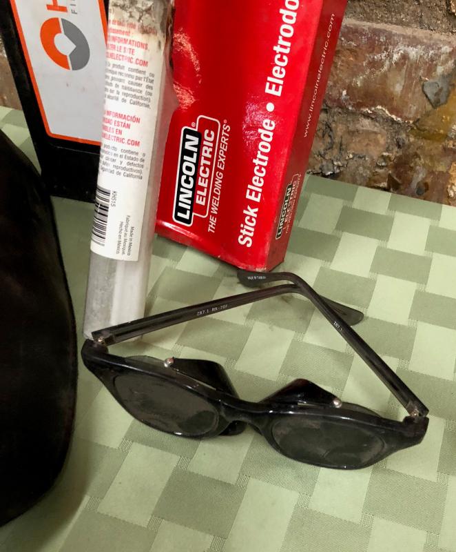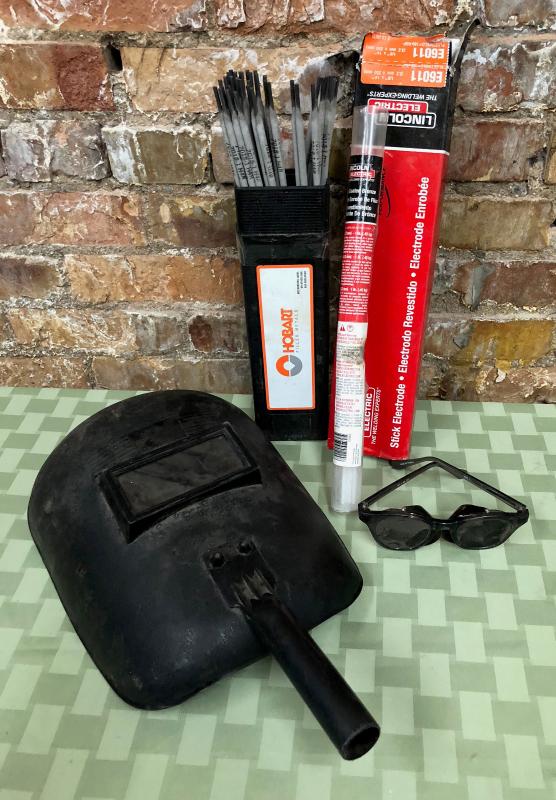New and lightly used welding equipment in this lot...rods..mask...glasses...