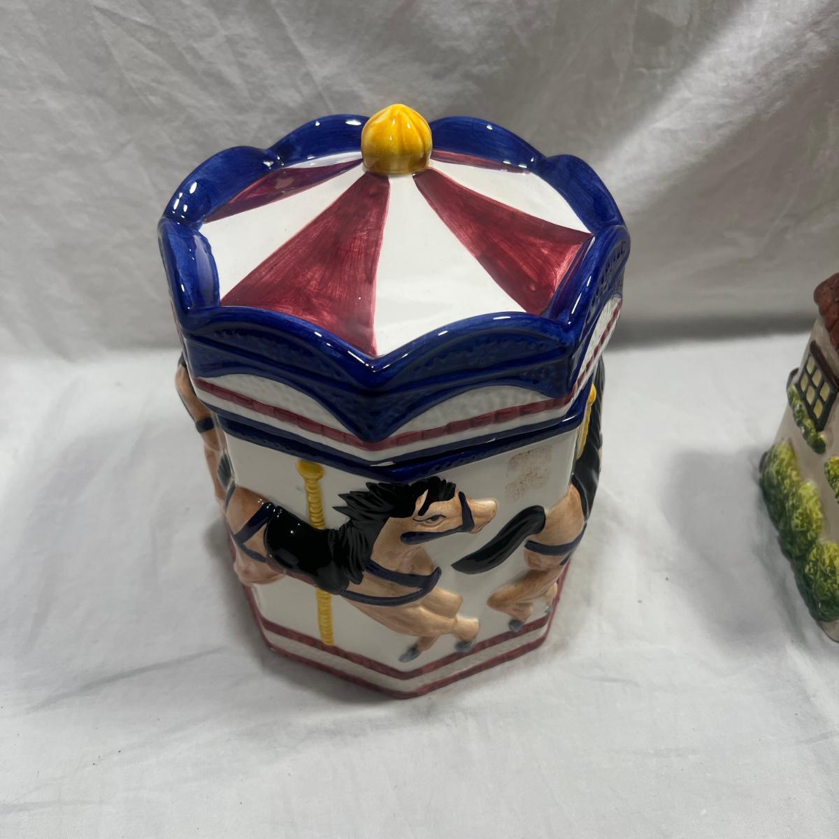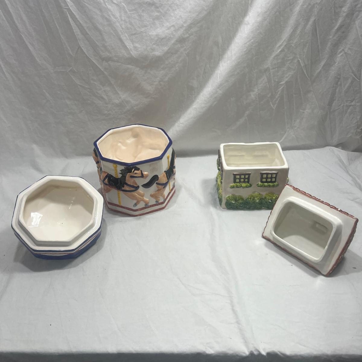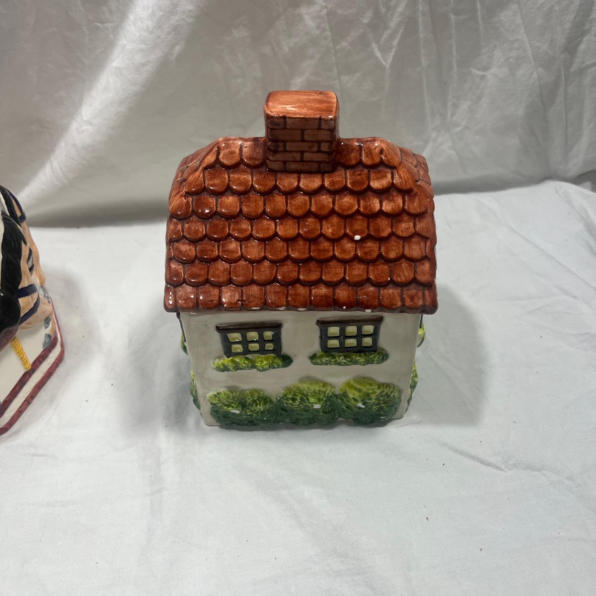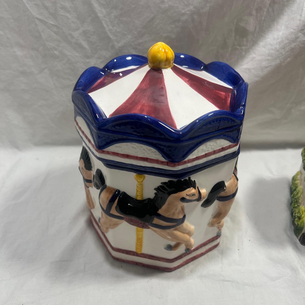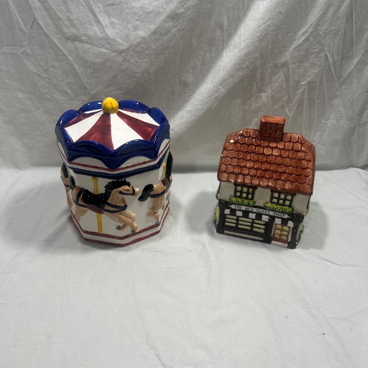 Well Loved Cookie jars; carousel cookie jar with long crack on the inside and Cookie house, with many dings and chips but could easily be touched up with paint.